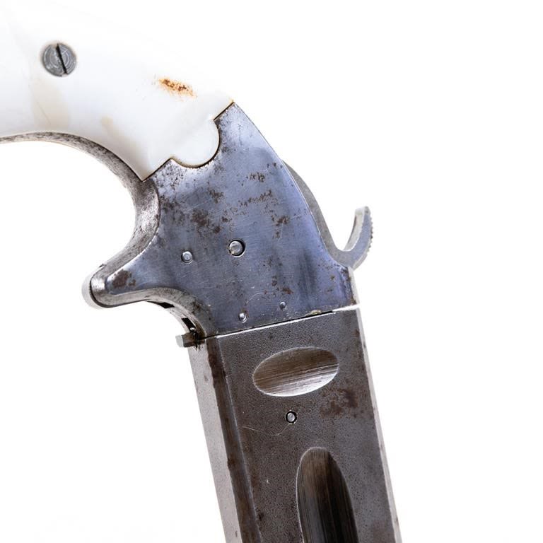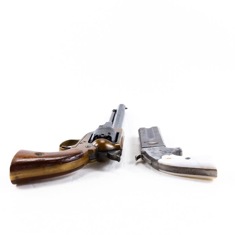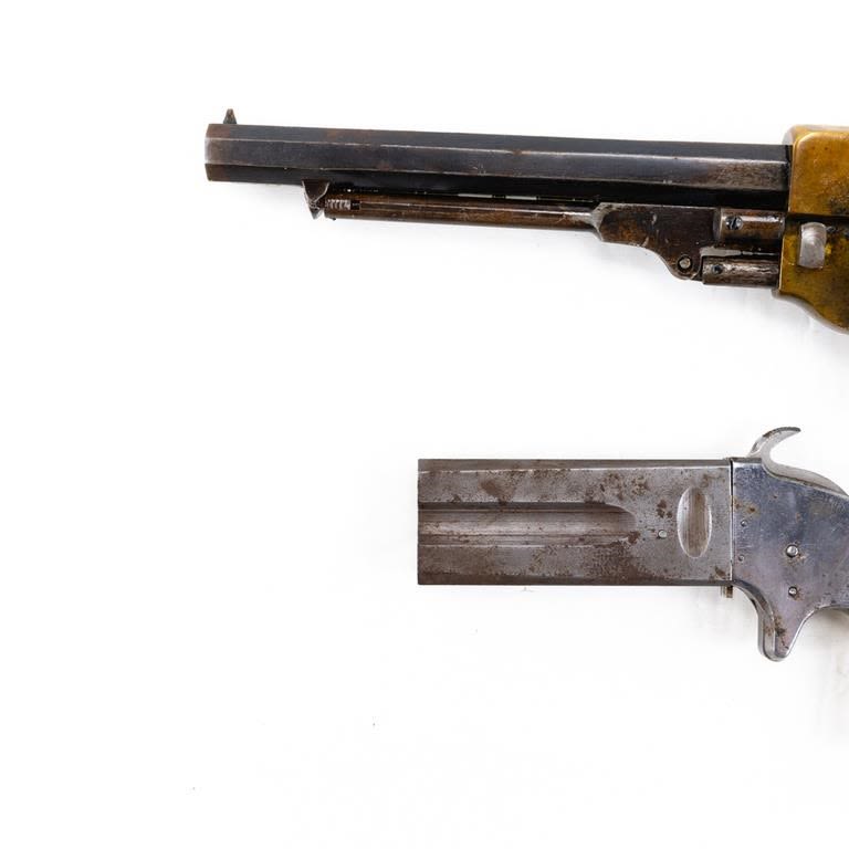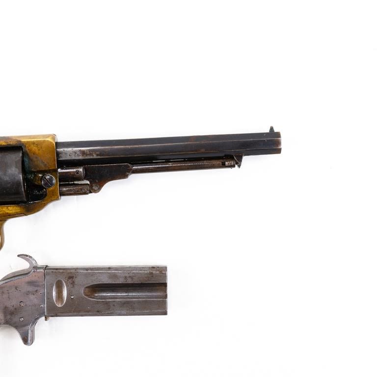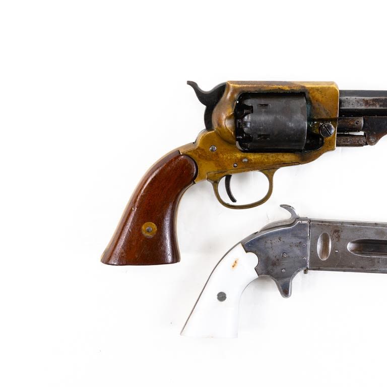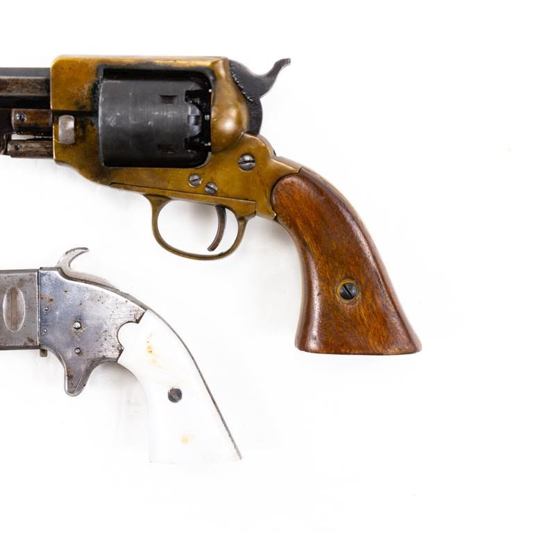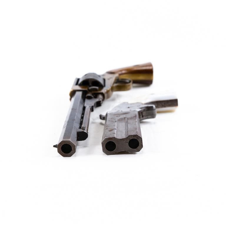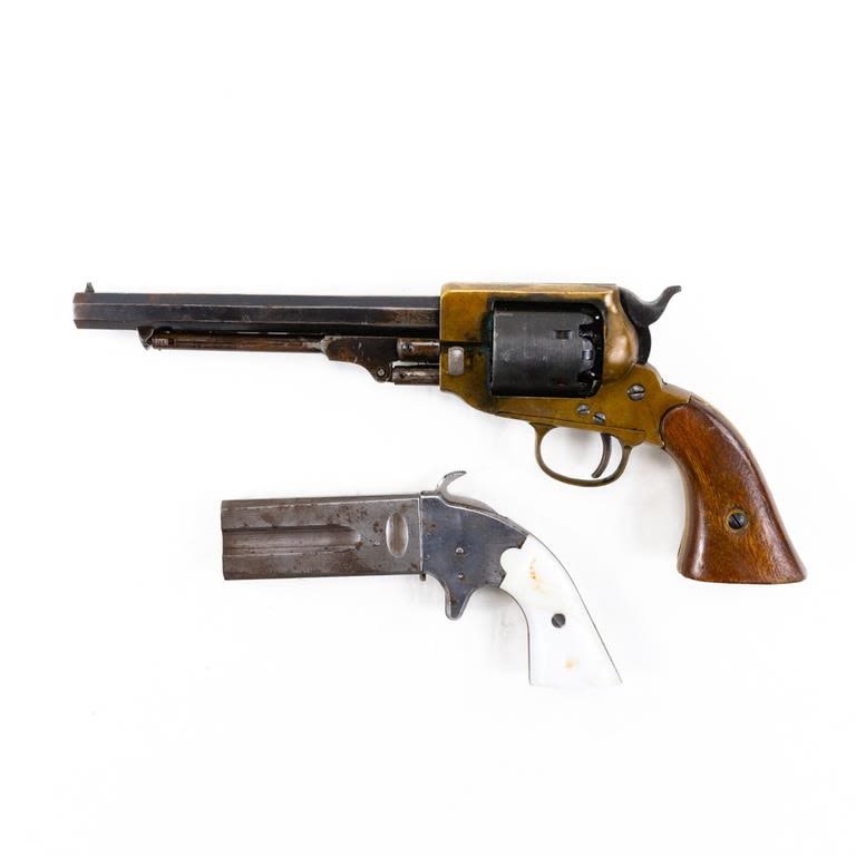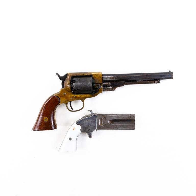 Italian reproduction black powder pistols. 1 civil war Spiller and Burr Revolver reproduction. Revolver is locked up but could be fixed by disassembling and cleaning. fair condition. 1 over under derringer with flipping barrel also in fair condition. Neat display items or fix them up and shoot them. Note must ship to FFL as Illinois considers black powder weapons to be firearms. Sorry.