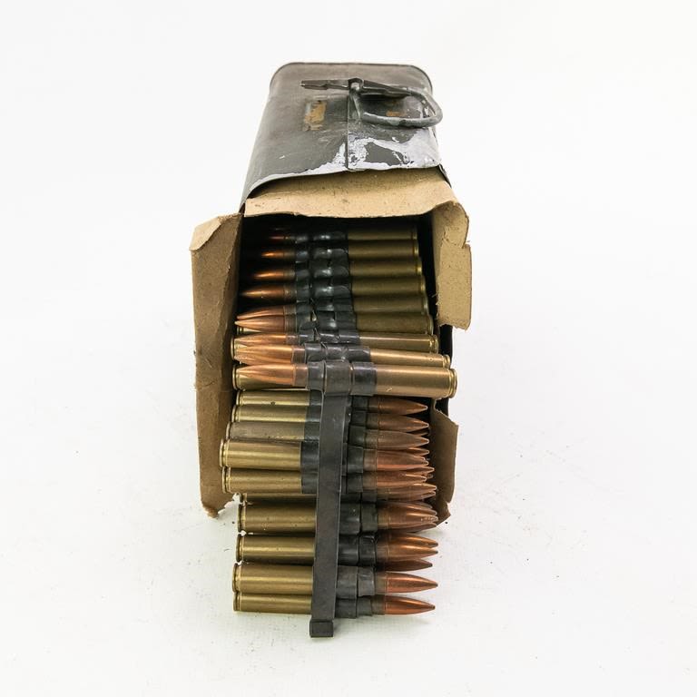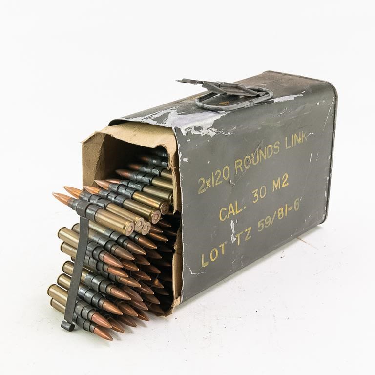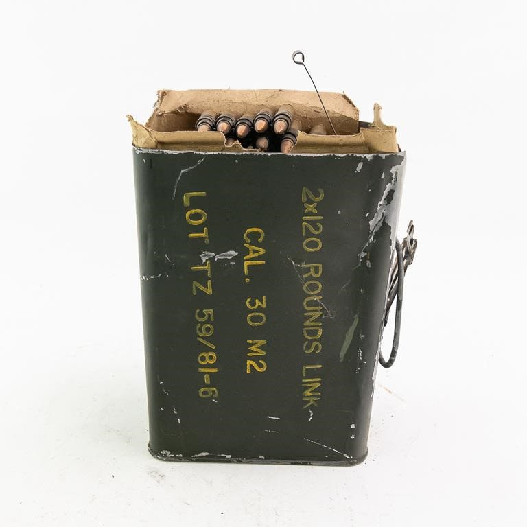 2x12rds Linked Cal .30 M2 Ammunition. Can has been opened LINKED AMMO IS CONSIDERED A HIGH CAPACITY FEEDING DEVICE AND CANNOT BE DELIVERED TO CA, CT, CO, HI, MA, MD, NJ, NY, CANNOT SELL TO ILLINOIS RESIDENTS!!