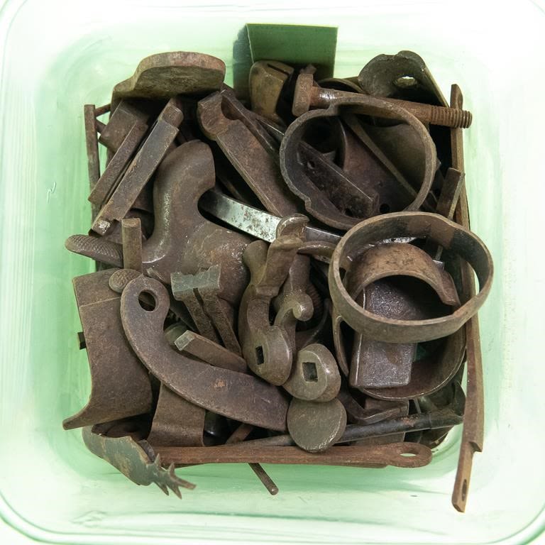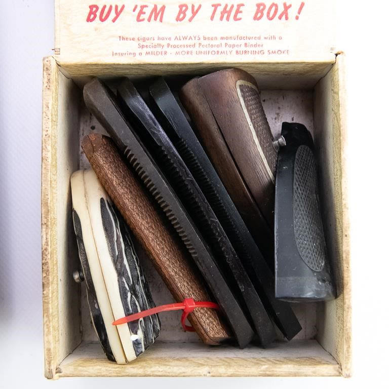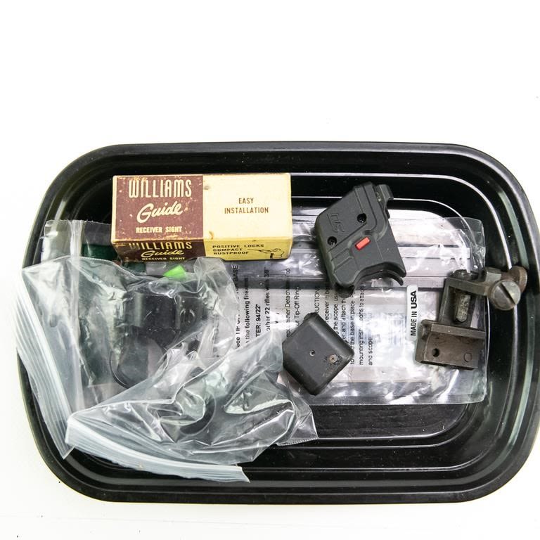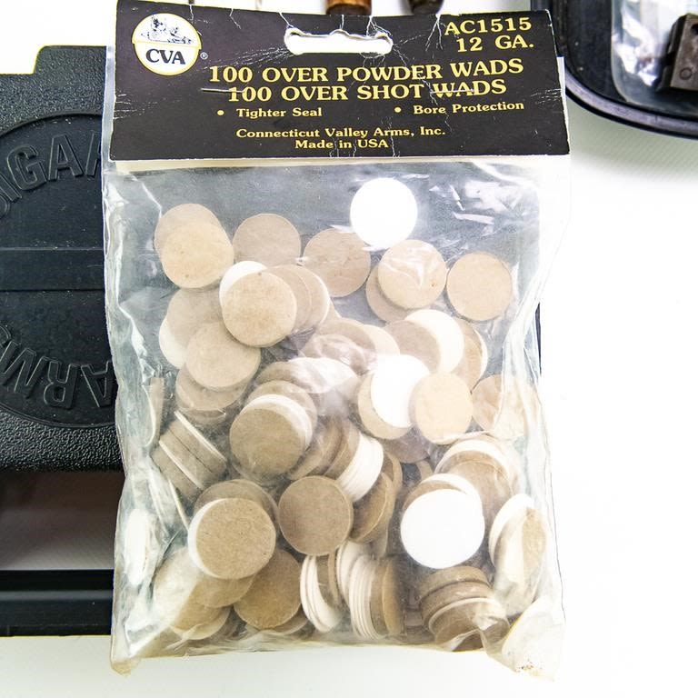 3sets of revolver grips and 3x longarm butt plates, SEVERAL black powder firearm parts, 2x firearm lasers, gun sights and scope rings, extended SigSauer 9mm magazine, wads, Miscellaneous muzzle loading items/