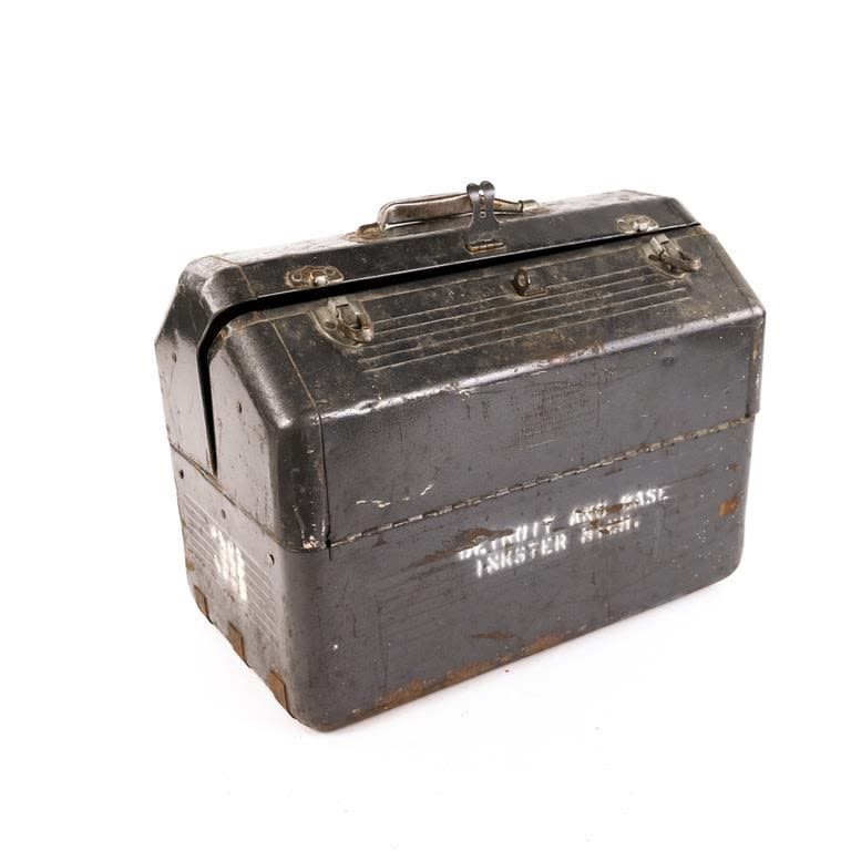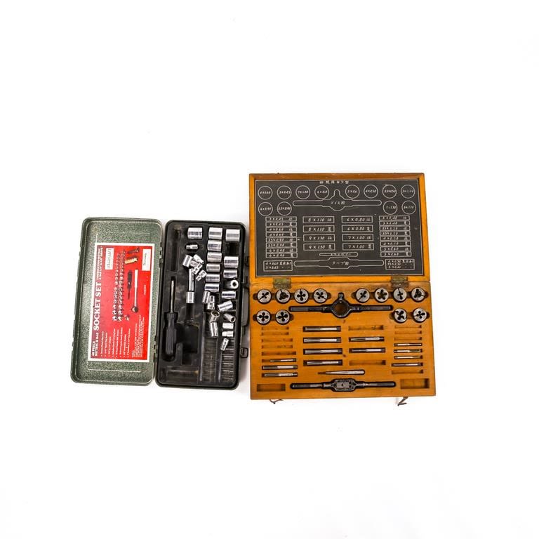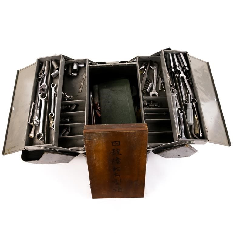 Steel Tool Box Filled with Tools: Several Wrenches, ratchets, sockets and a tap and die set in a wooden “Japanese” case. Snap-On, Craftsman, Bonney etc.