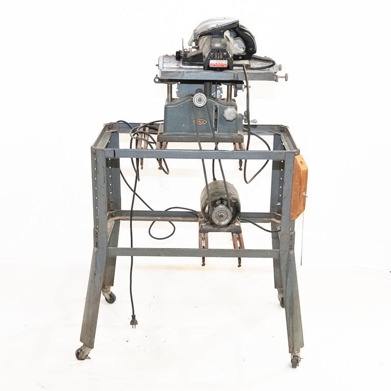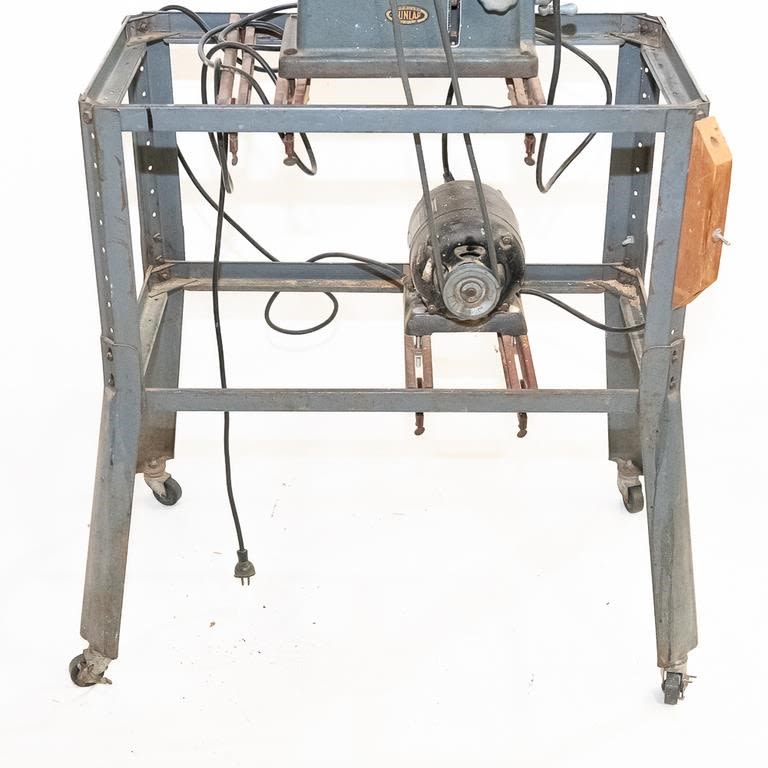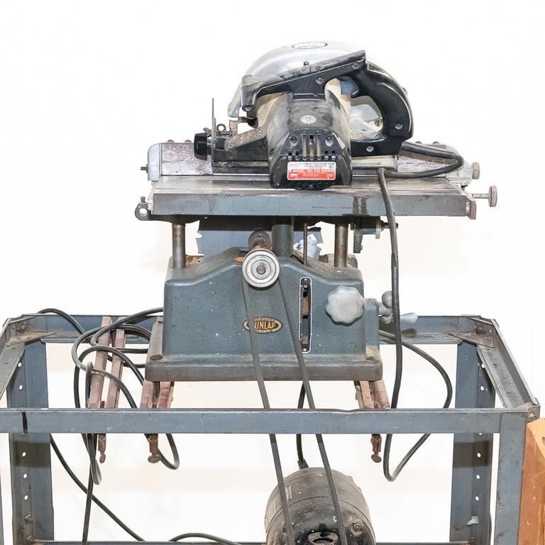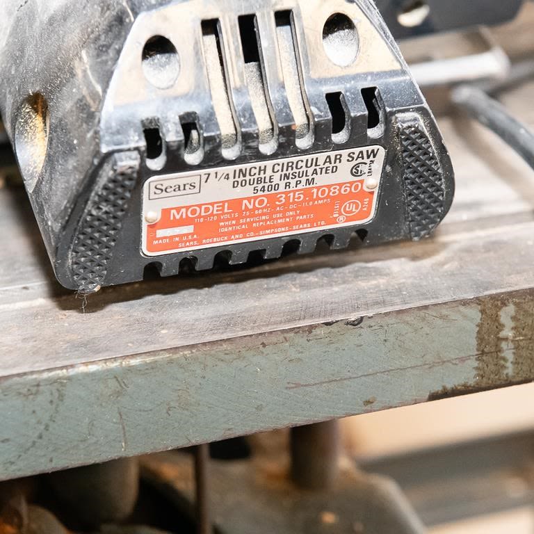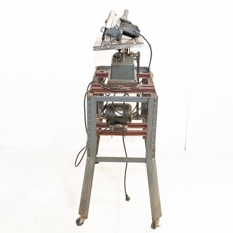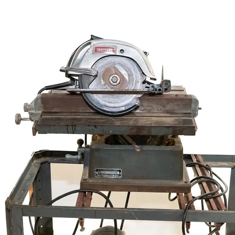 Vintage 1950-60s Sears table saw. Very heavy steel construction. Belt driven from motor mounted on roller frame below. Lot also includes newer Sears circular saw. Used for cutting stock blanks but perfect for home workshop. See Photos.
