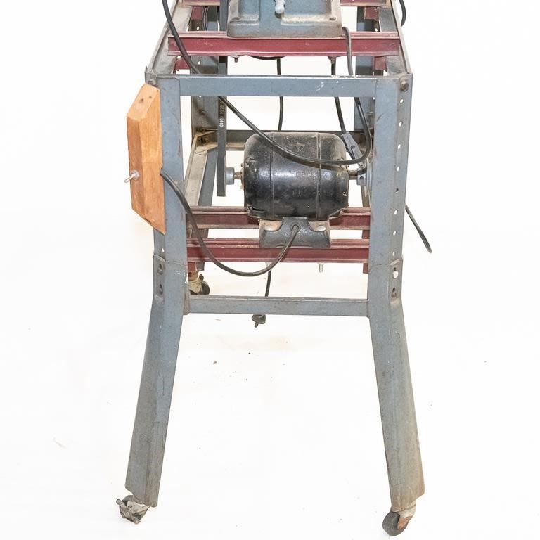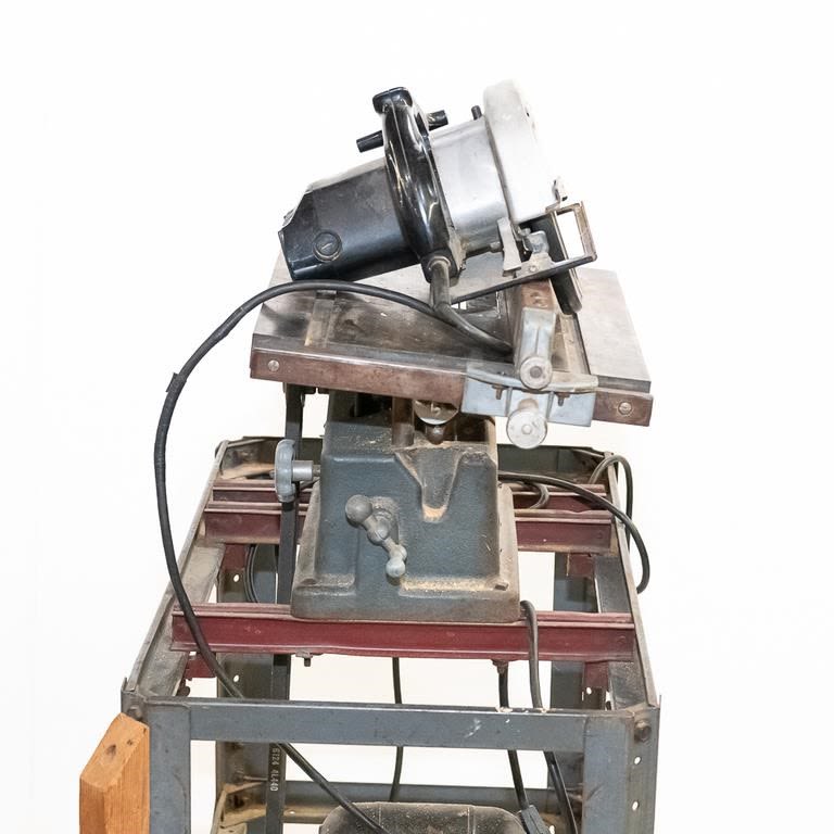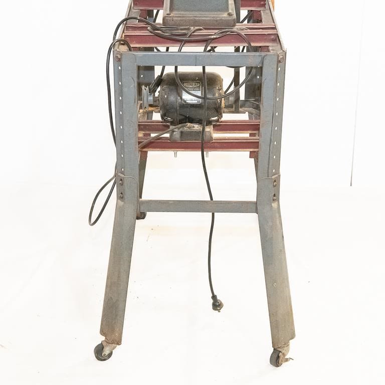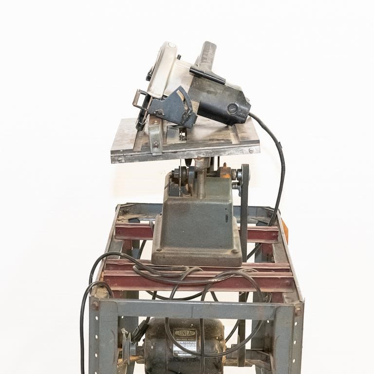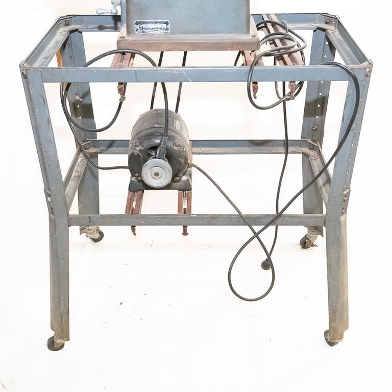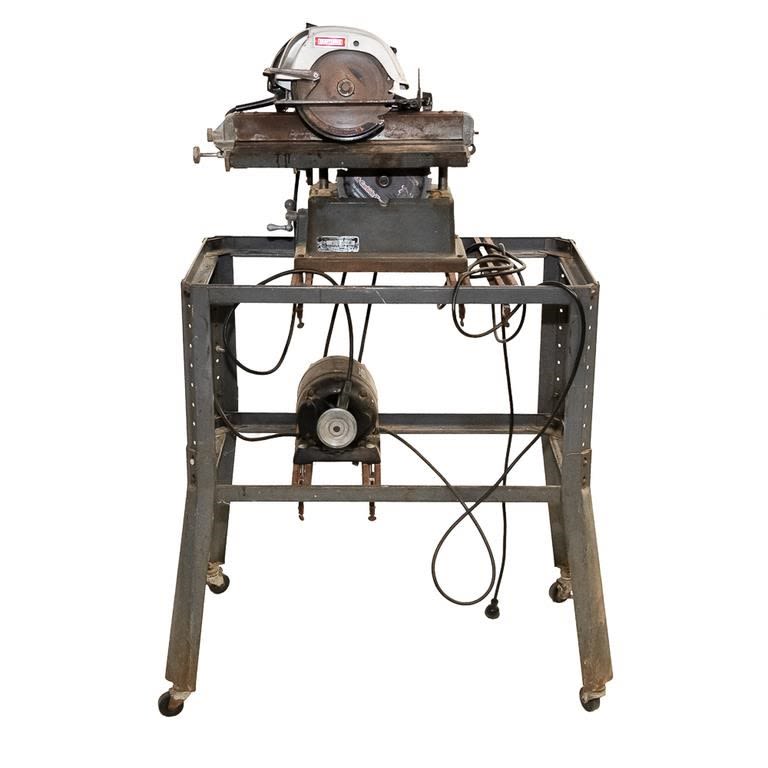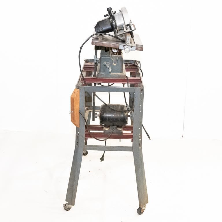 Vintage 1950-60s Sears table saw. Very heavy steel construction. Belt driven from motor mounted on roller frame below. Lot also includes newer Sears circular saw. Used for cutting stock blanks but perfect for home workshop. See Photos.