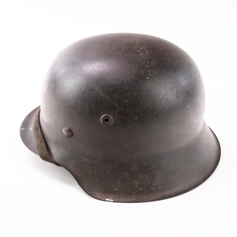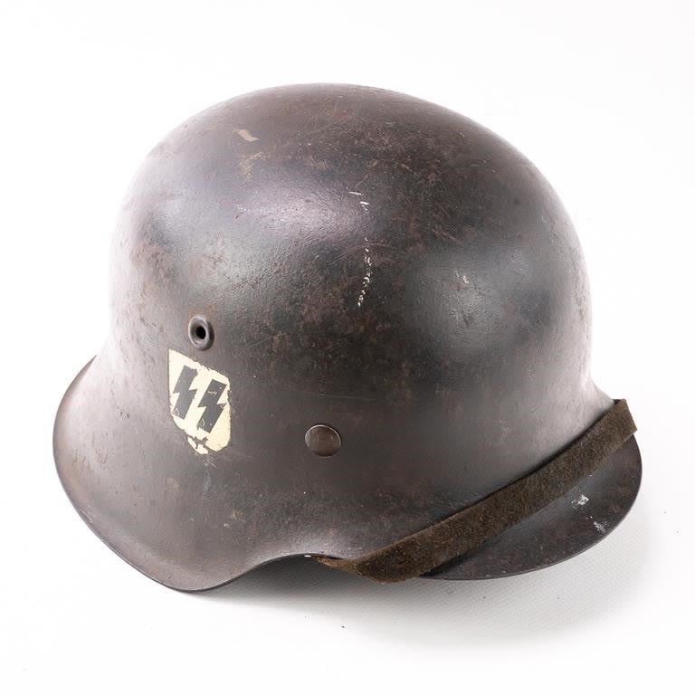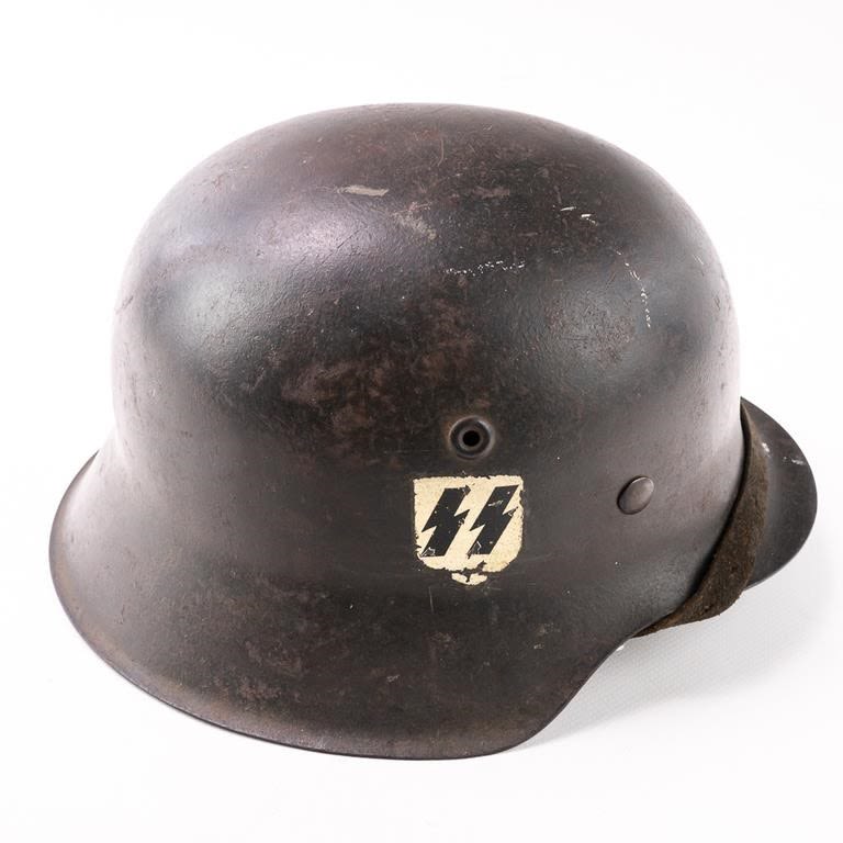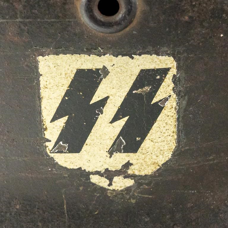 This Waffen SS M42 helmet with a single SS decal on the right side. We have provided good photos of decal. Please review carefully. Helmet is complete with liner and chin strap. Helmet is marked “NS64″ and D354” on the inside of the helmet rim. Liner has a faded size marking and is also marked “KE”. Helmet is good condition with the decal being 95+% intact. Must see photos.