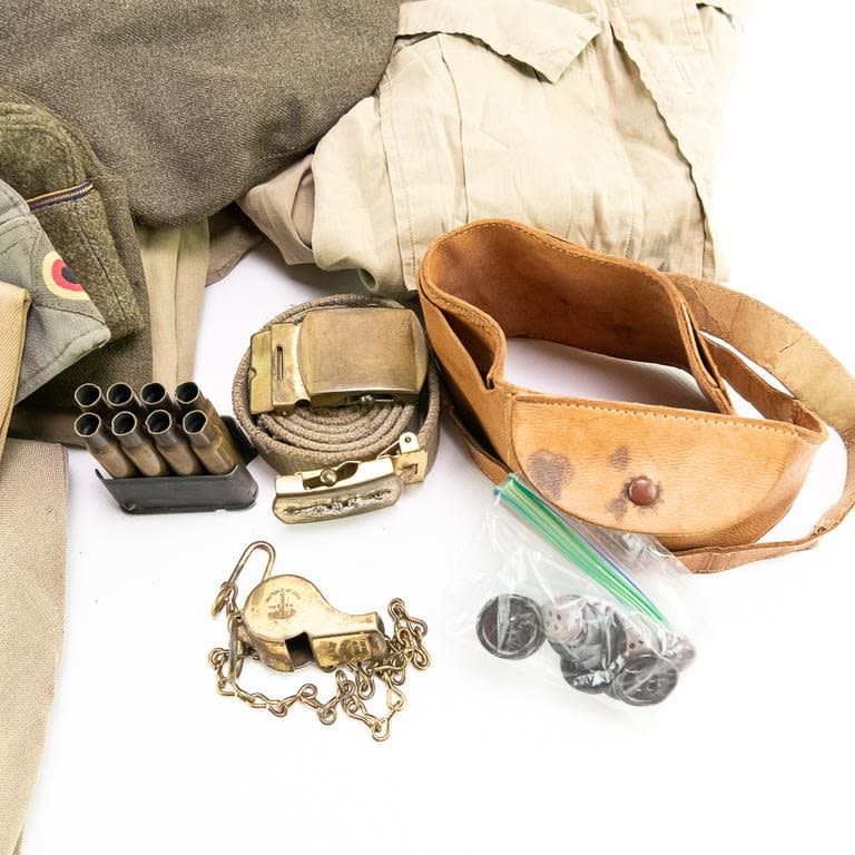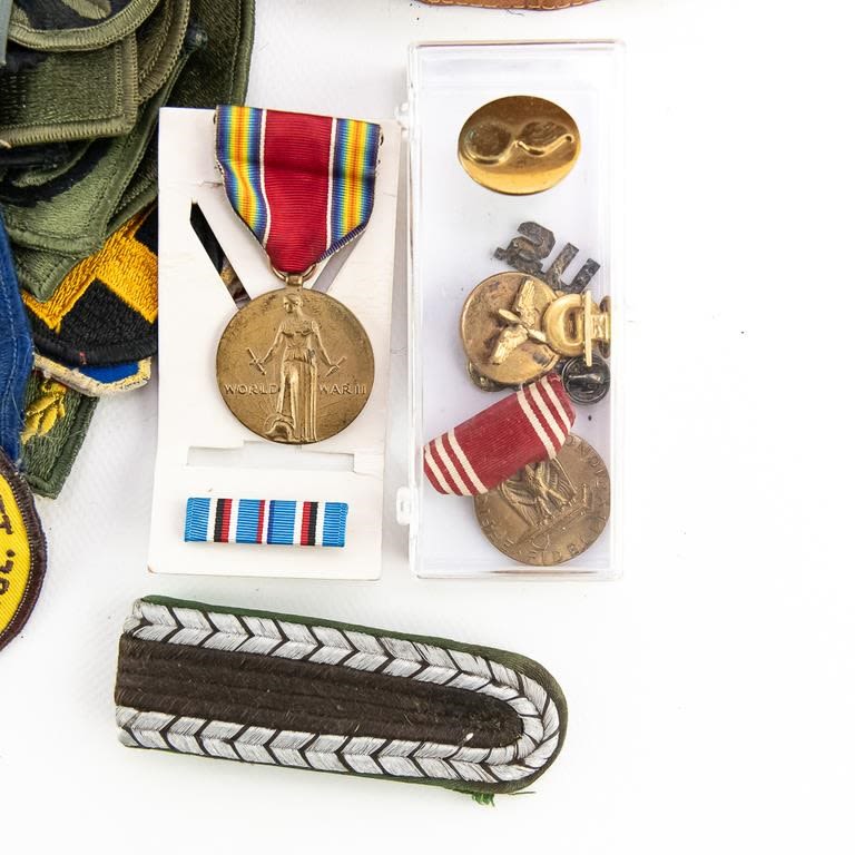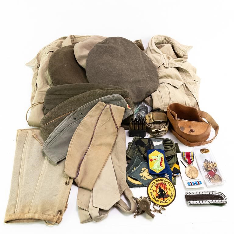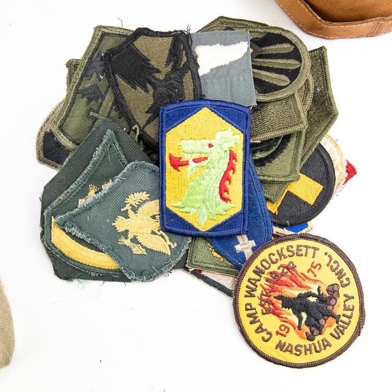 Mixed lot of assorted uniform pieces and insignia, includes large lot of patches and rare British made Acme Thunderer Whistle. All are 1940s-50s vintage. Condition ranges from fair to excellent – good reseller lot. See Photos.