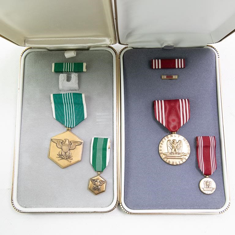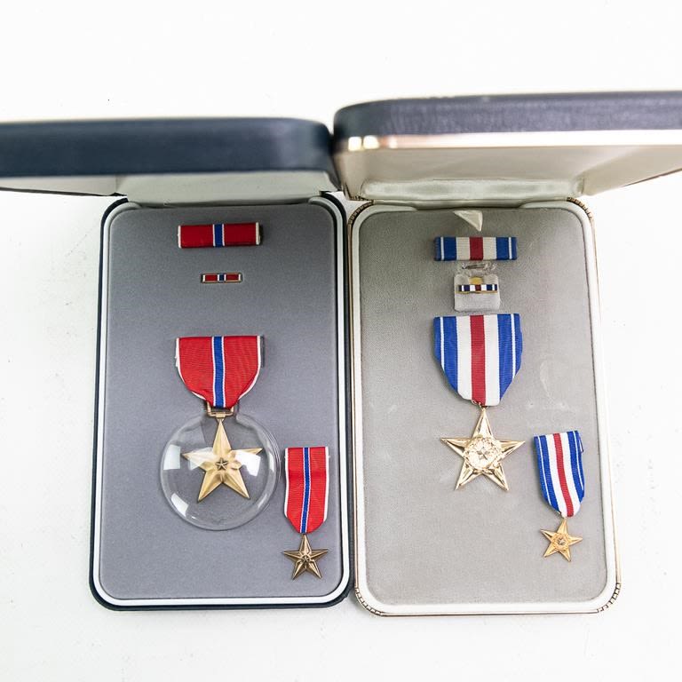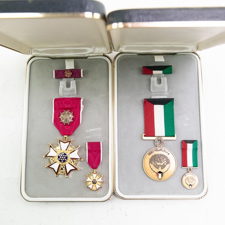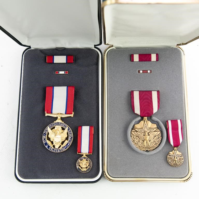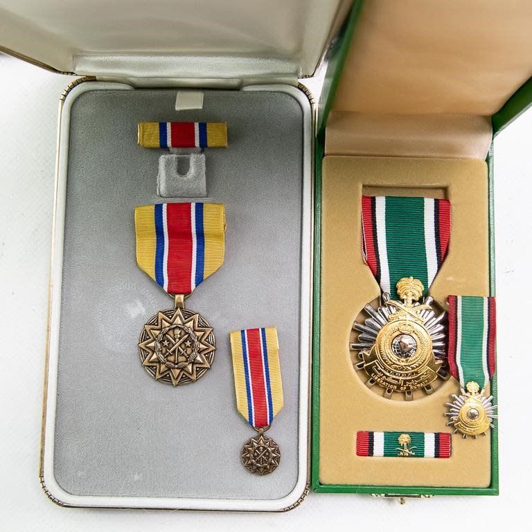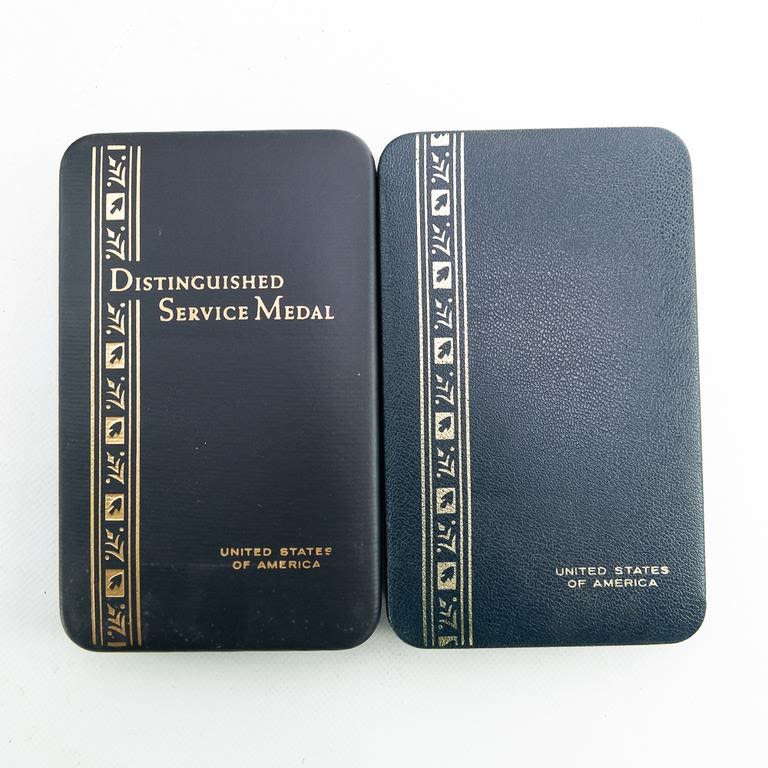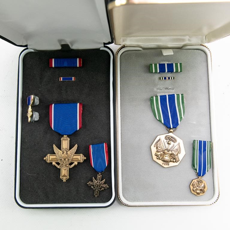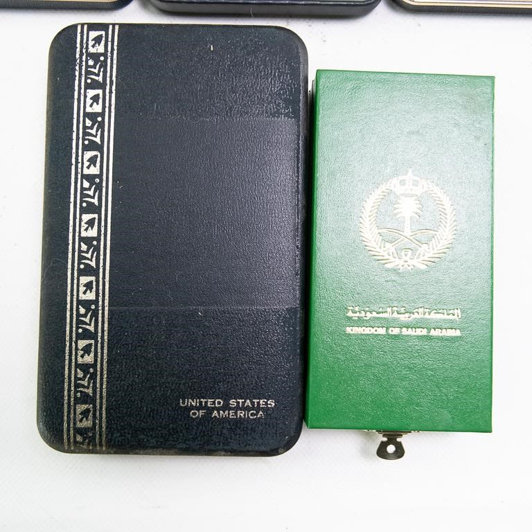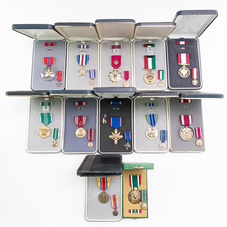 This lot of modern era 12 cased medals includes the Distinguished Service Cross, Distinguished Service Medal, Silver Star, Legion of Merit, Vietnamese awards, Defense Distinguished Service Medal, Saudi Arabia and Kuwait liberation medals and much more. Many have miniatures medals, lapel pins and ribbon bars. Cases show storage age and some water damage. Good lot for a wide selection of US medals and Gulf War awards.