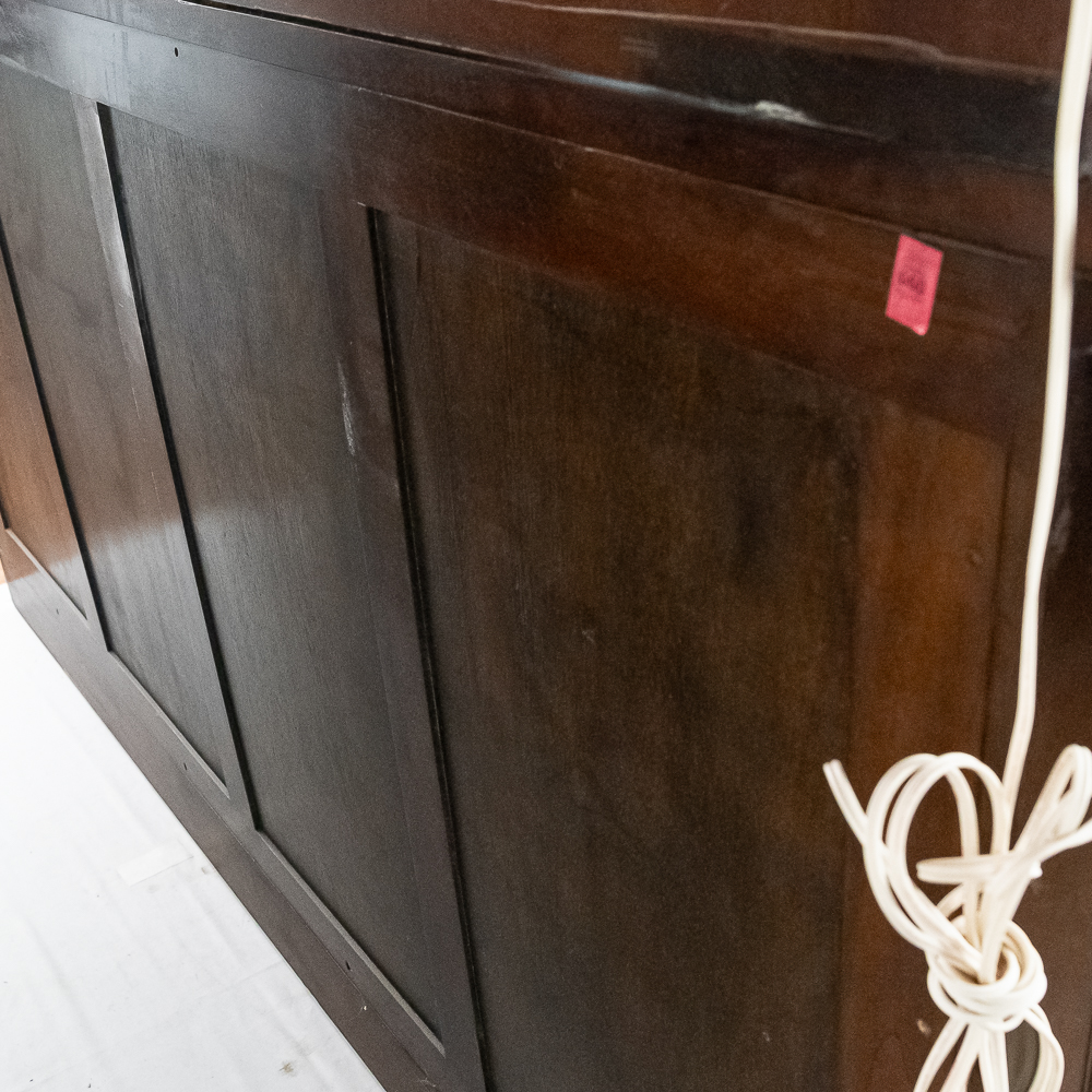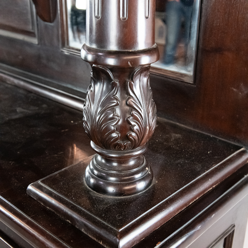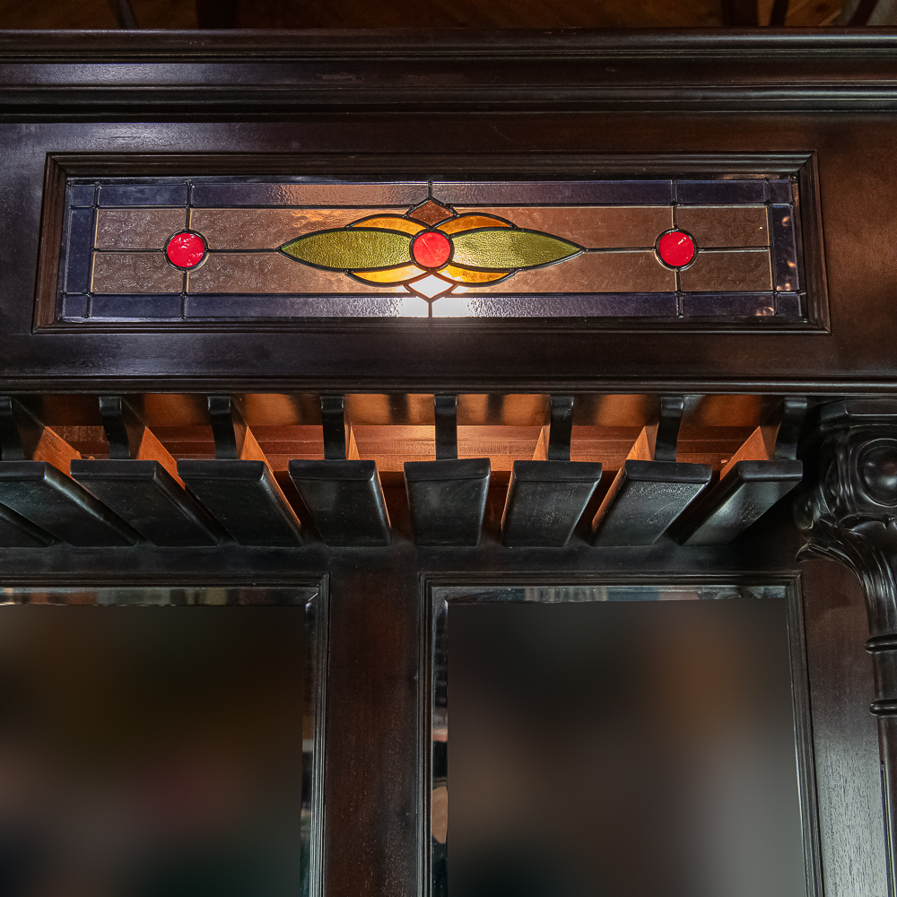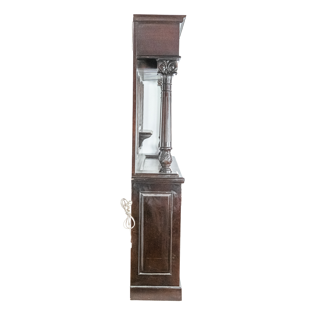 Well made contemporary 2 piece back bar for home or business. All wood with mahogany finish features a 4 drawer base with open storage beneath the drawers. Heavy duty drawers have dovetailed corners. Upper section features 2 fluted and carved columns, 3 beveled mirrors, and a cornice with 2 leaded glass panels lit from behind. A slotted wood rack for hanging glasses by the stem is mounted underneath the cornice. In overall VG condition. Measures 7′-10.5″ tall, 80″ wide, 17.5″ deep. Please note this is a back bar only, there is no front bar.