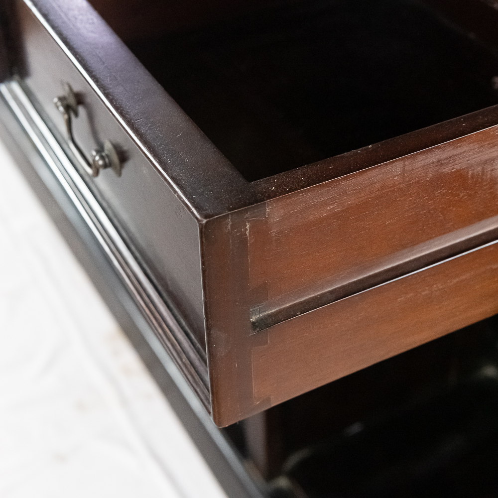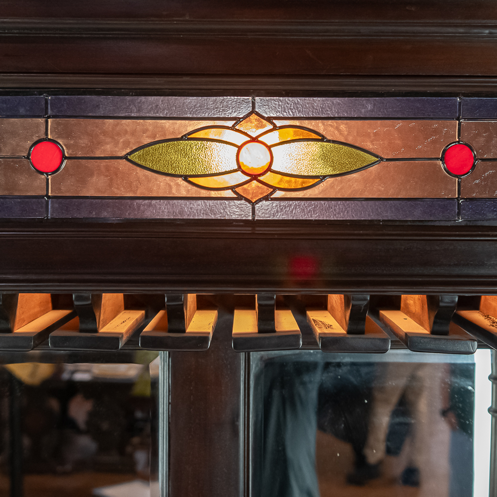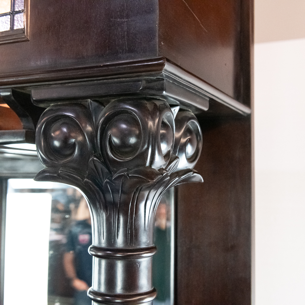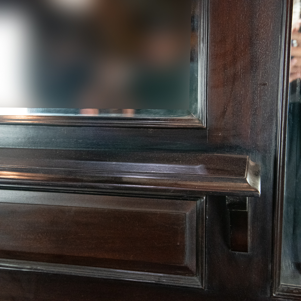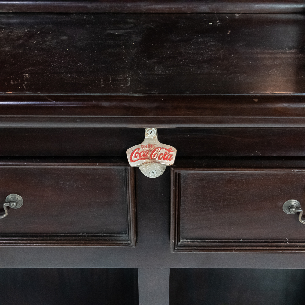 Well made contemporary 2 piece back bar for home or business. All wood with mahogany finish features a 4 drawer base with open storage beneath the drawers. Heavy duty drawers have dovetailed corners. Upper section features 2 fluted and carved columns, 3 beveled mirrors, and a cornice with 2 leaded glass panels lit from behind. A slotted wood rack for hanging glasses by the stem is mounted underneath the cornice. In overall VG condition. Measures 7′-10.5″ tall, 80″ wide, 17.5″ deep. Please note this is a back bar only, there is no front bar.