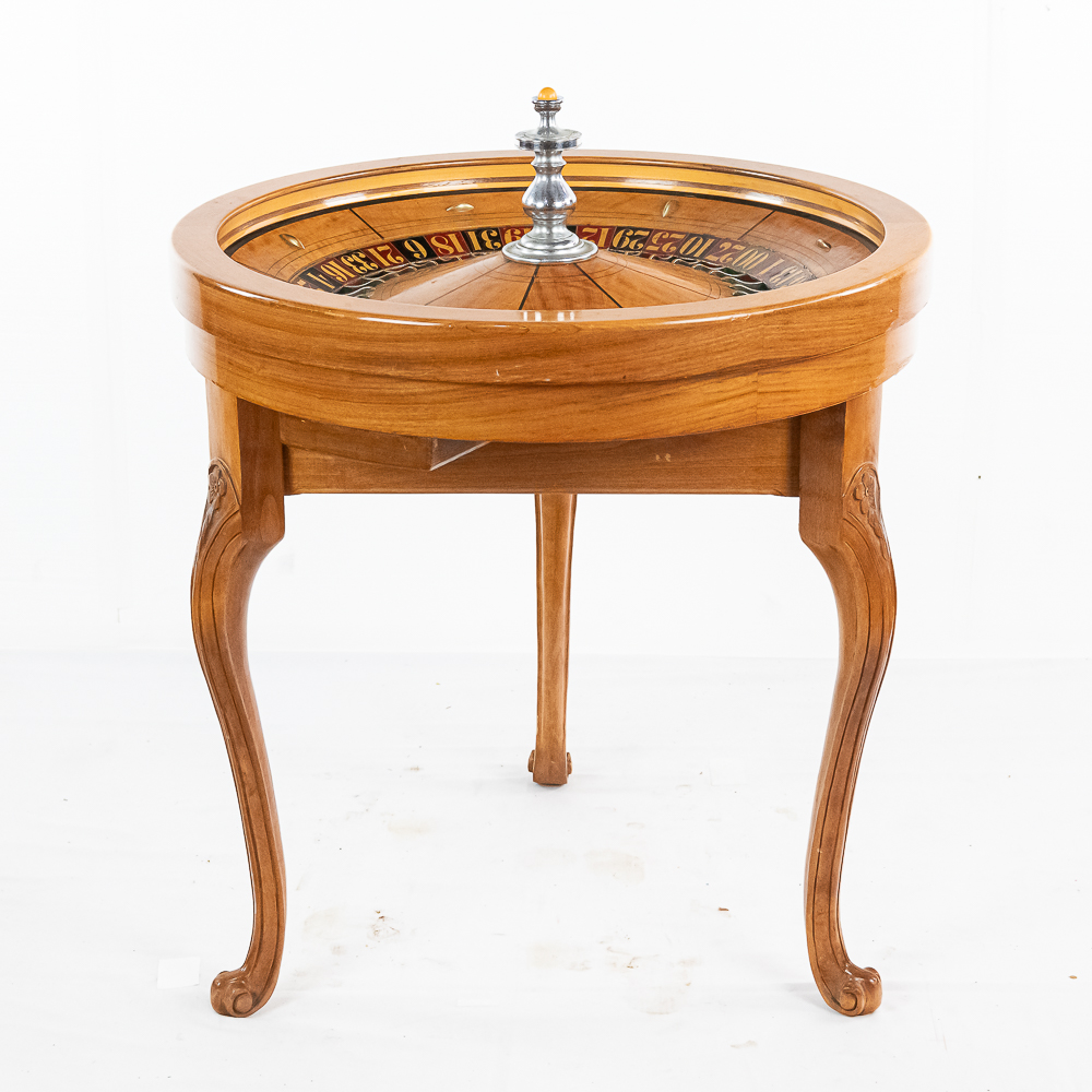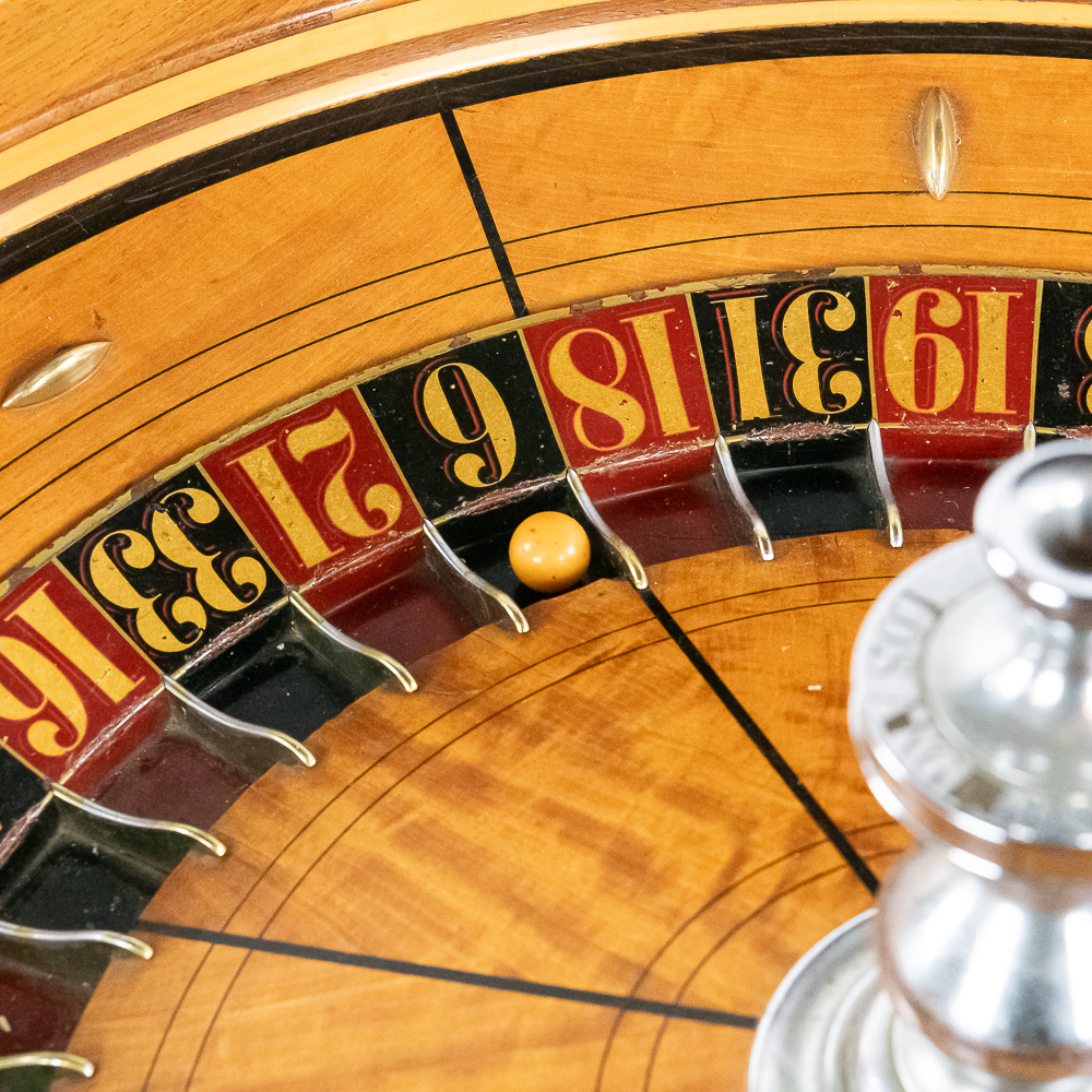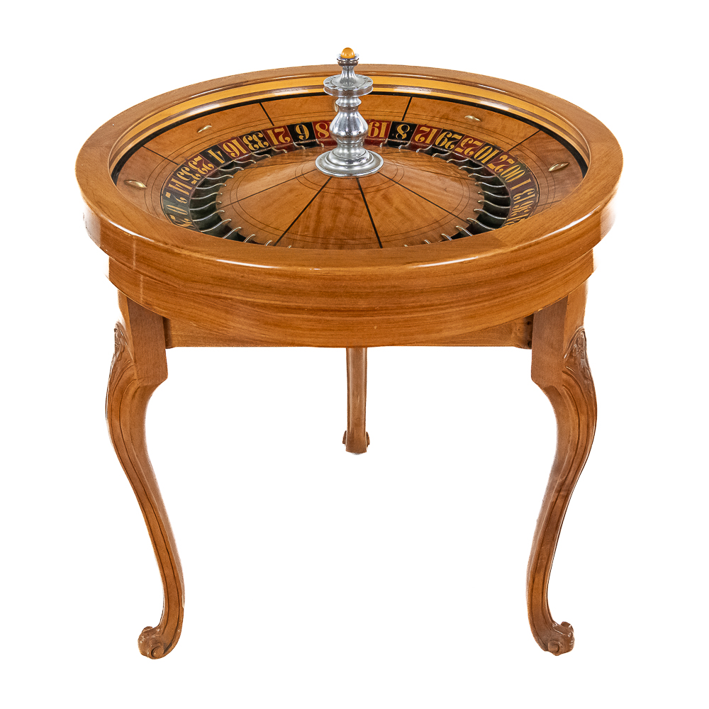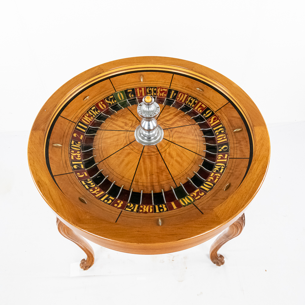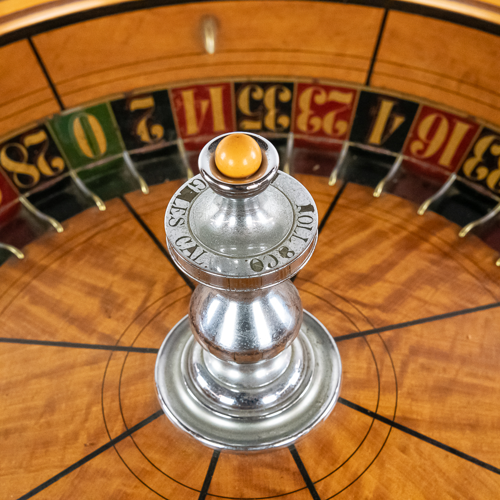 Made by Noll & Co. of Los Angeles California this is a 32″ double zero wheel that was made to inset into a standard roulette layout table but is currently on a 3 leg table. It comes with the pea (white ball) and is missing one of the frets (the dividers between the numbers). Otherwise it is in VG condition and spins smoothly.