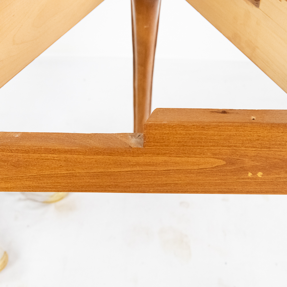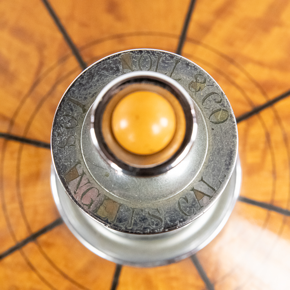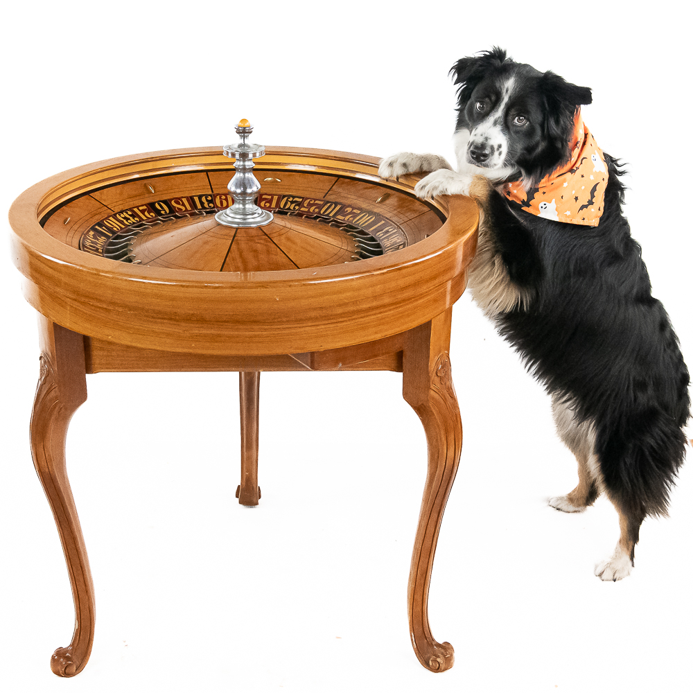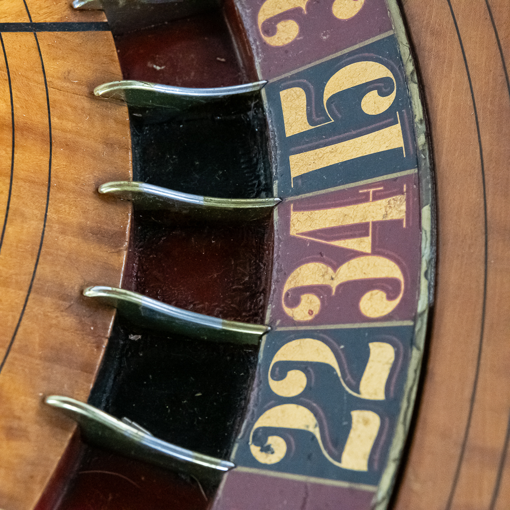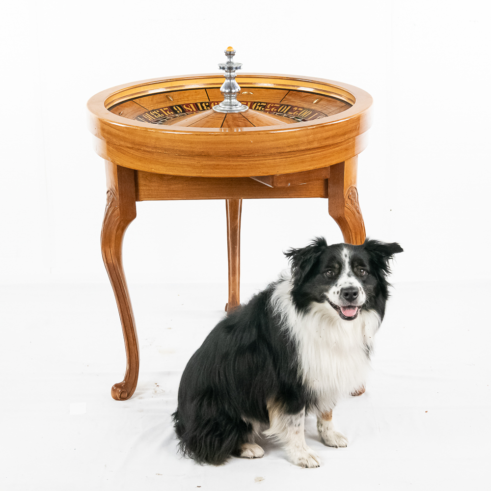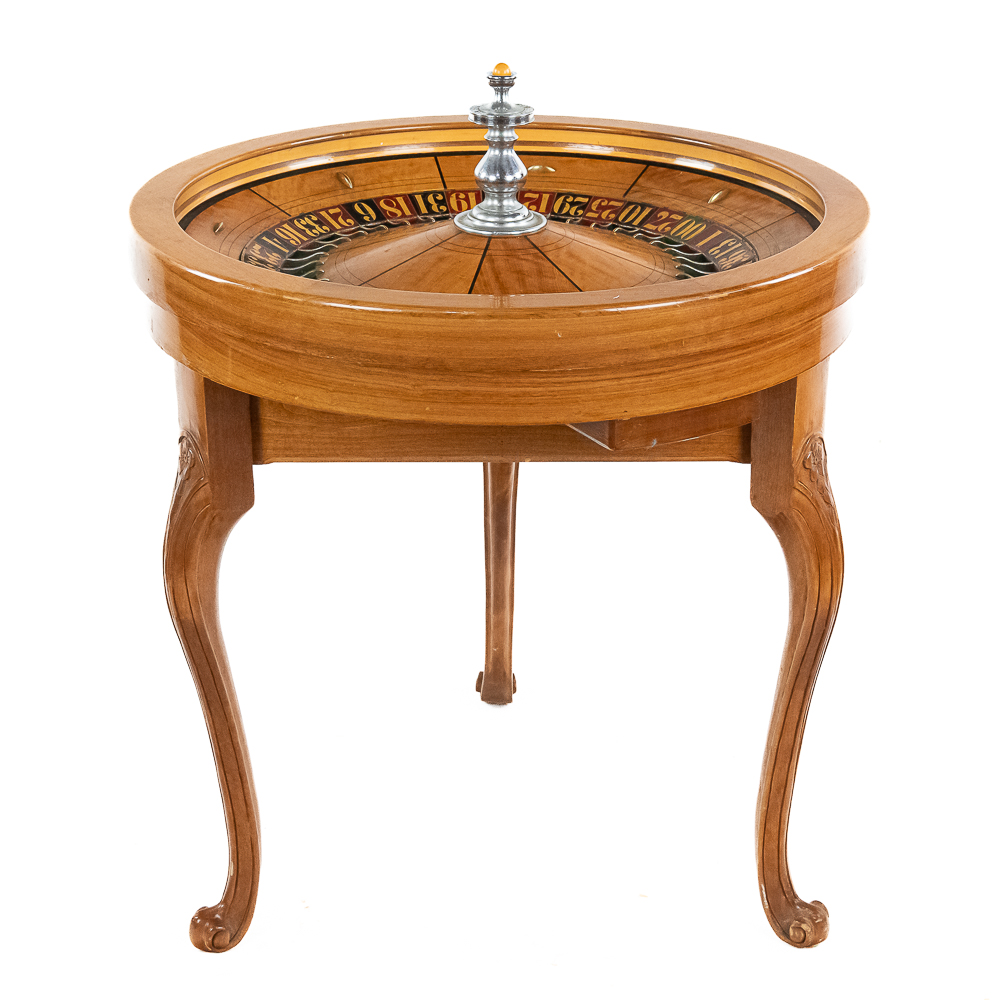 Made by Noll & Co. of Los Angeles California this is a 32″ double zero wheel that was made to inset into a standard roulette layout table but is currently on a 3 leg table. It comes with the pea (white ball) and is missing one of the frets (the dividers between the numbers). Otherwise it is in VG condition and spins smoothly.