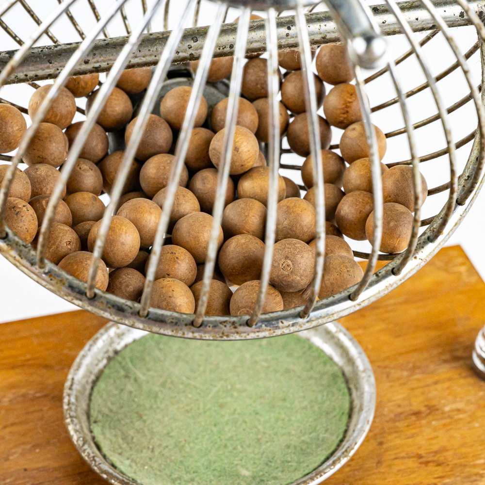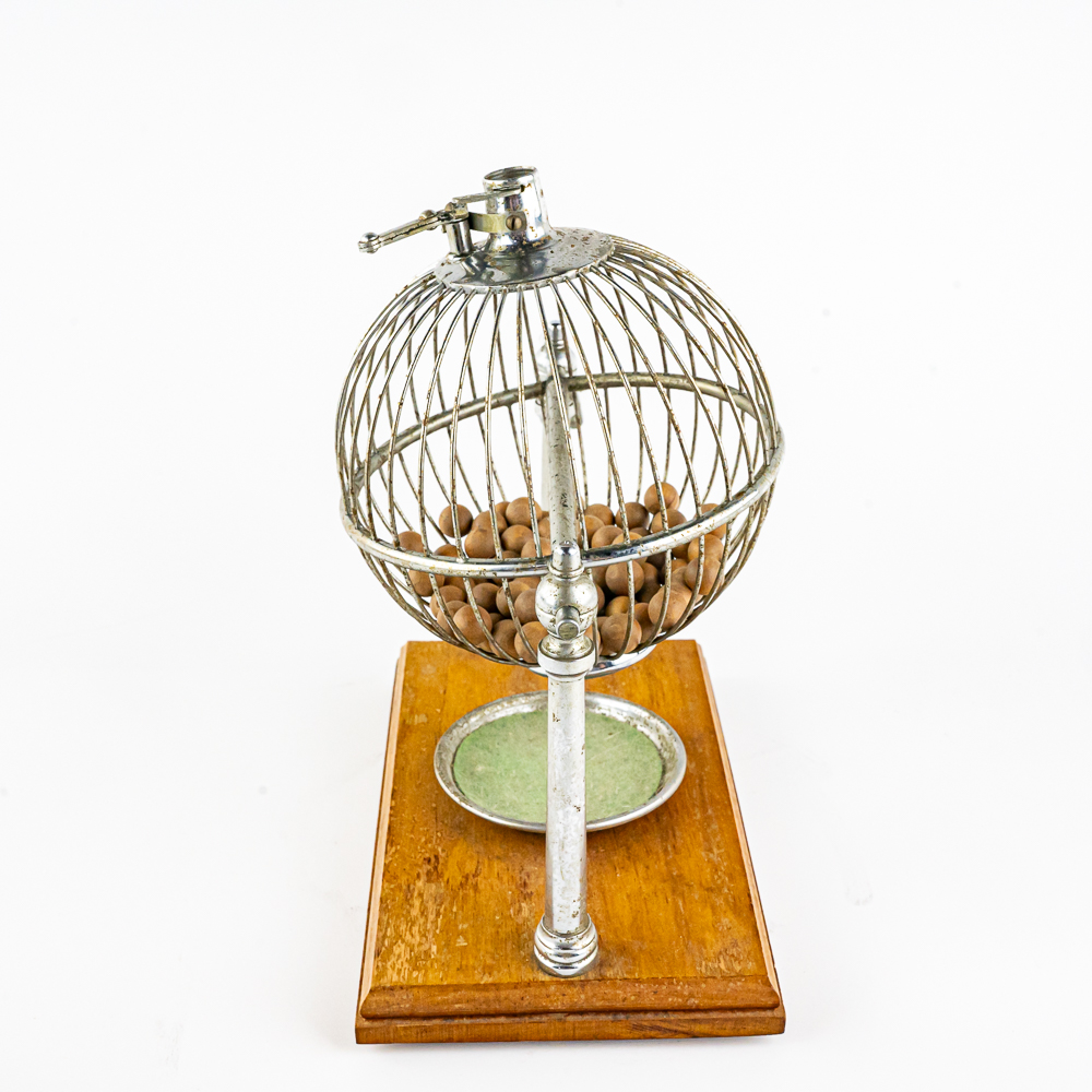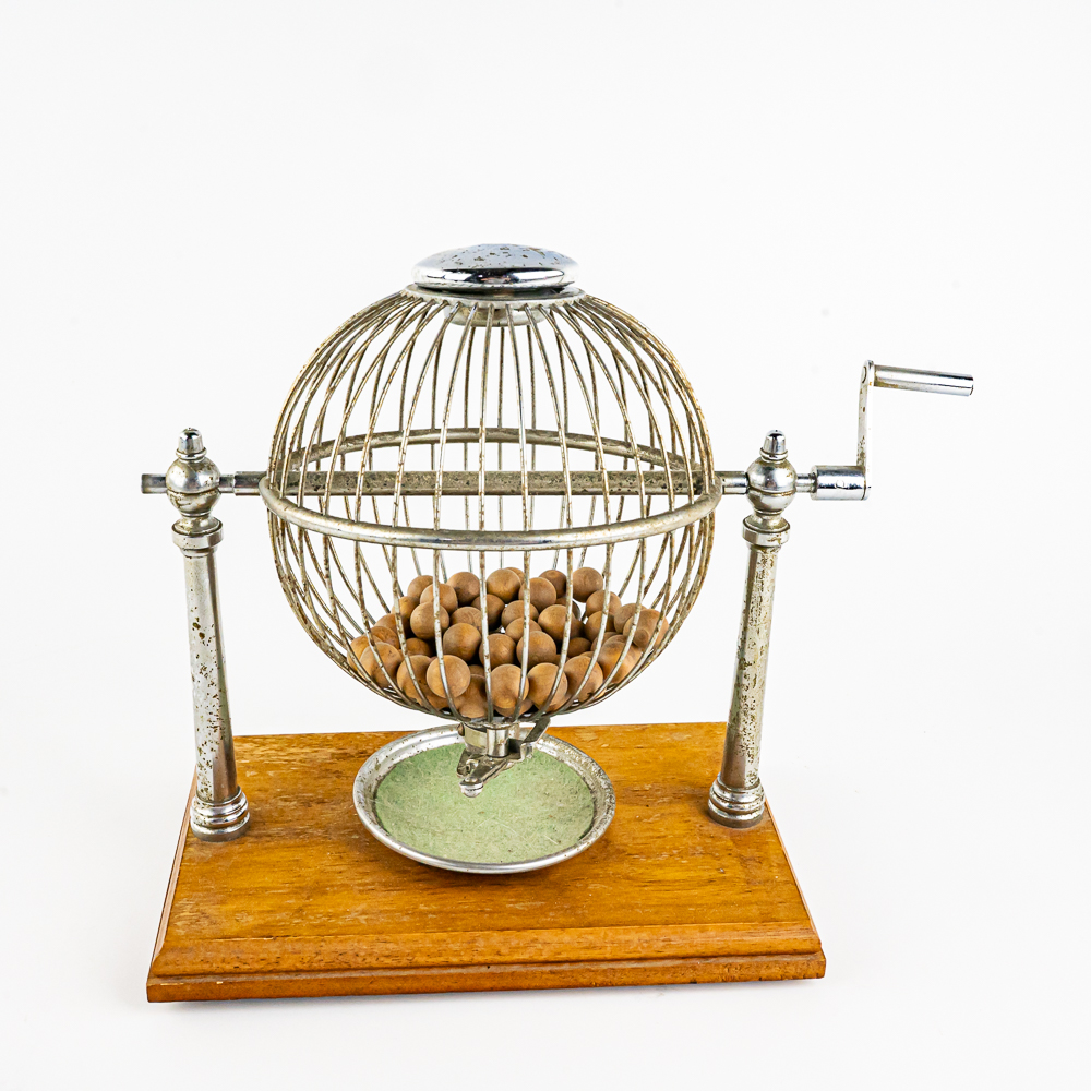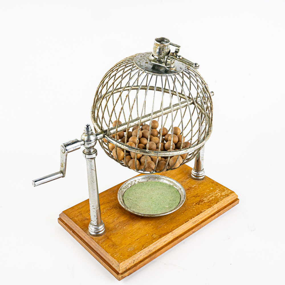 Vintage wire cage used to call Keno, a gambling numbers game. Round cage mounted on a hand crank rotisserie style revolving mechanism and releases ball one at a time via a hand activated spring loaded lever. The numbers are returned to the cage via a twist lock cap on top of the cage. Mounted to a wood base. In overall VG condition. Please note that the wood balls included with this cage are NOT numbered faro balls. Measures 12″ wide, 6″ deep, 10″ tall.