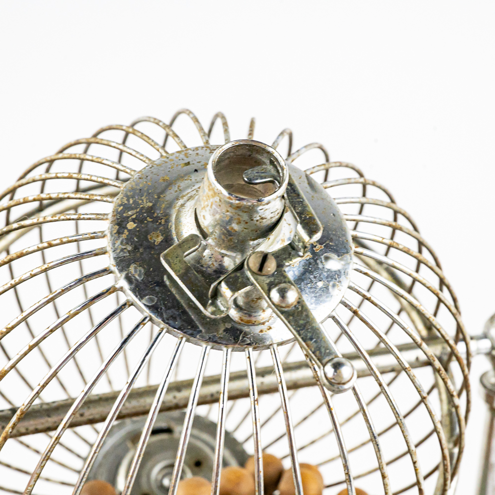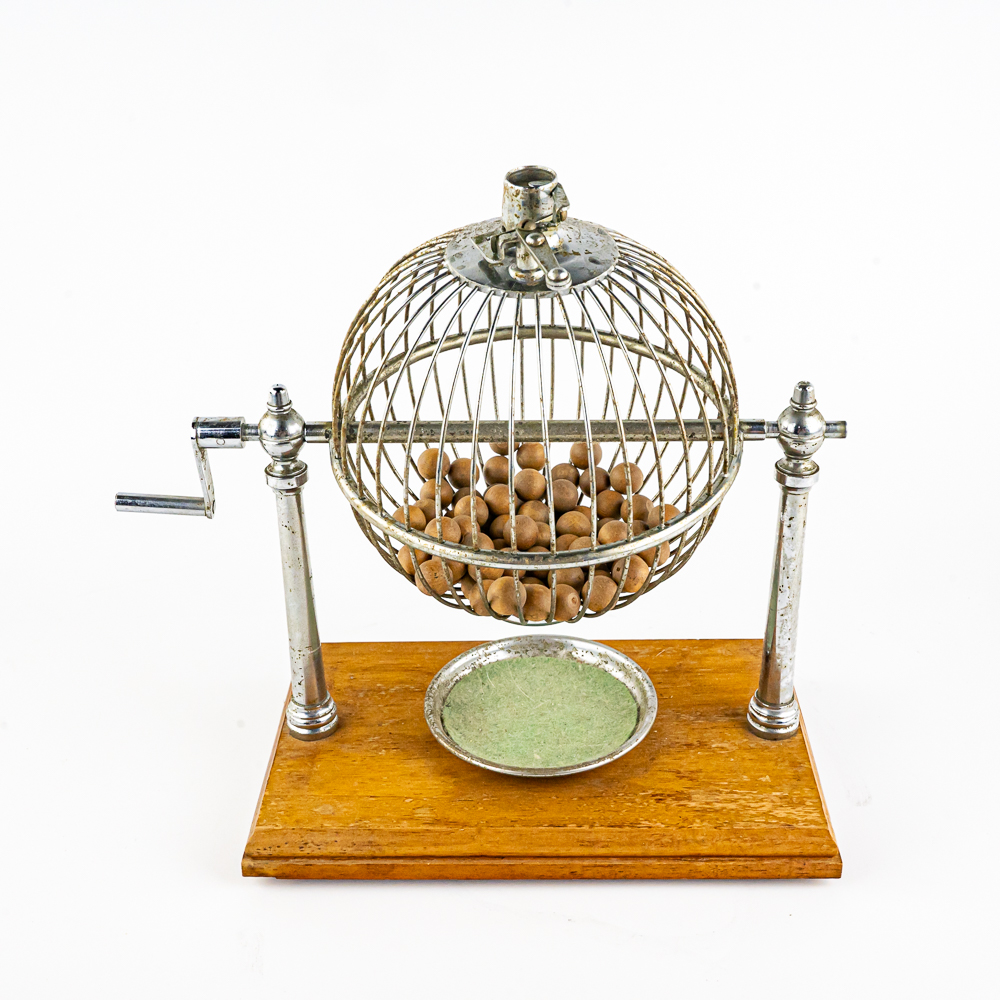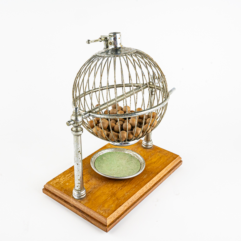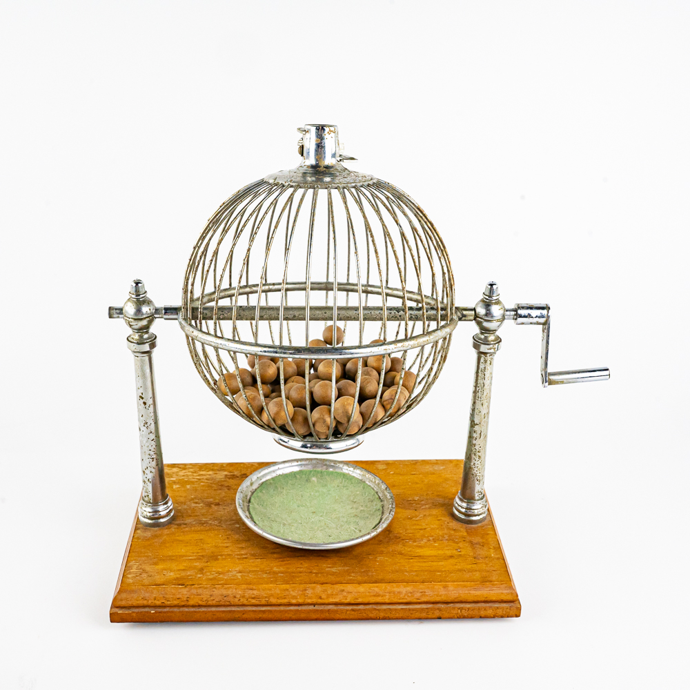 Vintage wire cage used to call Keno, a gambling numbers game. Round cage mounted on a hand crank rotisserie style revolving mechanism and releases ball one at a time via a hand activated spring loaded lever. The numbers are returned to the cage via a twist lock cap on top of the cage. Mounted to a wood base. In overall VG condition. Please note that the wood balls included with this cage are NOT numbered faro balls. Measures 12″ wide, 6″ deep, 10″ tall.
