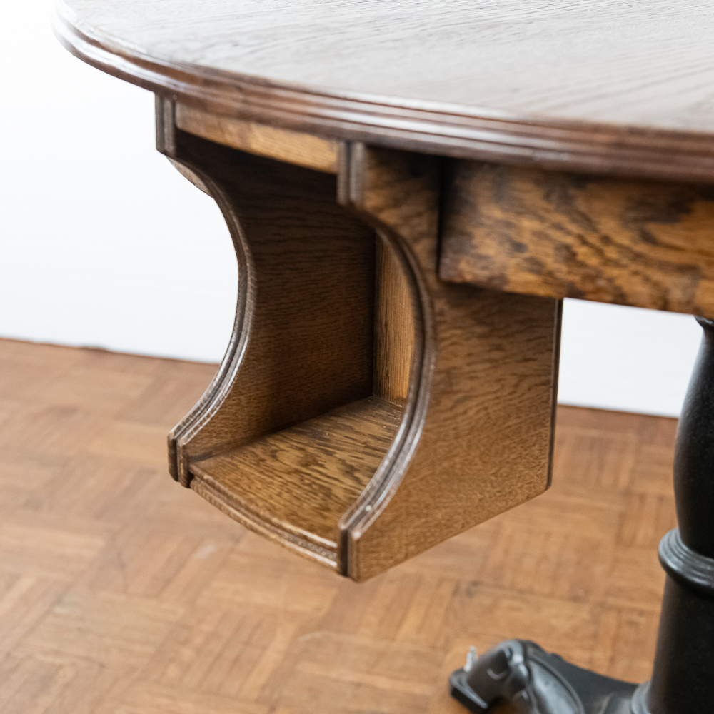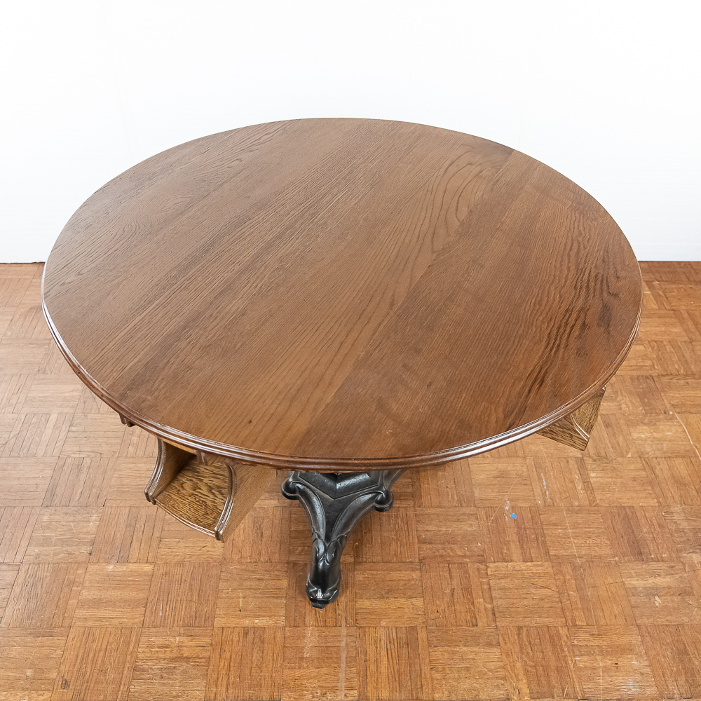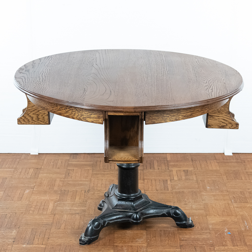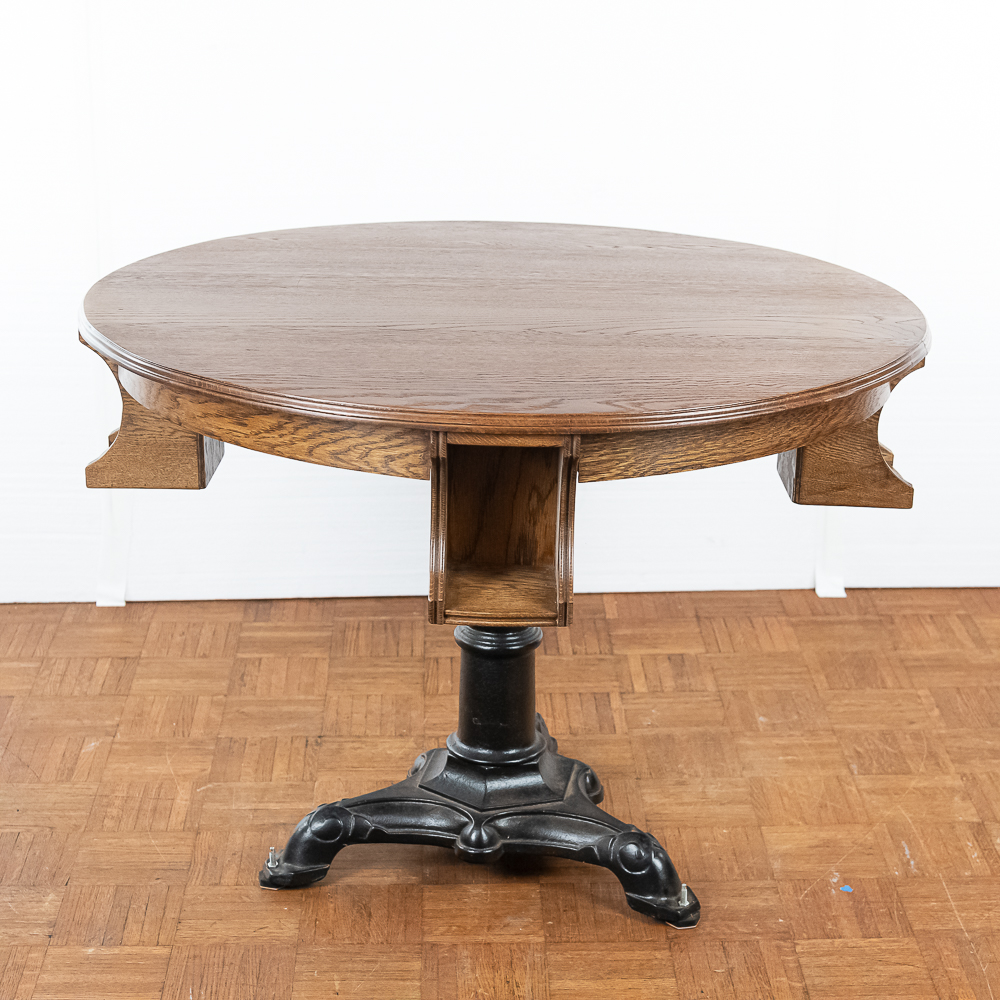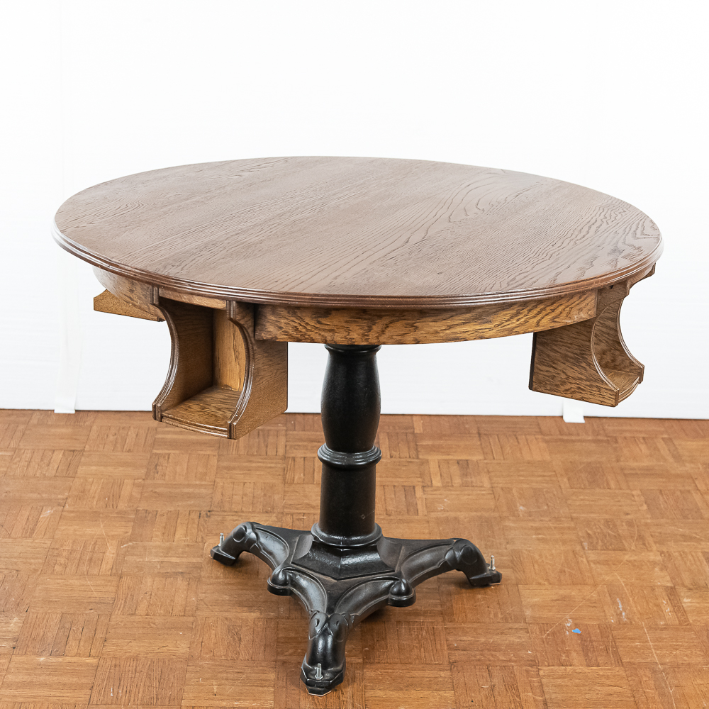Refinished solid oak tavern table for playing cards measures 40″ in diameter with 4 “hideaway” under shelves to hold a players beer mug. Mounted to a 3 leg heavy cast iron base.