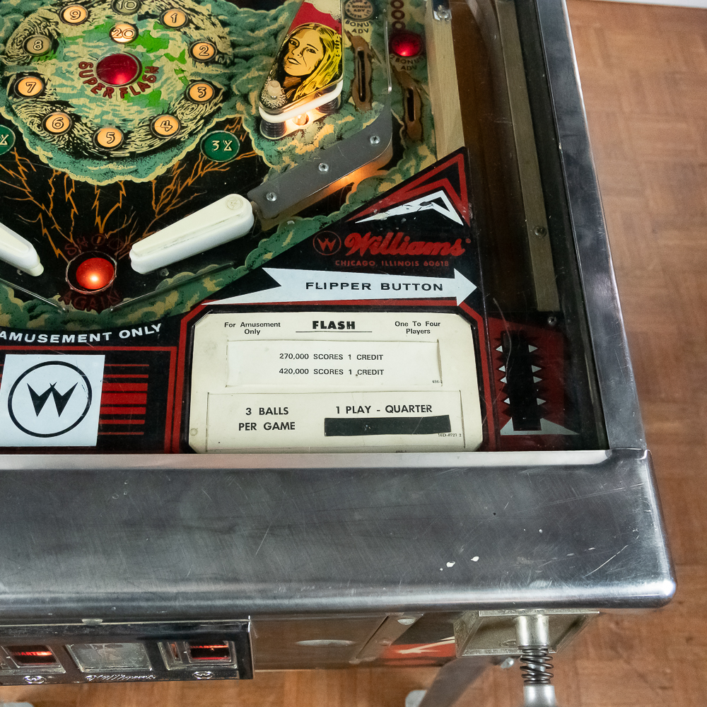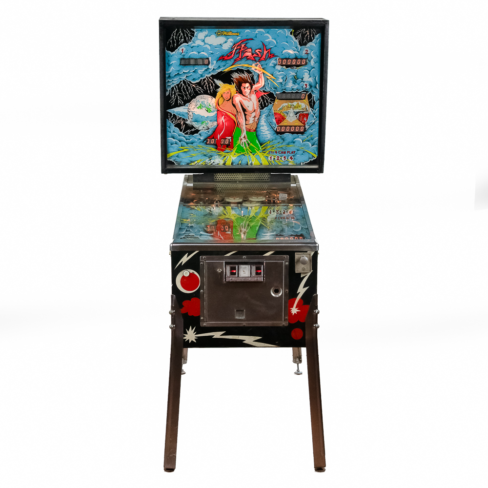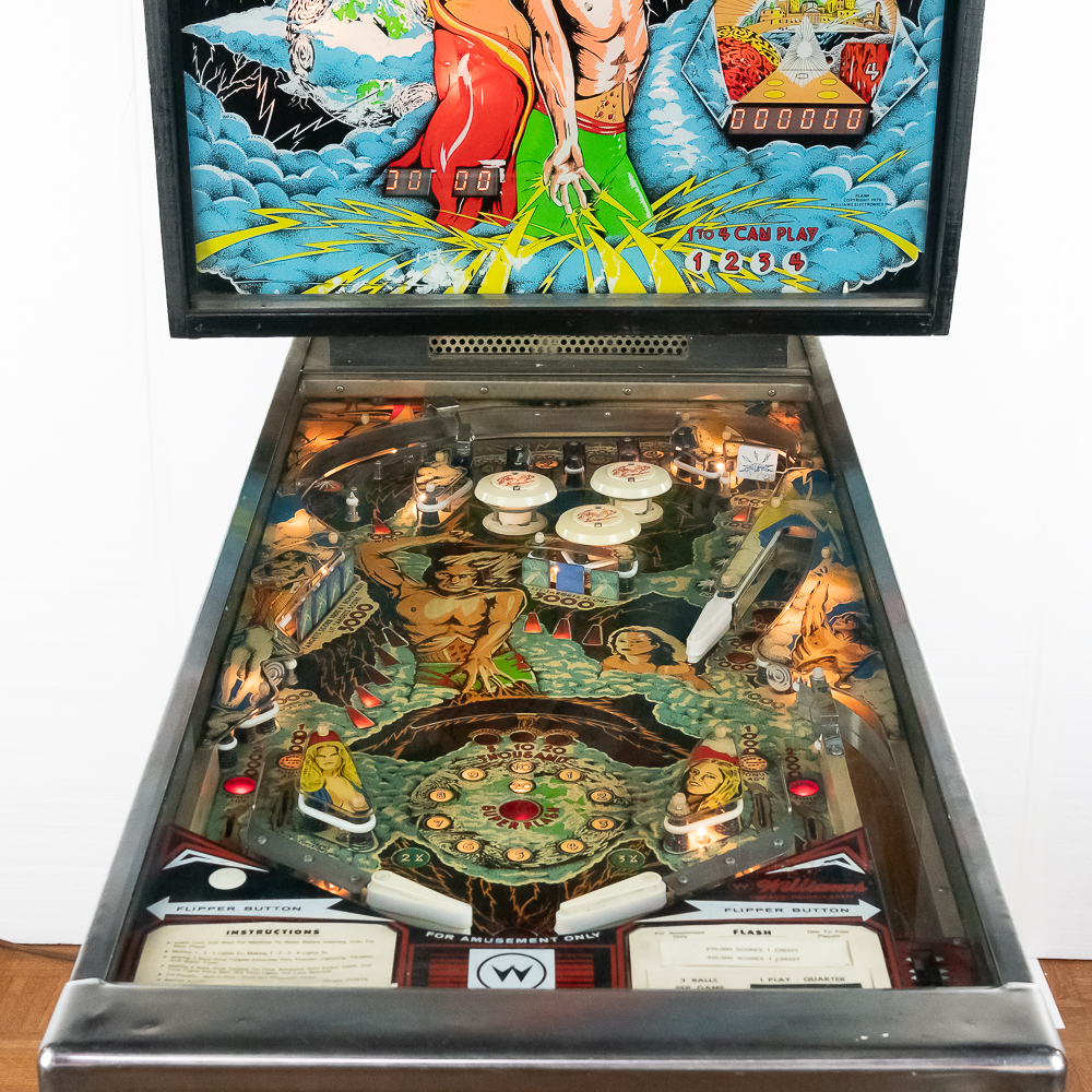 Designed by Steve Ritchie after leaving Atari for Williams in 1979. With 19,505 units built it’s the most successful machine made by Williams and the 3rd most successful Flipper-Game of all time. 4 player with digital scoring. In overall VG condition with good back glass, playfield, and cabinet graphics. The coin mech is intact and currently on free play. There is no lock on the door. Lock & key for head present. Plays and scores well. Measures 52″ long, 30.5″ wide, 70″ tall.