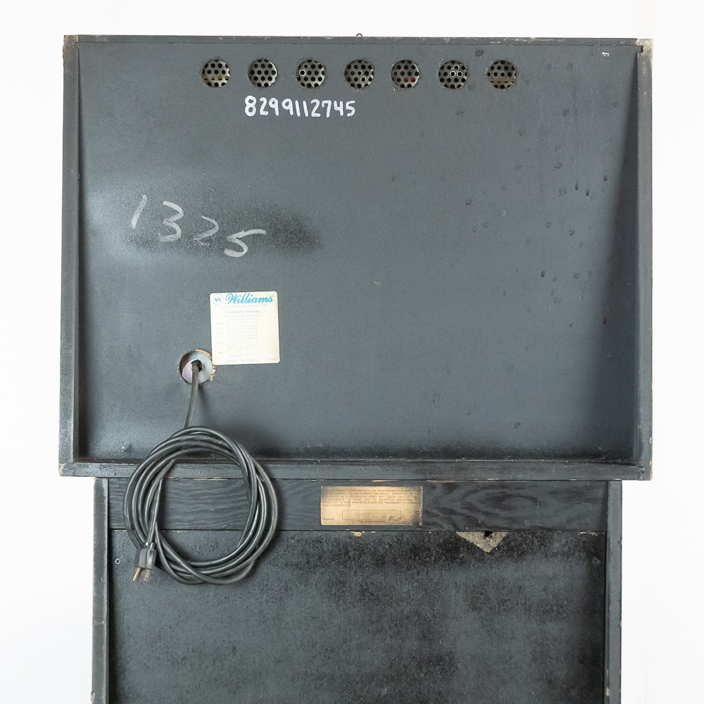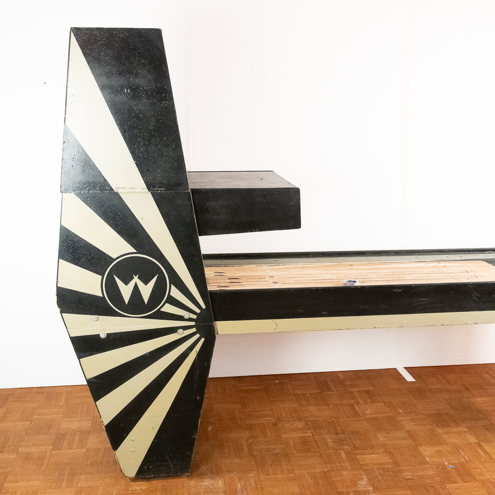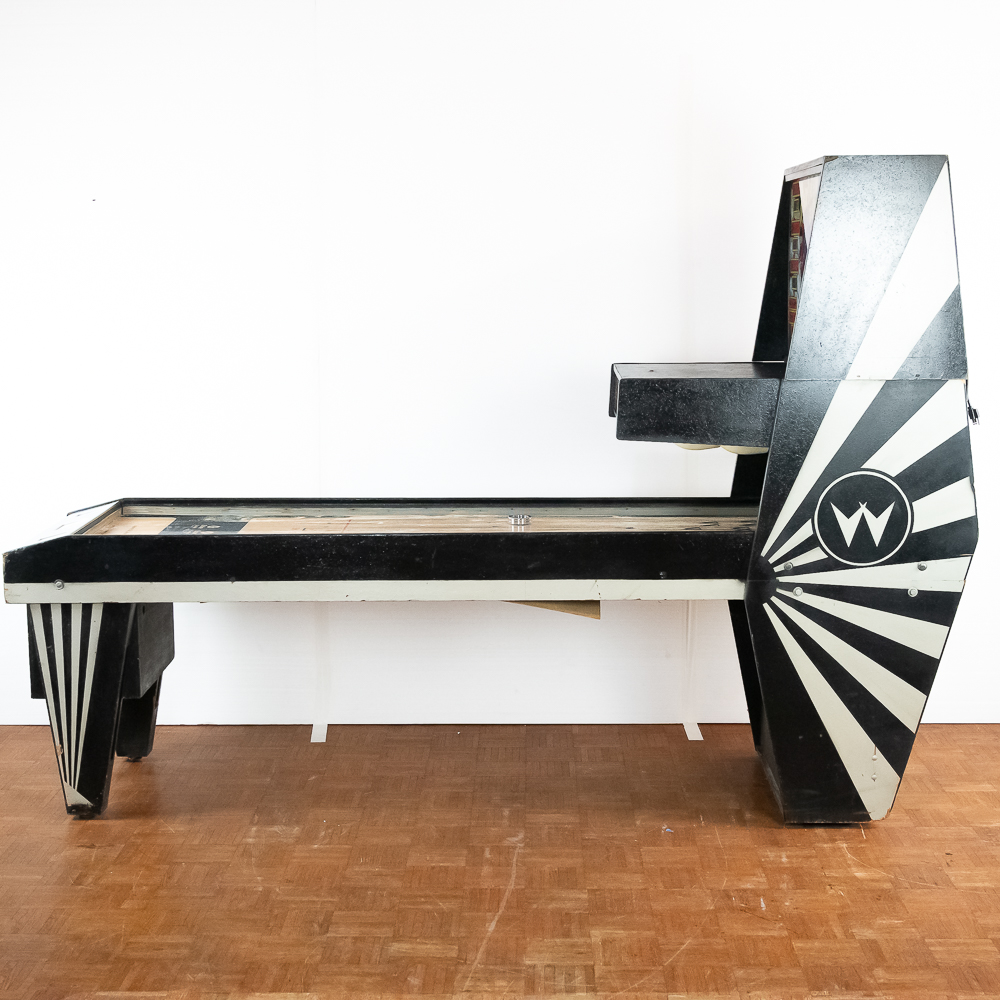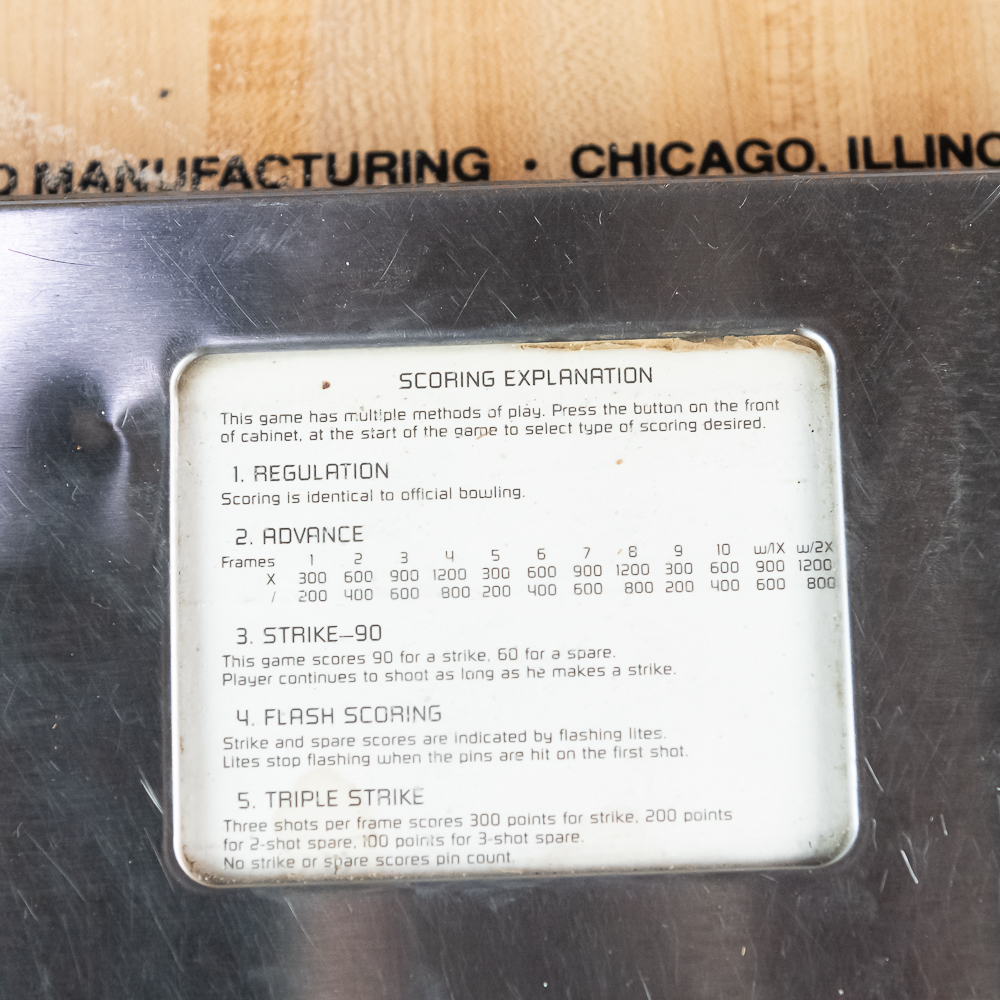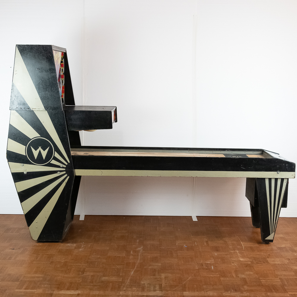 6 player digital score, plays 5 different games. Plays & scores well. In overall VG condition with VG back glass & cabinet graphics, alley shows very little wear. Coin mech intact but no key for the ace lock. Measures 104″ long, 30.5″ wide, 71.5″ tall.