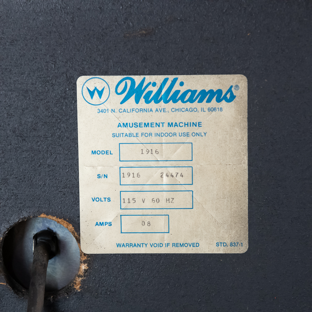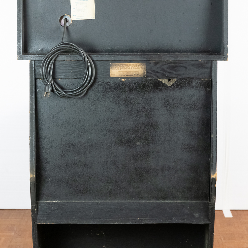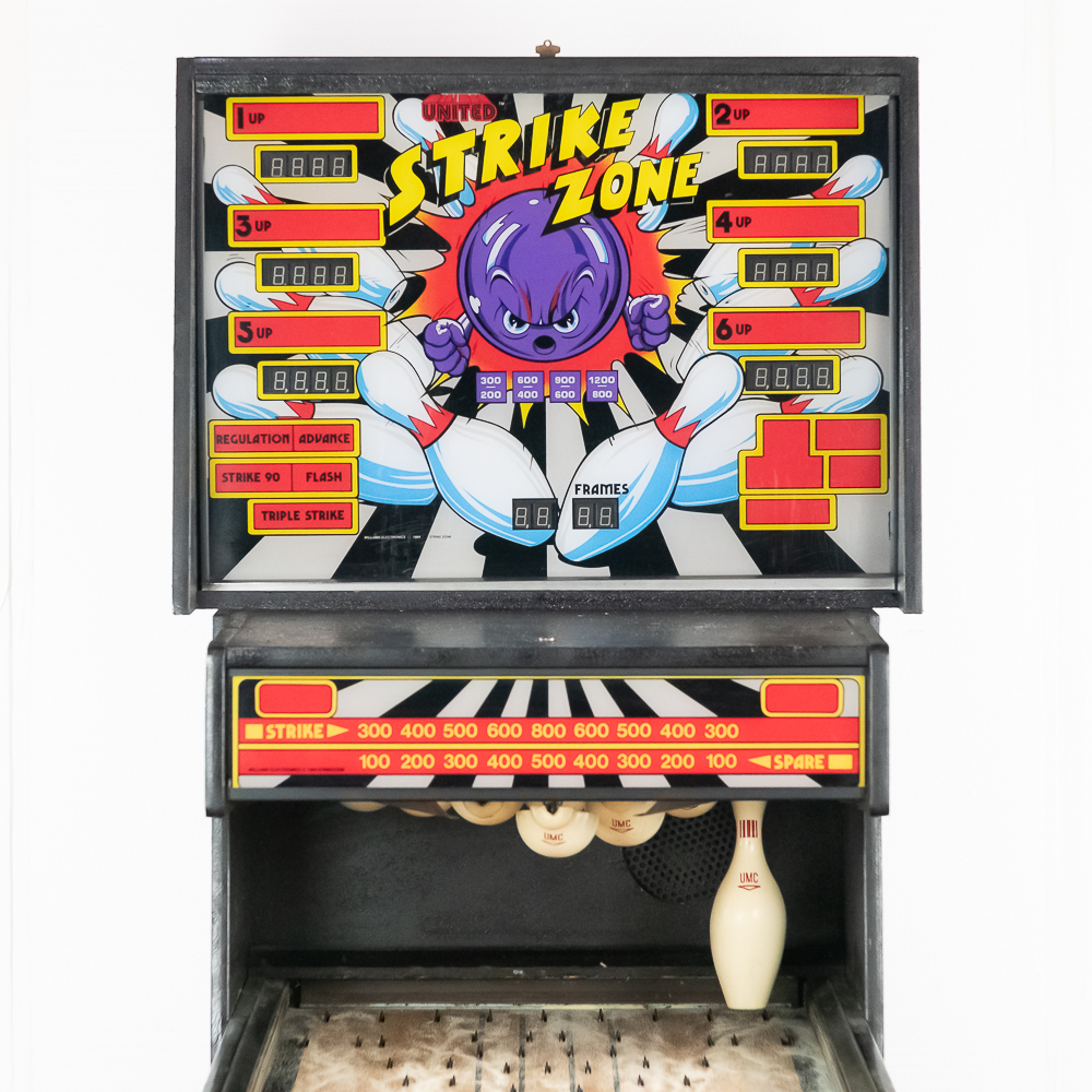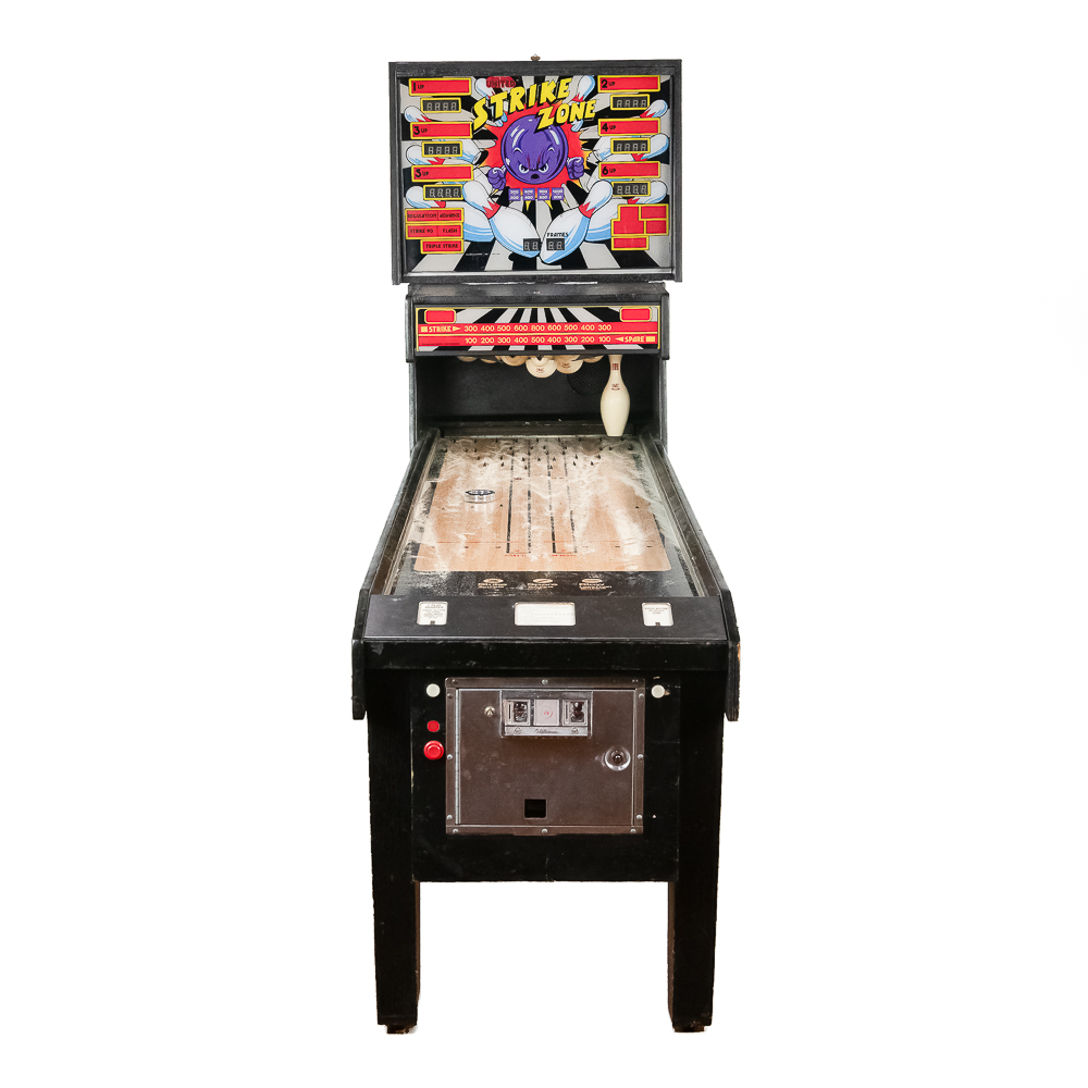 6 player digital score, plays 5 different games. Plays & scores well. In overall VG condition with VG back glass & cabinet graphics, alley shows very little wear. Coin mech intact but no key for the ace lock. Measures 104″ long, 30.5″ wide, 71.5″ tall.