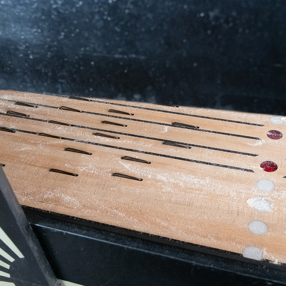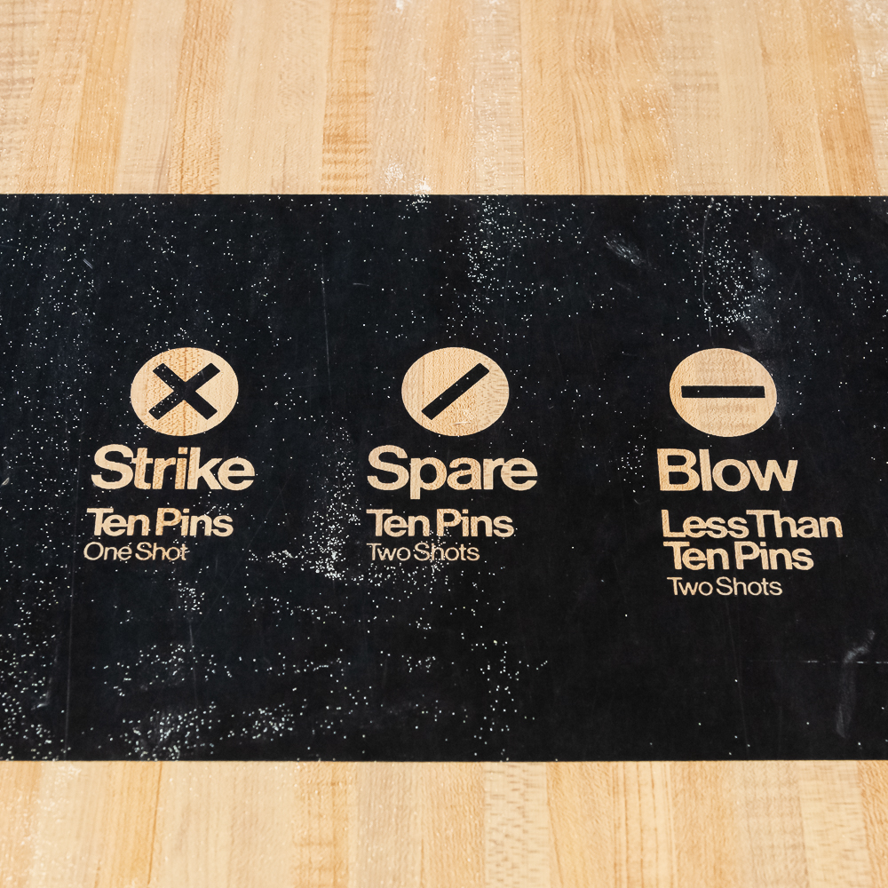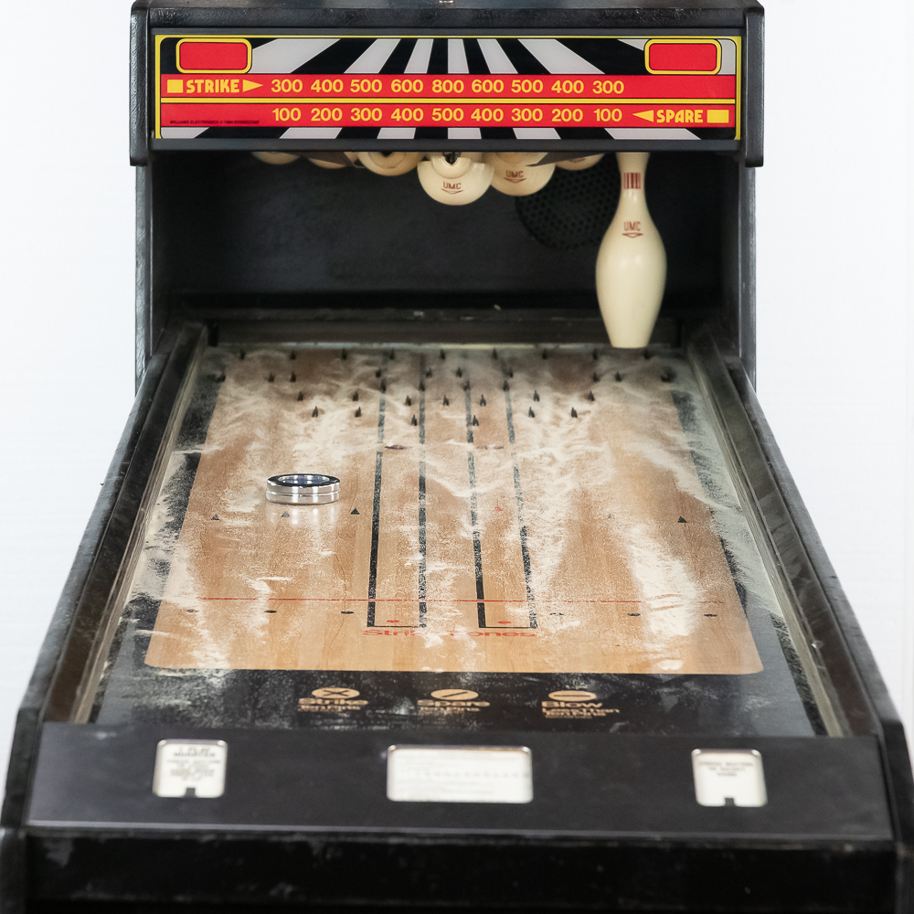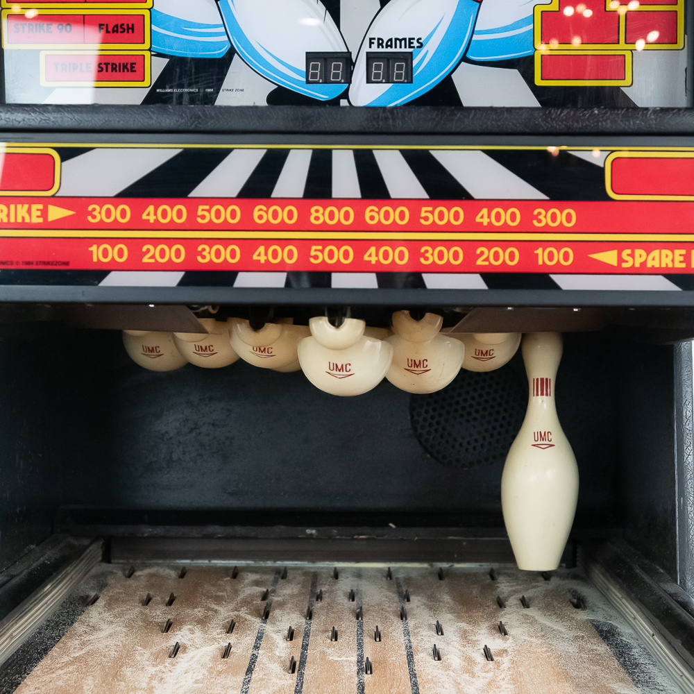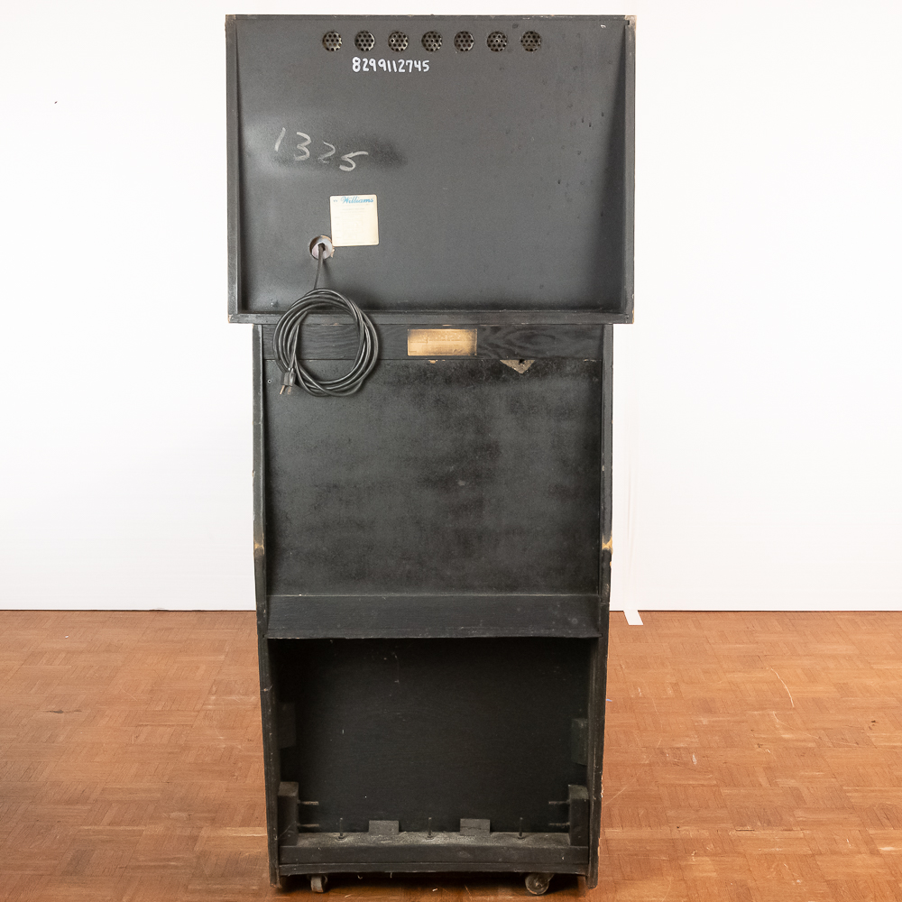 6 player digital score, plays 5 different games. Plays & scores well. In overall VG condition with VG back glass & cabinet graphics, alley shows very little wear. Coin mech intact but no key for the ace lock. Measures 104″ long, 30.5″ wide, 71.5″ tall.