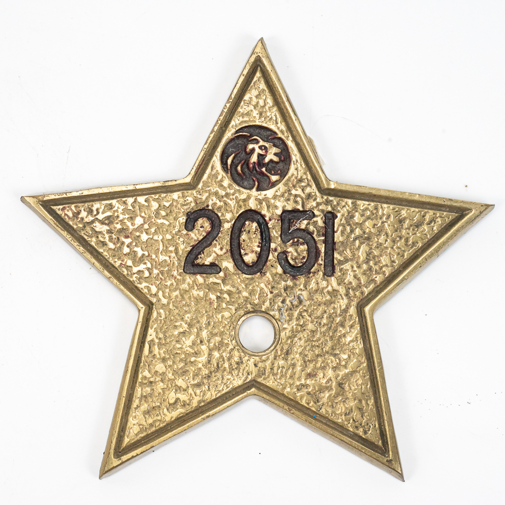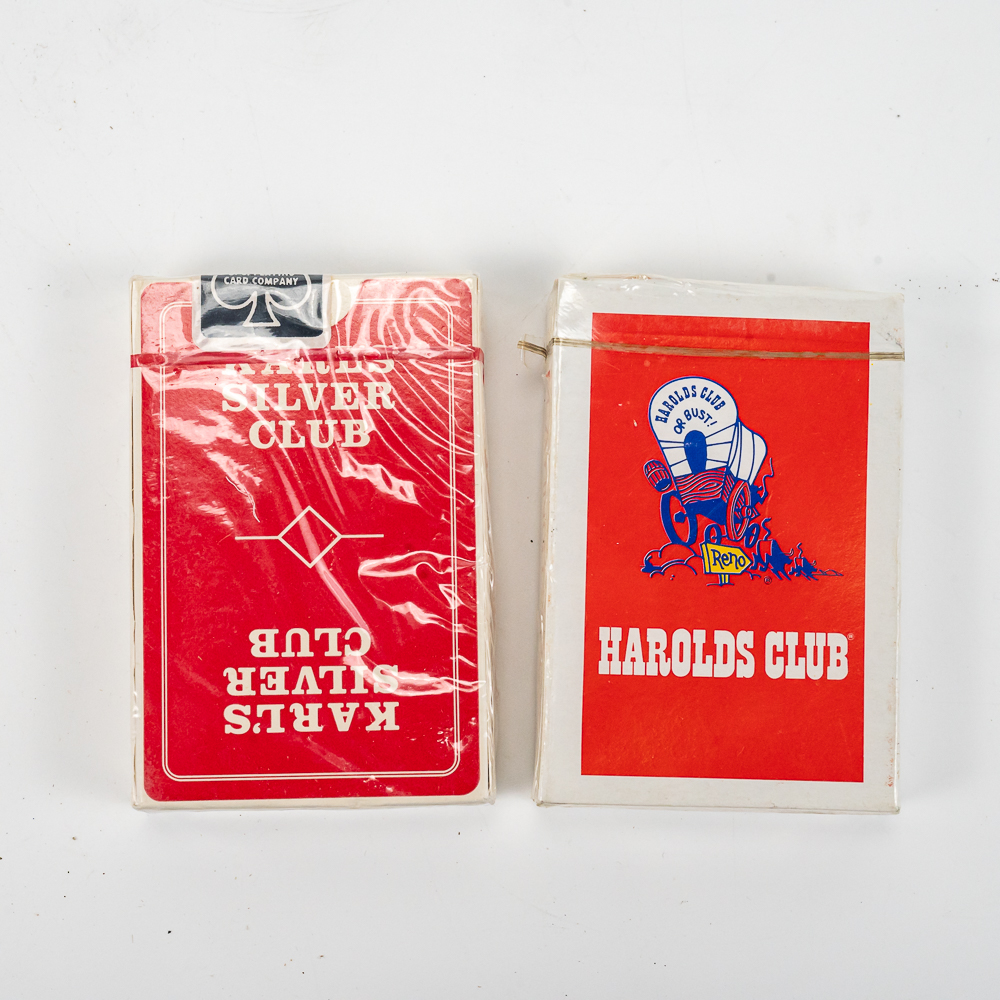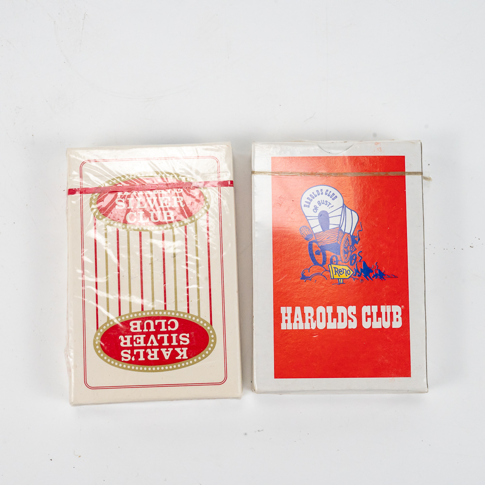 Lot includes two unopened packs of playing cards. Harold’s Club and Karl’s Silver Club, a solid brass decorative 5″ room door star from the MGM Grand in Las Vegas. and a 10″ solid brass decorative “S” with inset colored mirrors from the entrance of the Sahara Hotel and Casino in Las Vegas which opened in 1952 and closed May 16th, 2011. Overall fair to good condition
