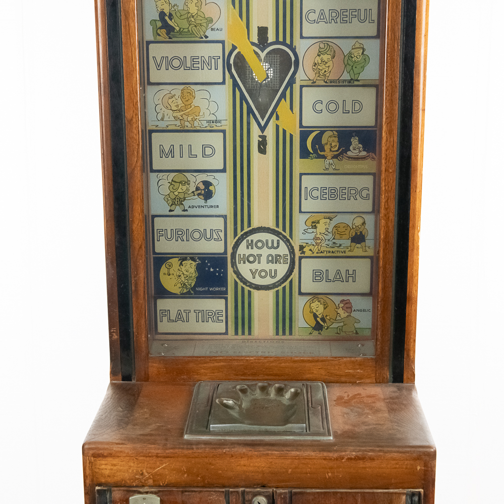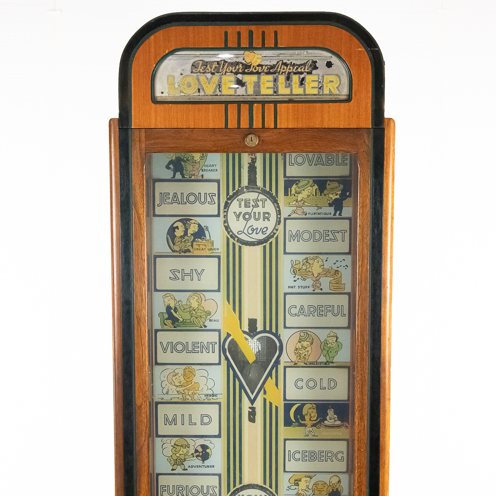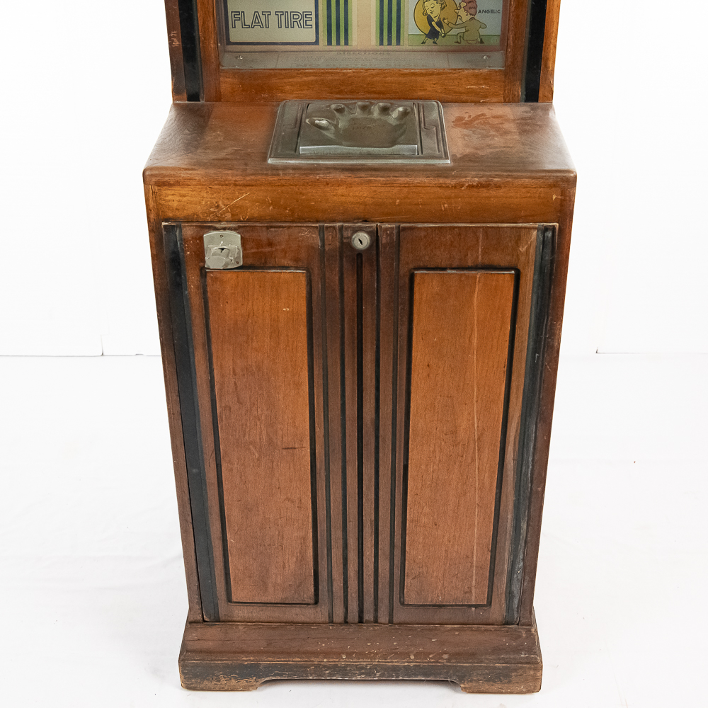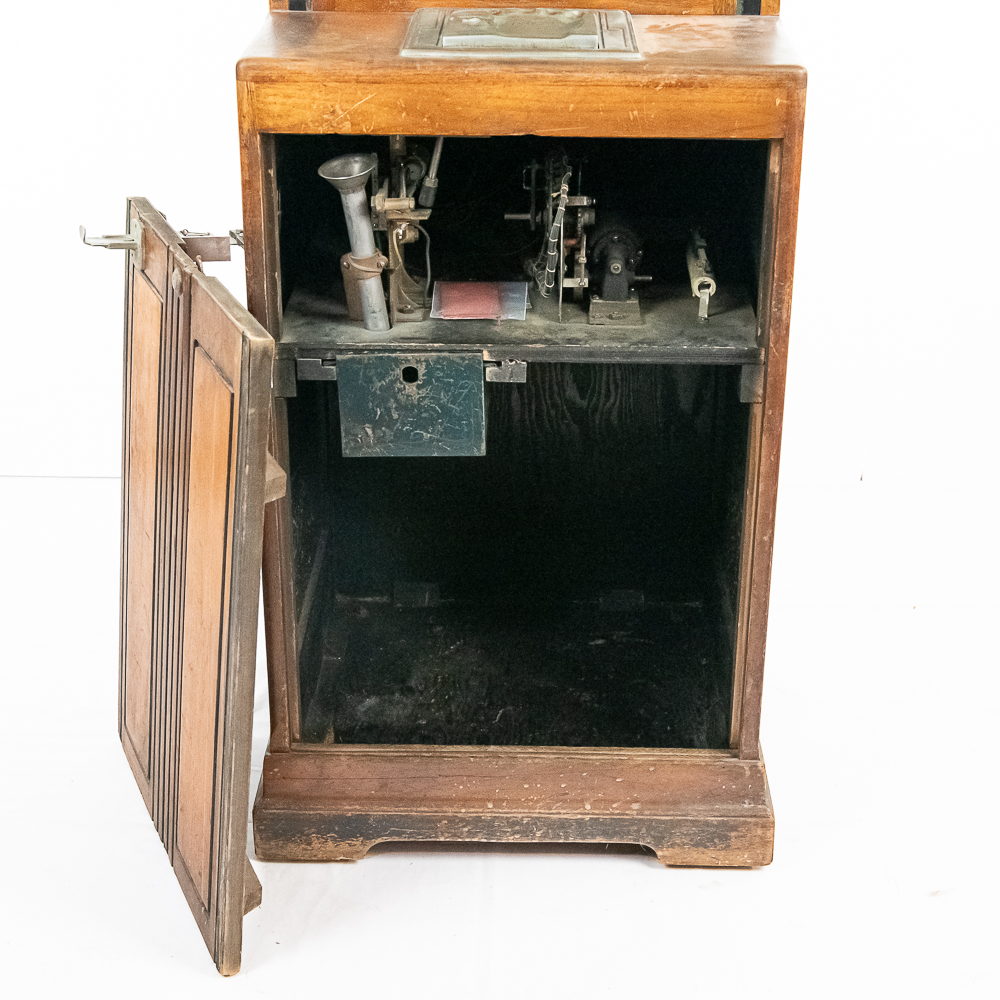 A rare and sought after arcade machine with a nice art deco wood cabinet with light up wood marquee. Manufactured by International Mutoscope Inc.. Has good glass panels with some light reverse glass artwork paint flaking. Please see photos. Looks to be complete with coin box but is missing front door key. Good solid wood case that has original front and back door panels with some normal wear to original finish. Overall fair to good condition. Not tested.