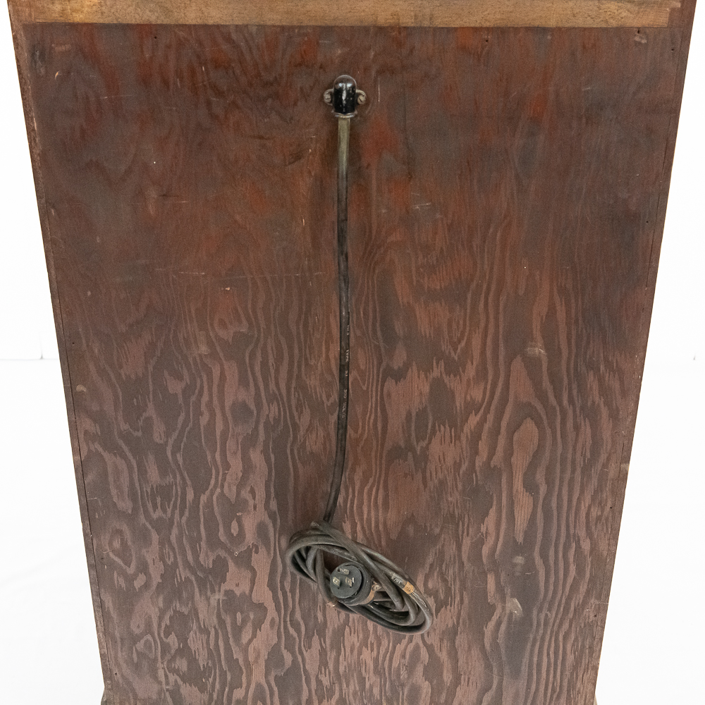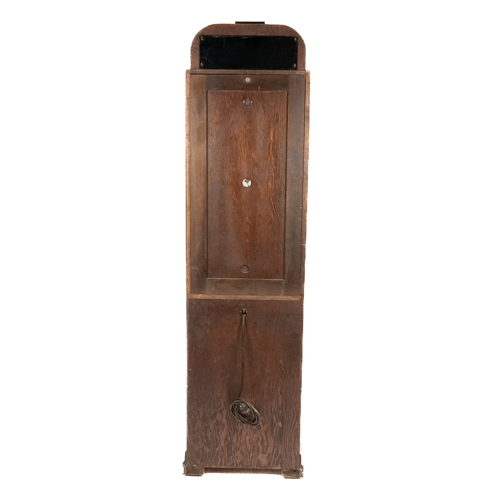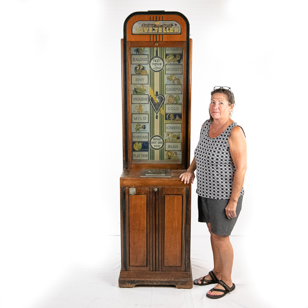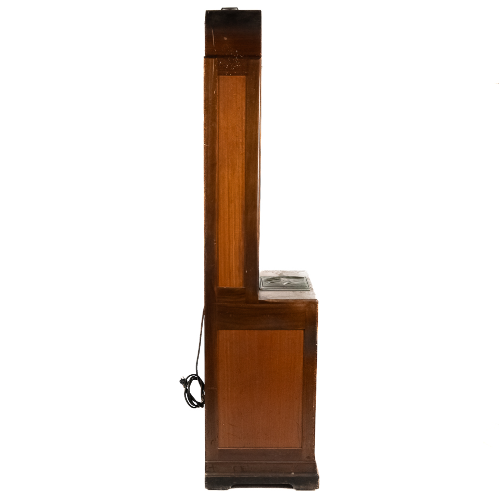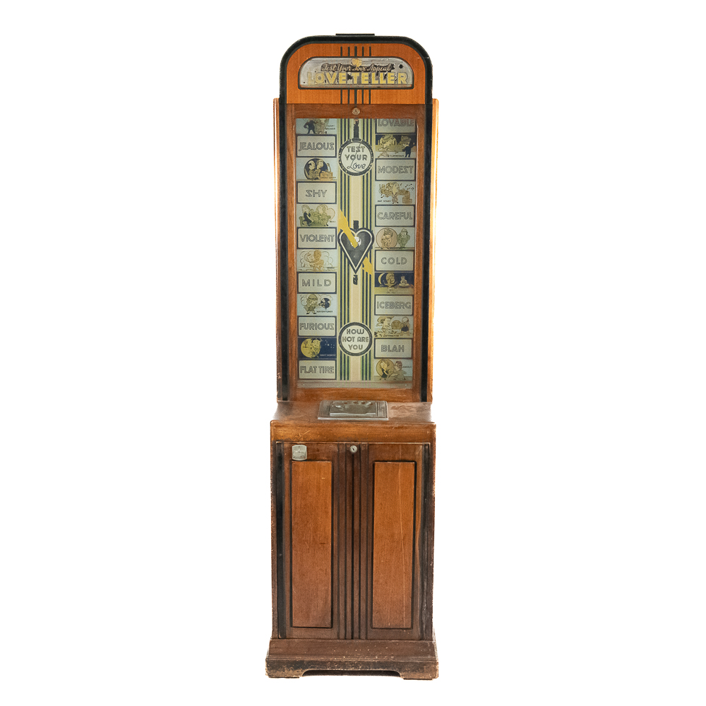 A rare and sought after arcade machine with a nice art deco wood cabinet with light up wood marquee. Manufactured by International Mutoscope Inc.. Has good glass panels with some light reverse glass artwork paint flaking. Please see photos. Looks to be complete with coin box but is missing front door key. Good solid wood case that has original front and back door panels with some normal wear to original finish. Overall fair to good condition. Not tested.