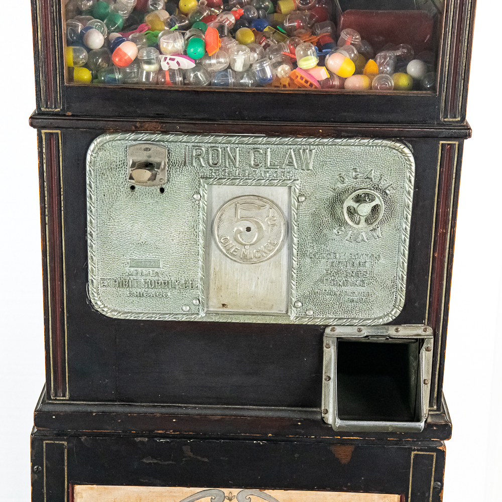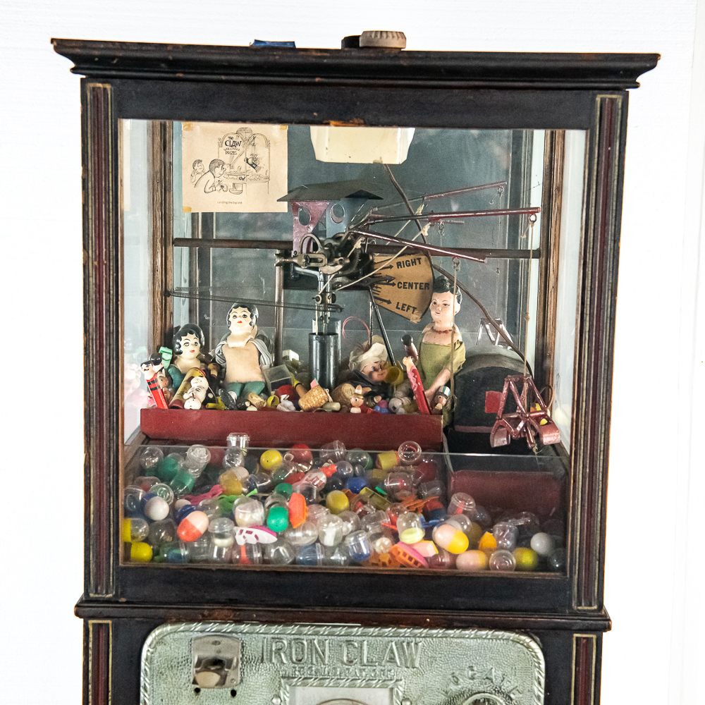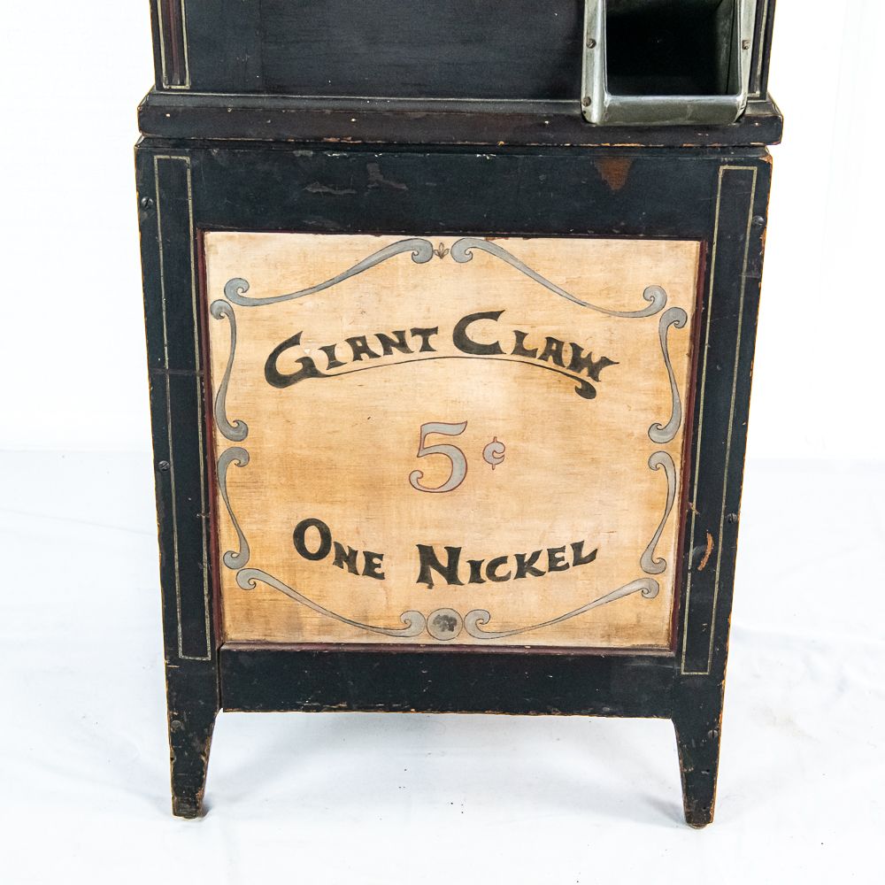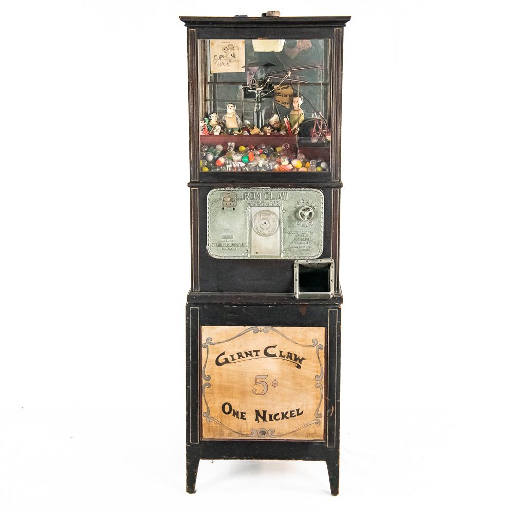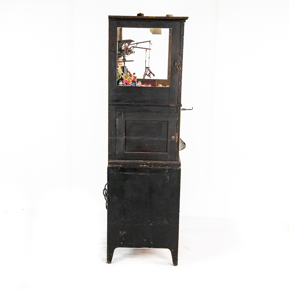 Coin operated crane machine made by Exhibit Supply of Chicago. 2 piece wood and glass cabinet with 5 cent operation features a steam shovel which lowers the claw to grab a prize which is deposited into a prize chute. In good unrestored condition, Accepts coin and plays as it should. Measures 65″ tall, 22″ wide, 19″deep.