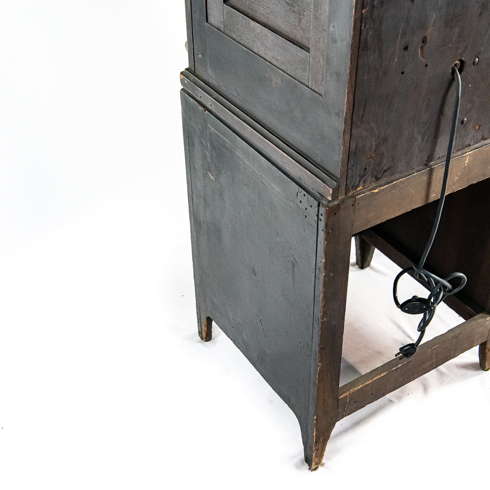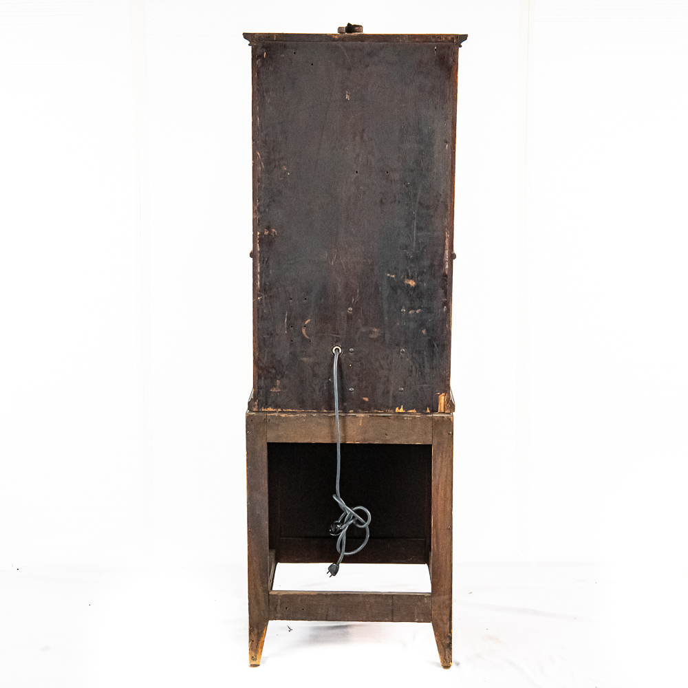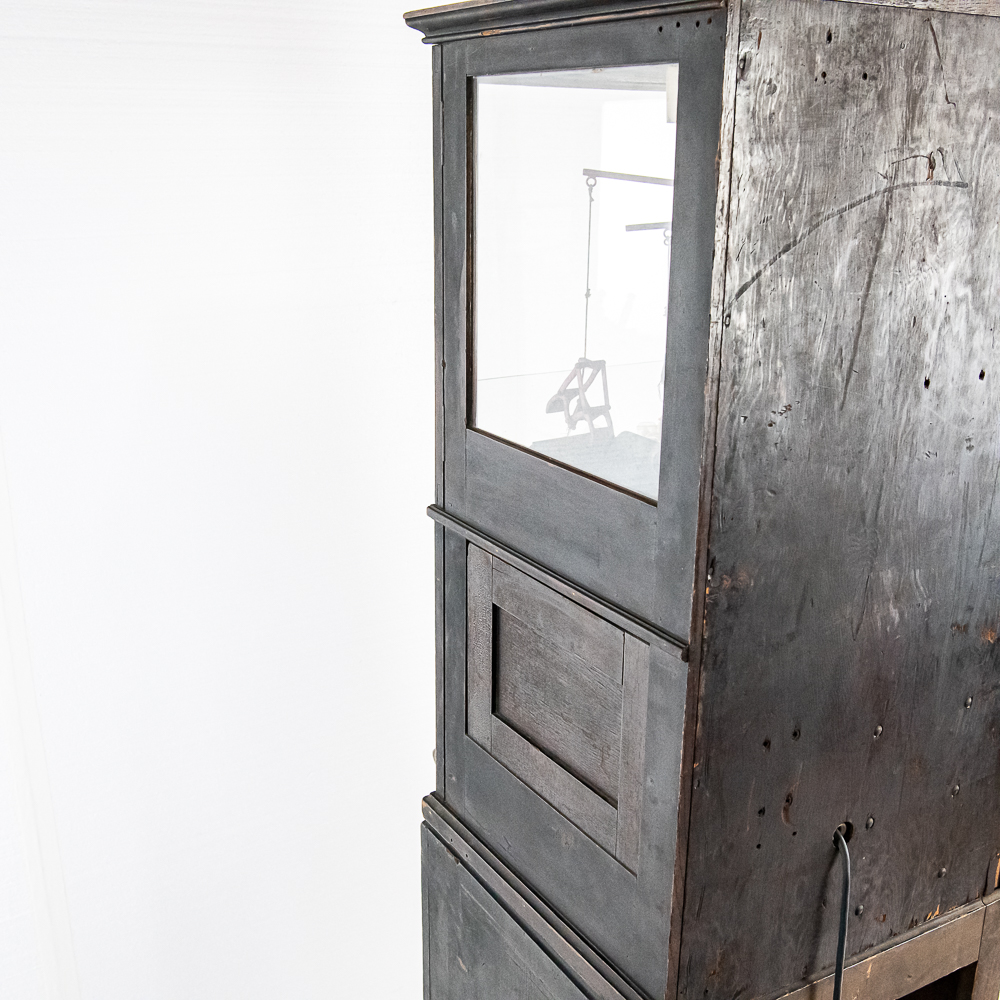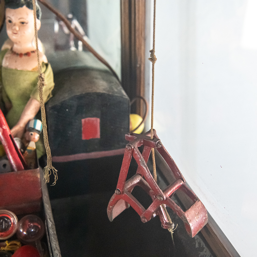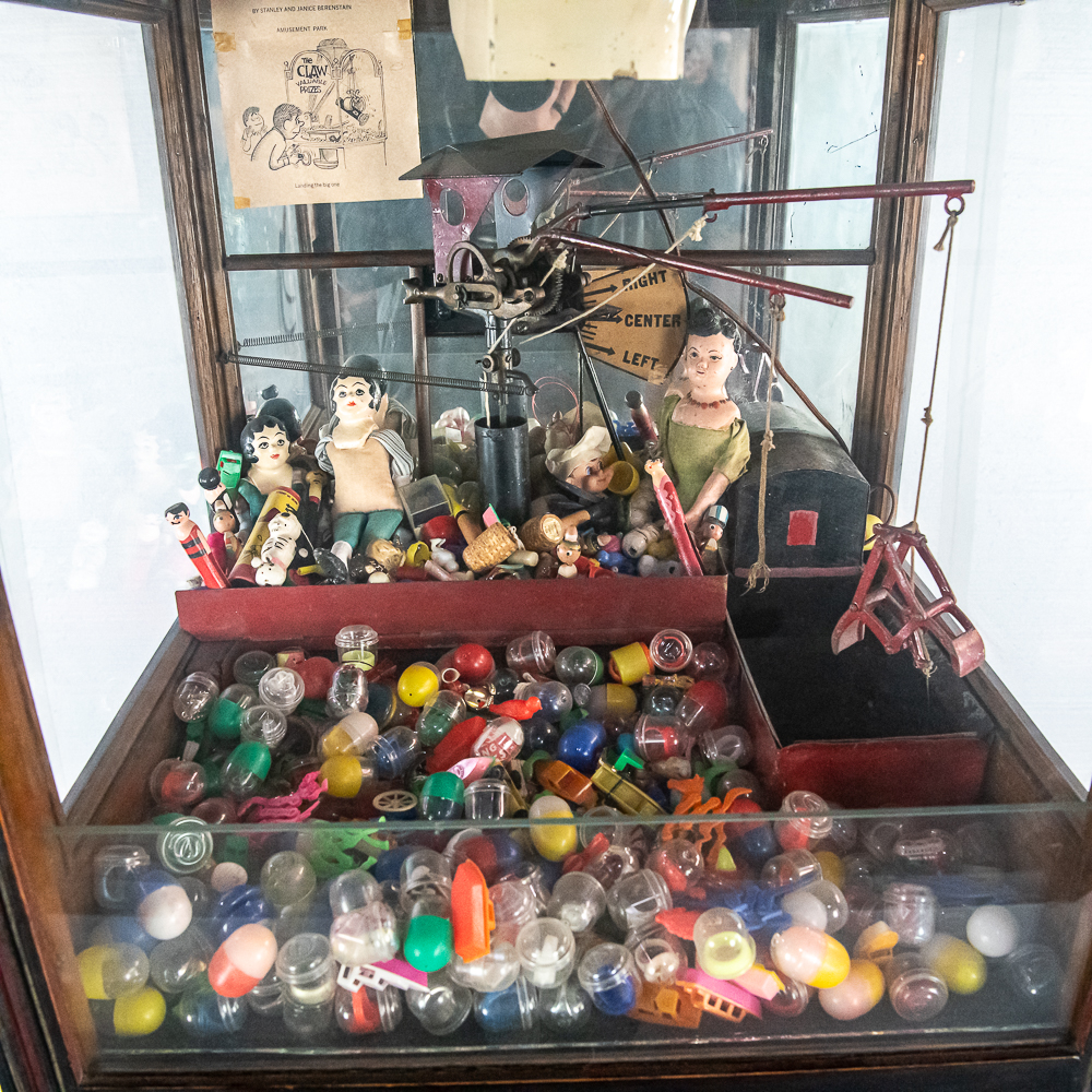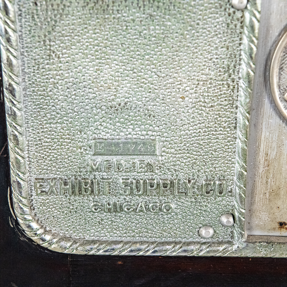 Coin operated crane machine made by Exhibit Supply of Chicago. 2 piece wood and glass cabinet with 5 cent operation features a steam shovel which lowers the claw to grab a prize which is deposited into a prize chute. In good unrestored condition, Accepts coin and plays as it should. Measures 65″ tall, 22″ wide, 19″deep.