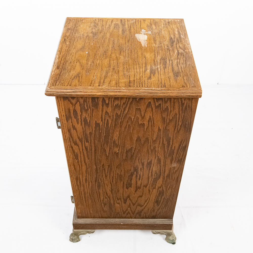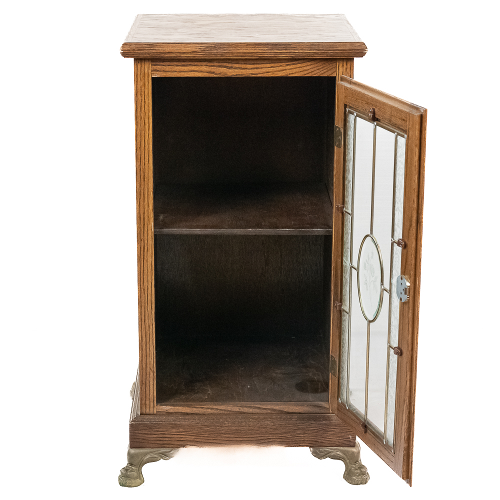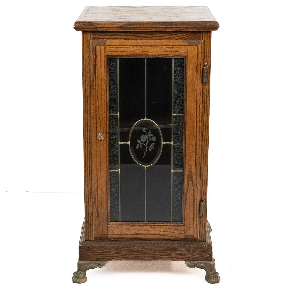 Contemporary made oak slot machine stand with a leaded glass front door. The lock on the door has no key but is currently unlocked. Has metal paw feet. In good condition. Measures 17″ X 17″ X 33″T.