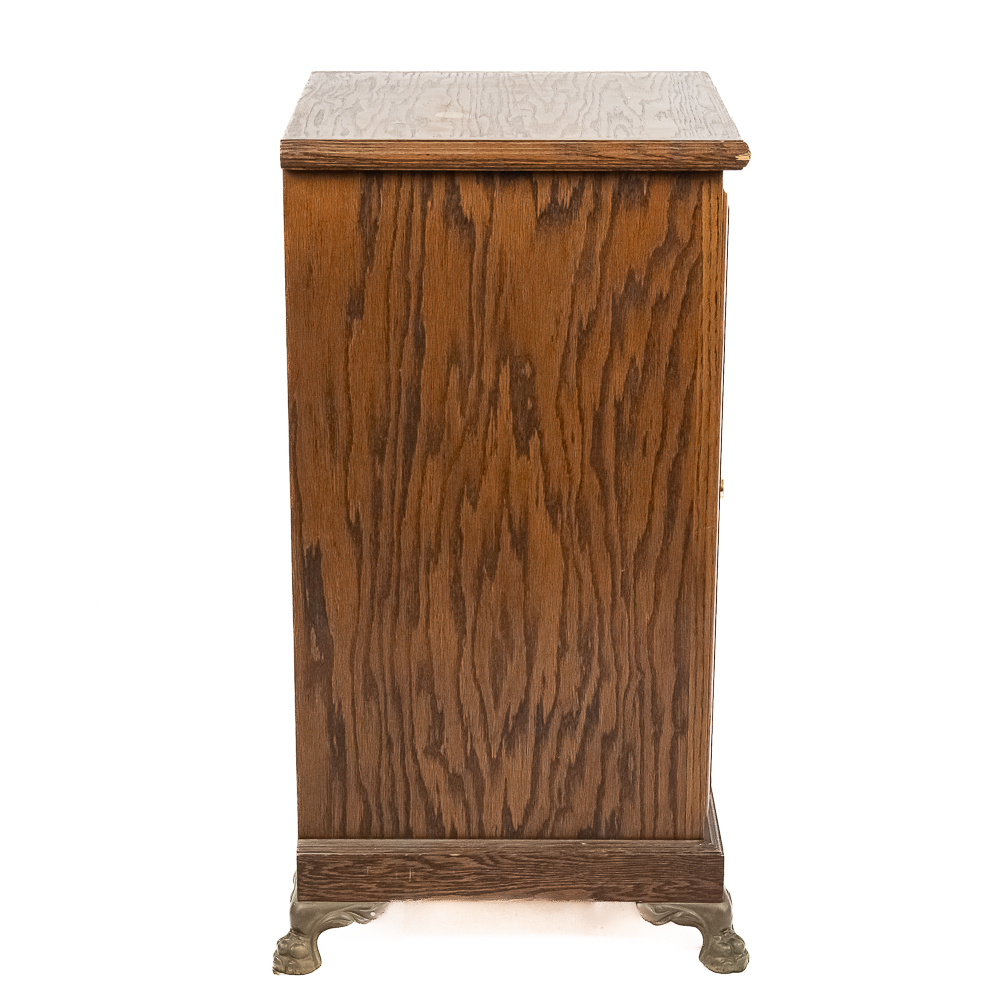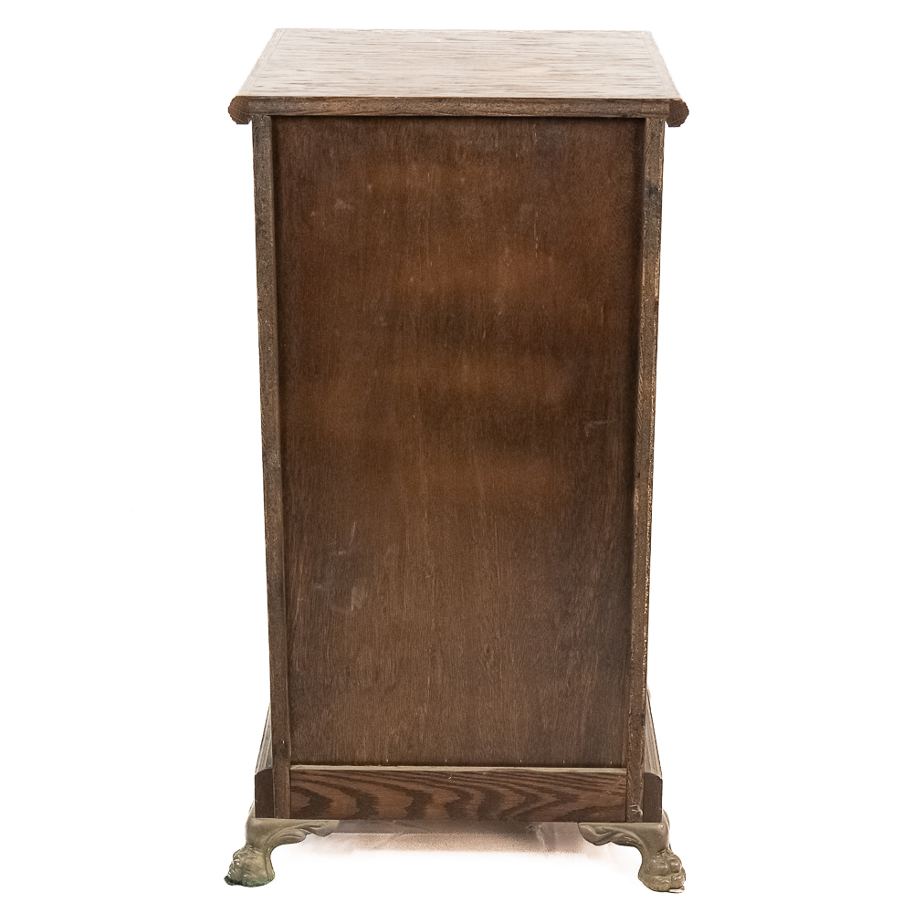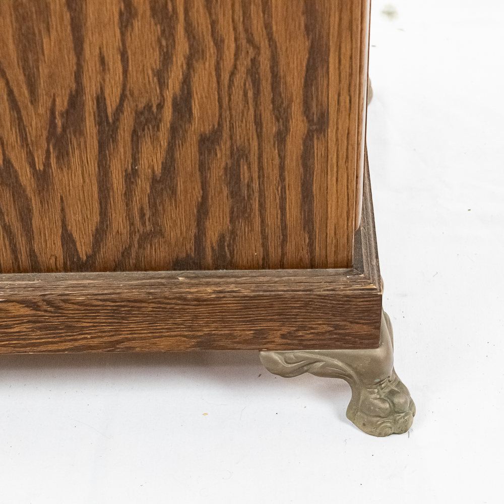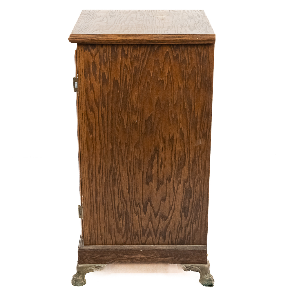 Contemporary made oak slot machine stand with a leaded glass front door. The lock on the door has no key but is currently unlocked. Has metal paw feet. In good condition. Measures 17″ X 17″ X 33″T.