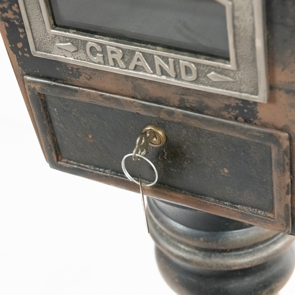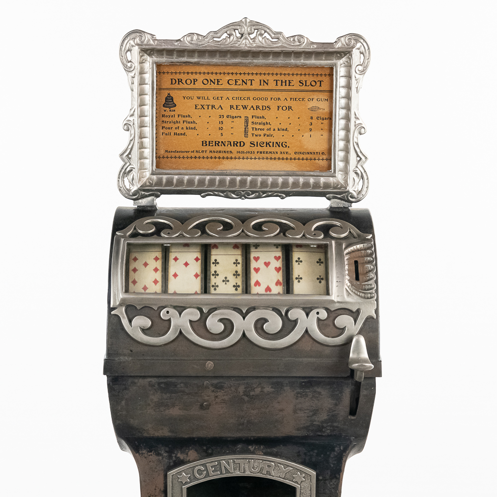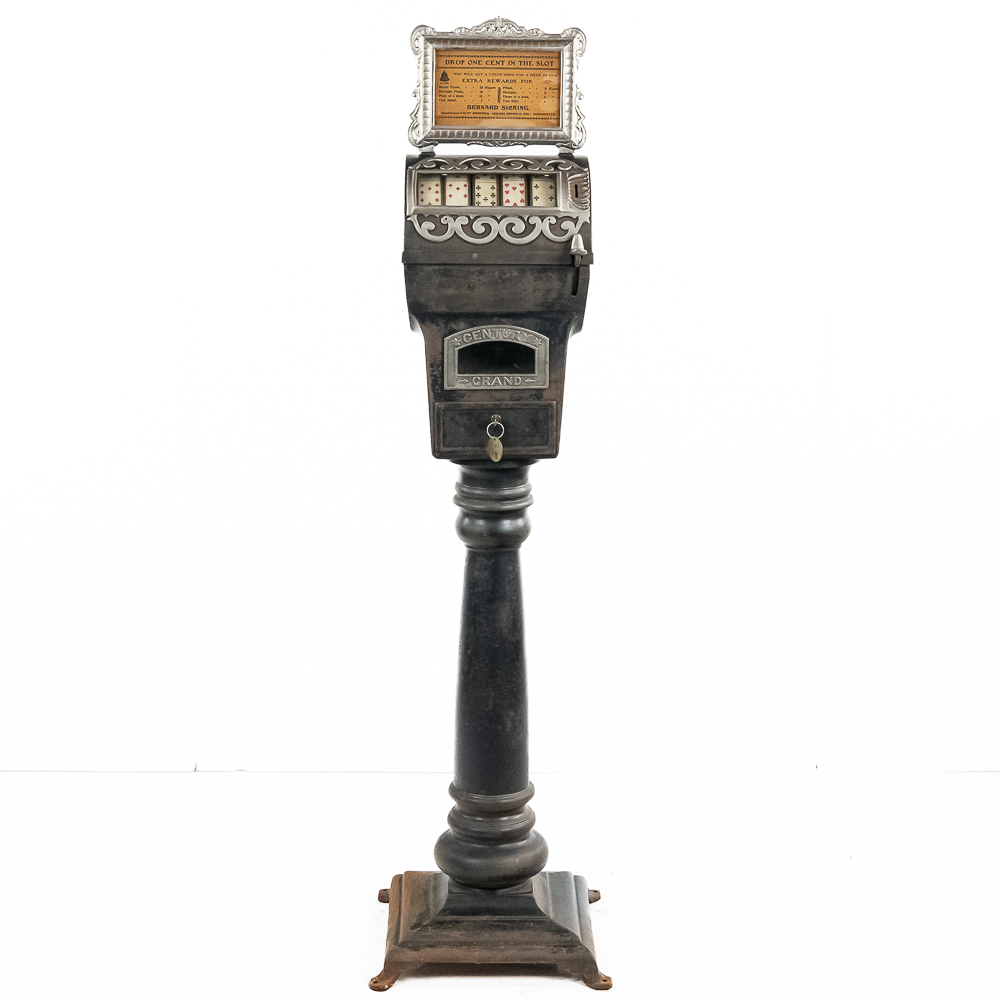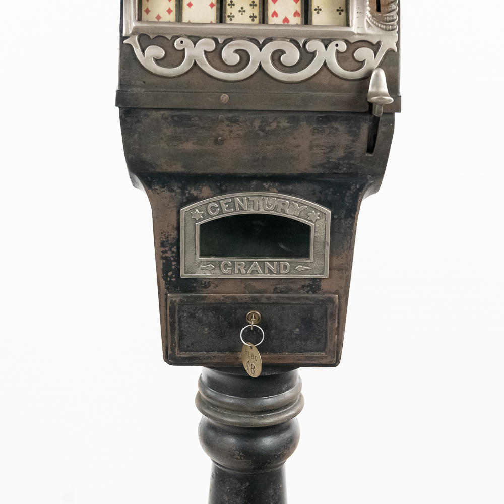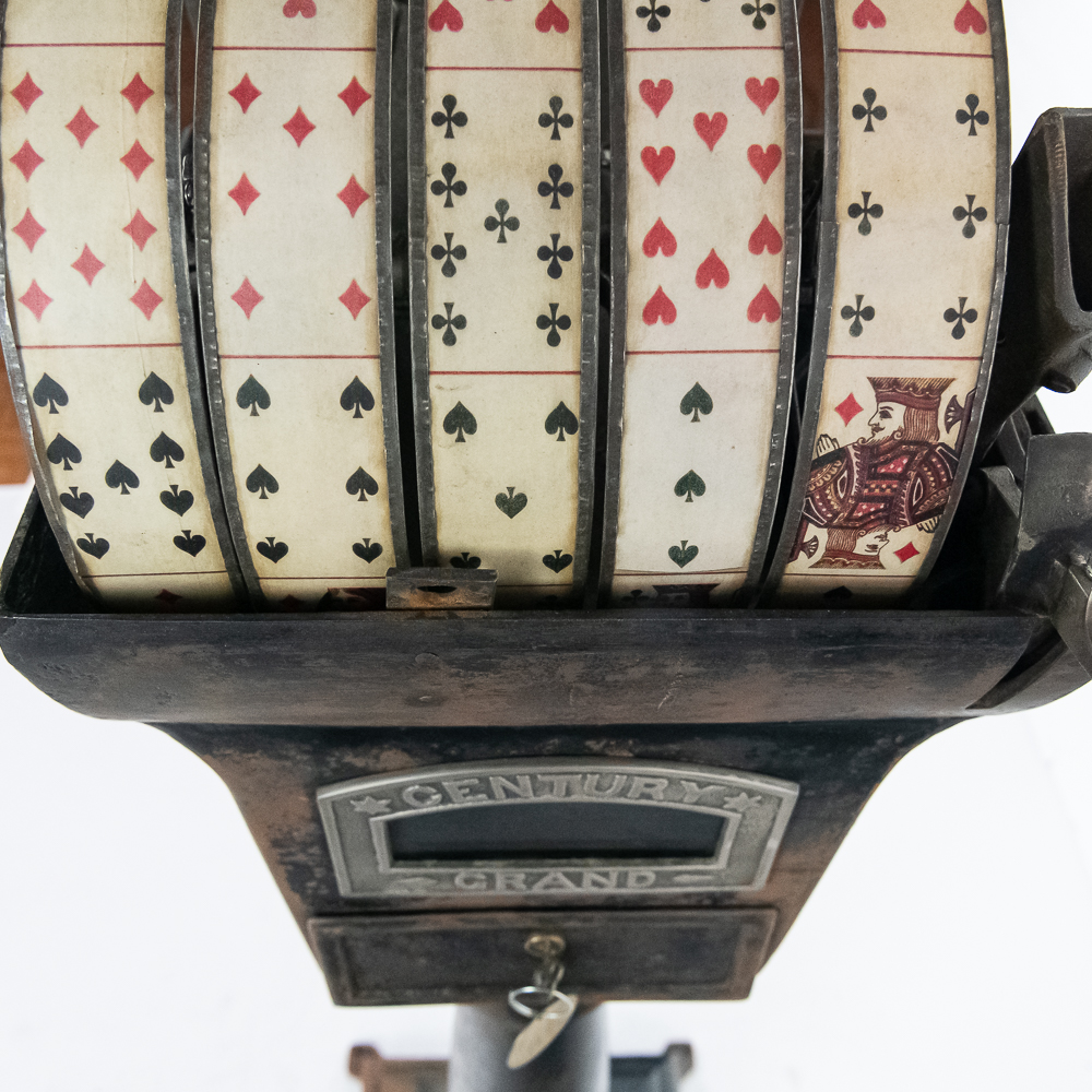 Looks to be all original “rare” Mills Sicking poker 5 reel trade stimulator on a shapely cast iron pedestal. Has coin door with lock and key, marquee and card. Works well, condition good, is missing some original finish. See photos.