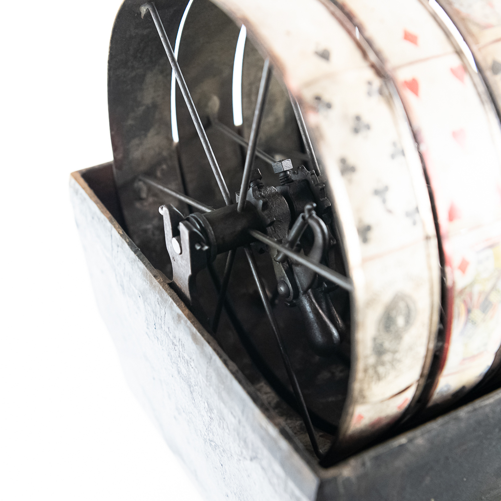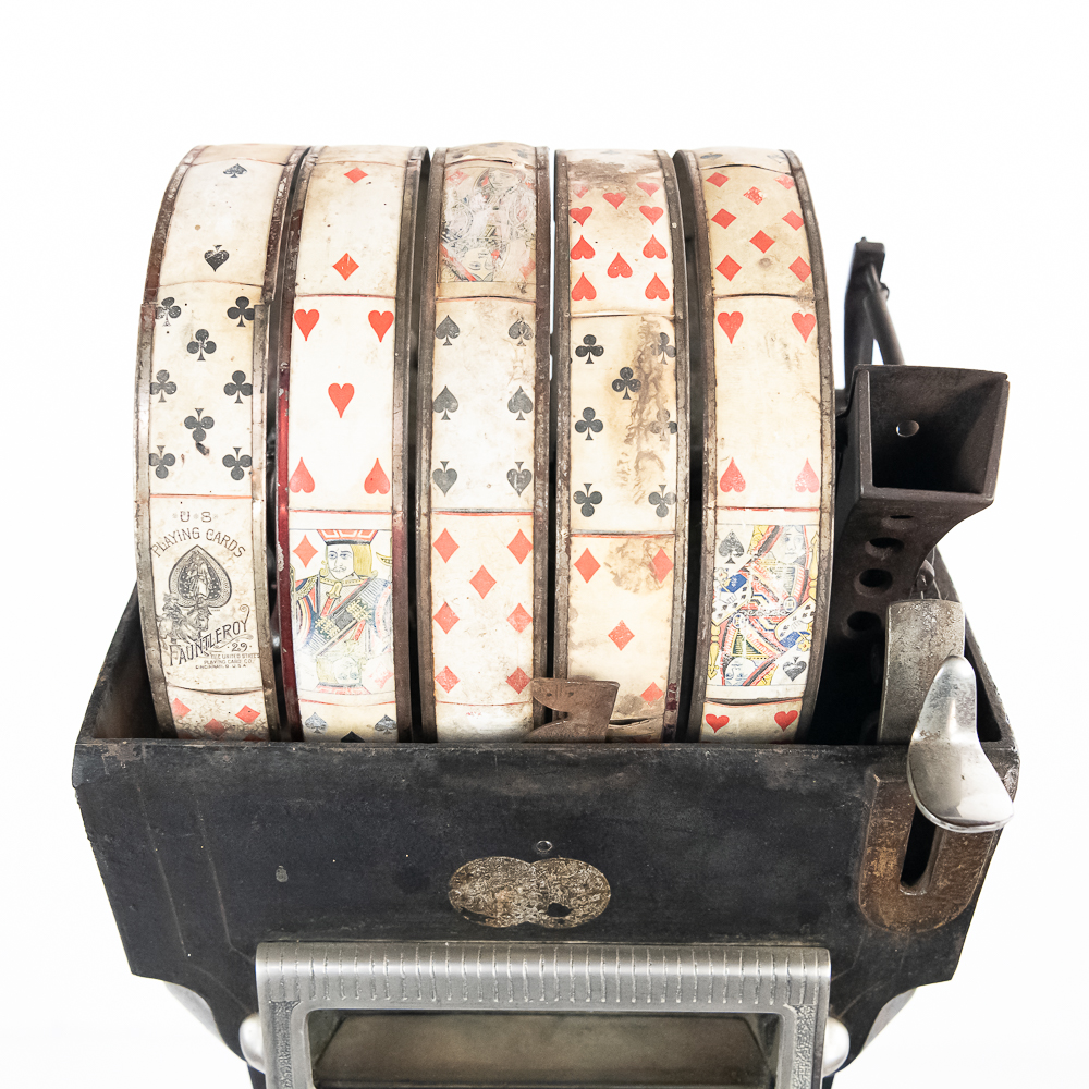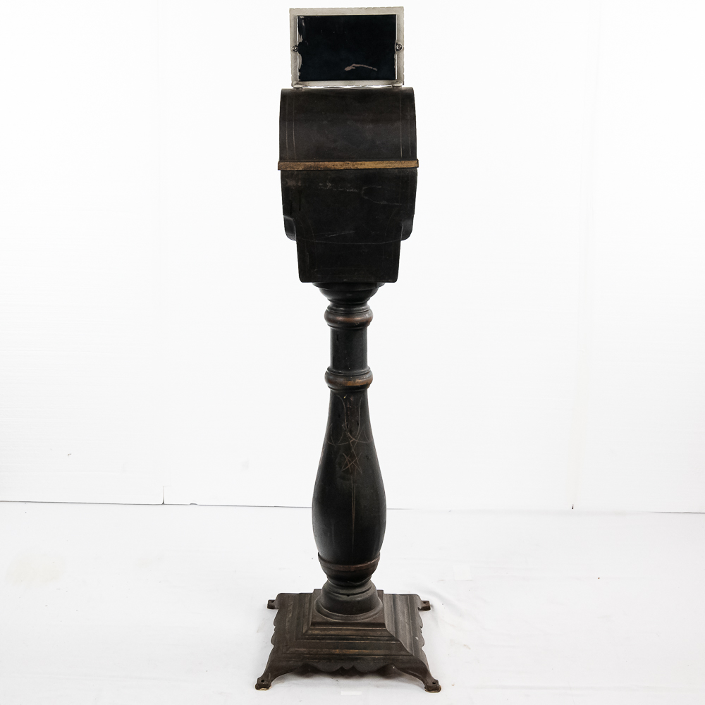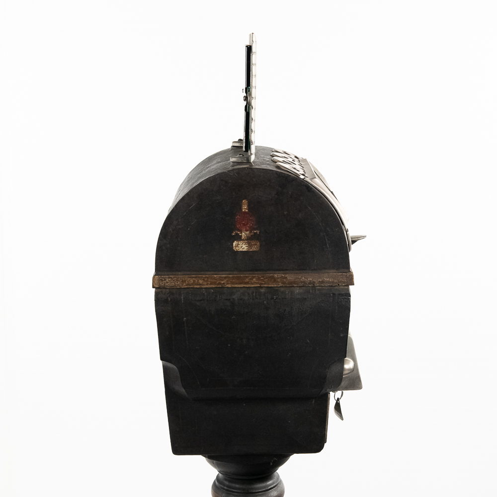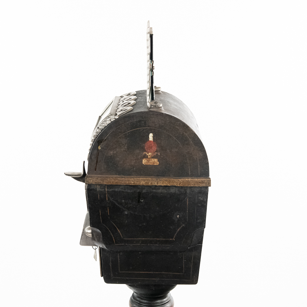 Original trade stimulator and marquee with some paint and pinstriping missing. Has original coin door that has a lock and key. Good working machine with a shapely pedestal with the distinctive Mill’s front decorative trim. Overall good condition. 58″ high x 16″ wide x 16″ deep
