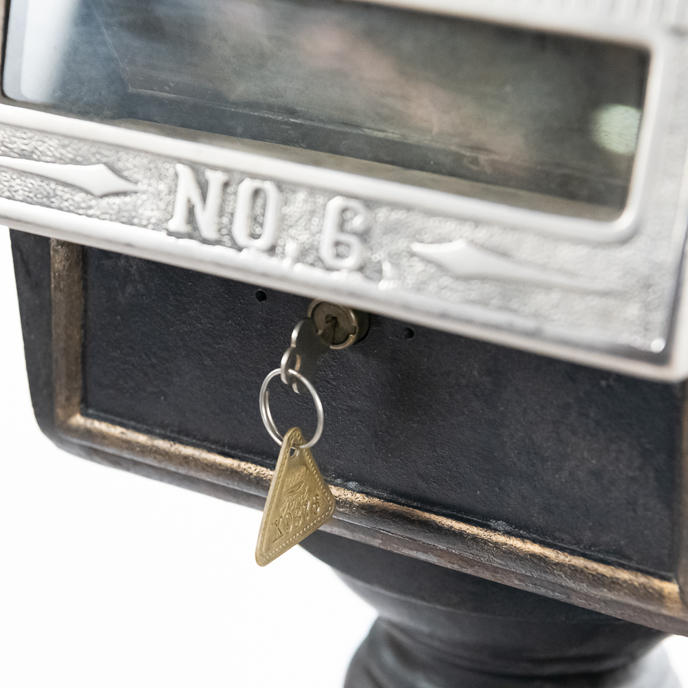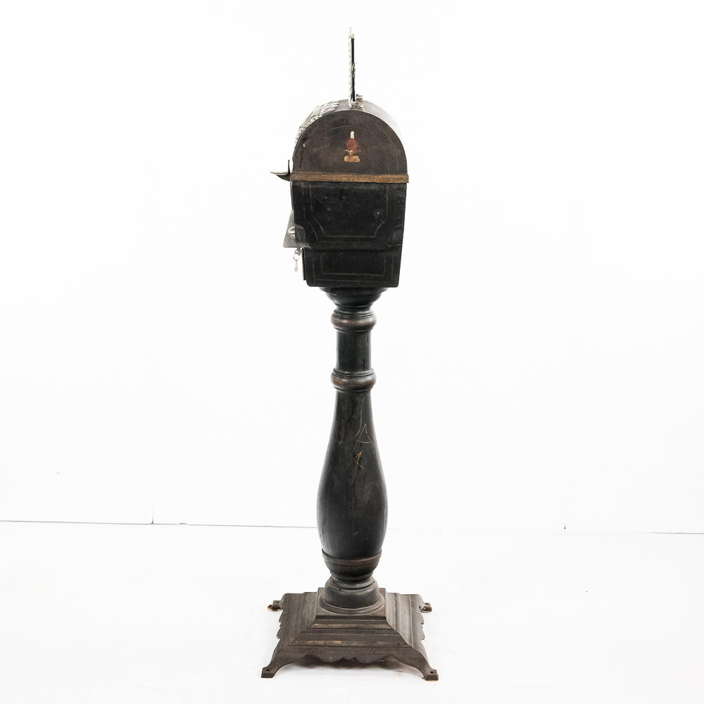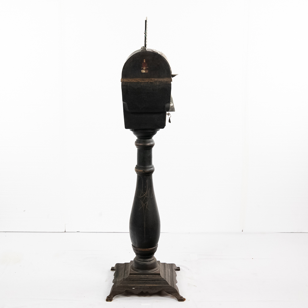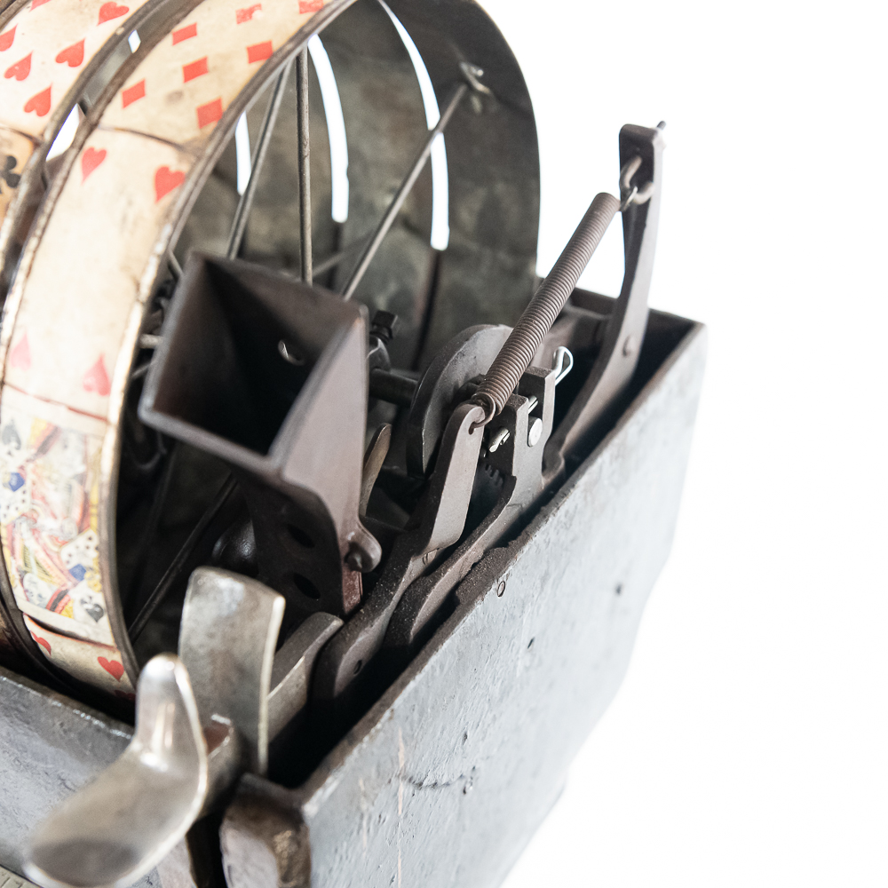 Original trade stimulator and marquee with some paint and pinstriping missing. Has original coin door that has a lock and key. Good working machine with a shapely pedestal with the distinctive Mill’s front decorative trim. Overall good condition. 58″ high x 16″ wide x 16″ deep