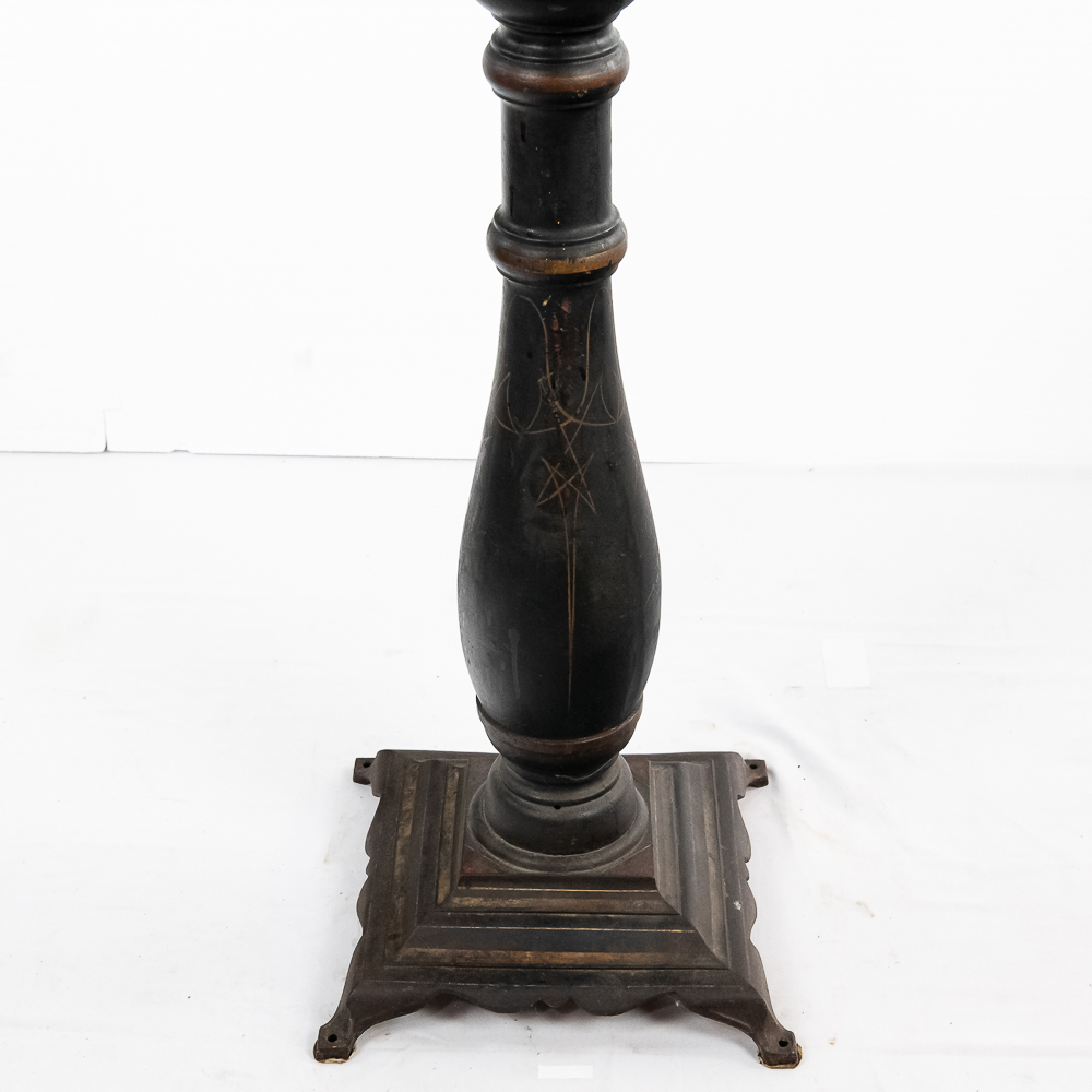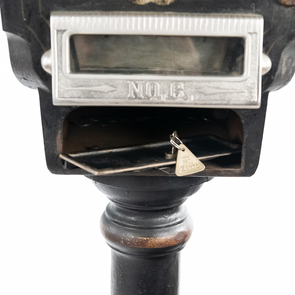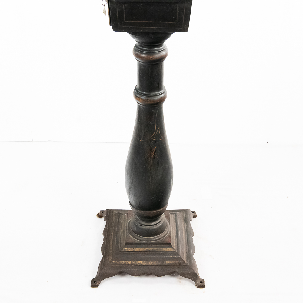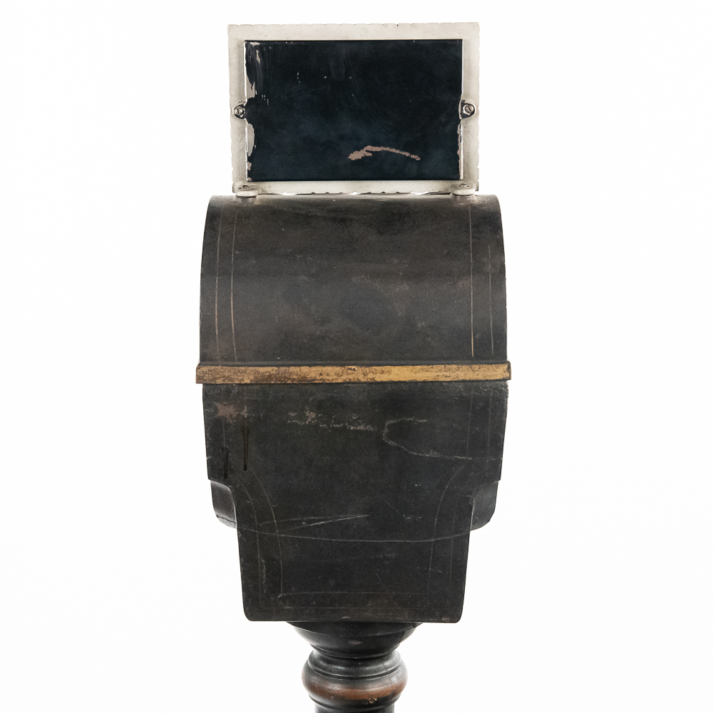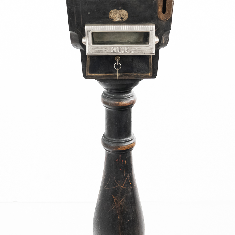 Original trade stimulator and marquee with some paint and pinstriping missing. Has original coin door that has a lock and key. Good working machine with a shapely pedestal with the distinctive Mill’s front decorative trim. Overall good condition. 58″ high x 16″ wide x 16″ deep