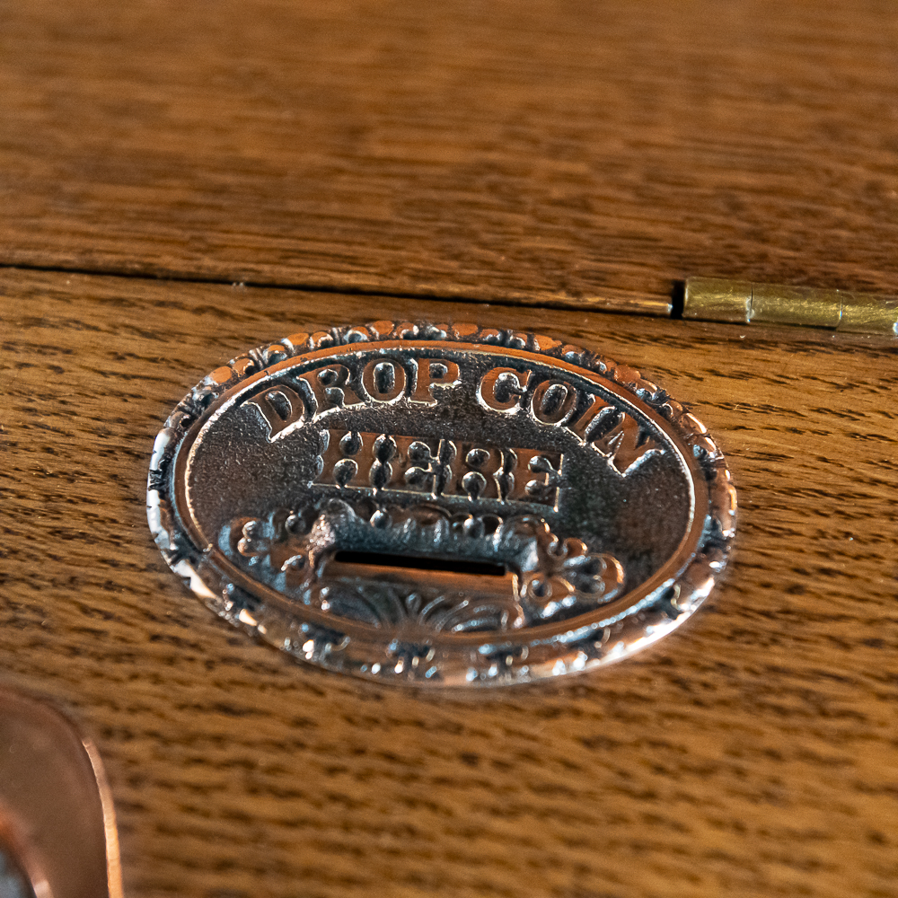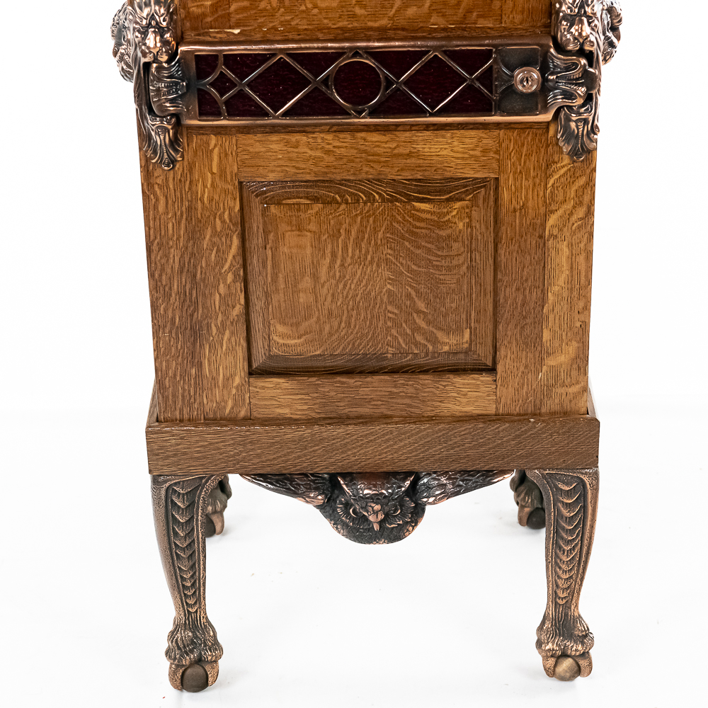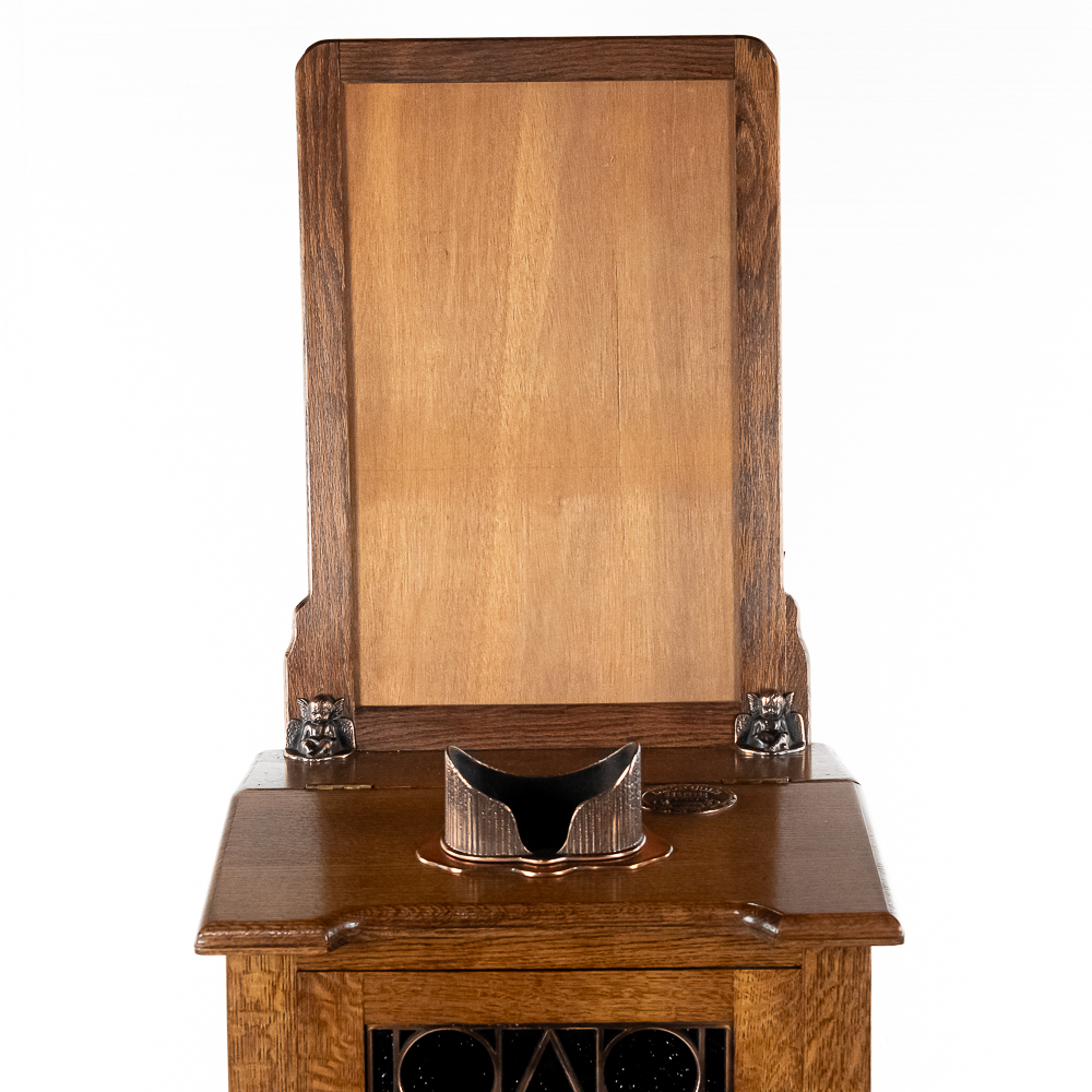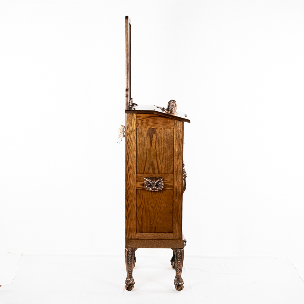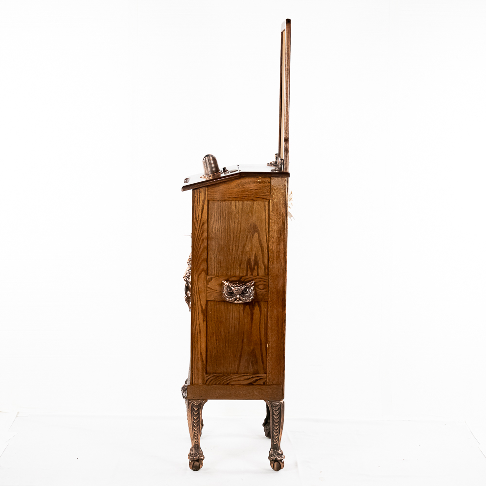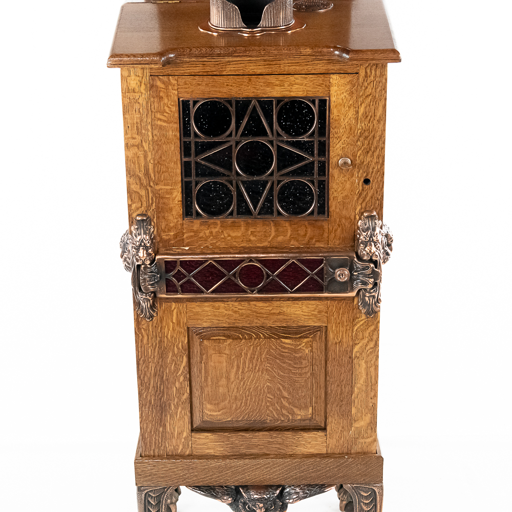 This attractive machine in its oak cabinet has attractive iron castings several of which feature the Mills Co. owl trademark as well as lion heads all of which have been replated in oxidized copper. It sits atop 4 ball and claw legs. It is our opinion that the marquee and the majority, if not the entire oak cabinet, has been recreated and copied completely from the original. Looks and presents well as it is. The spring wound mechanism appears to be unrestored and appears to be fairly complete with most of its parts. However may be missing some pieces. There are no viewing cards. Has one cabinet key. This machine with the marquee measures 72″ T X 16″ D X 20″ W.