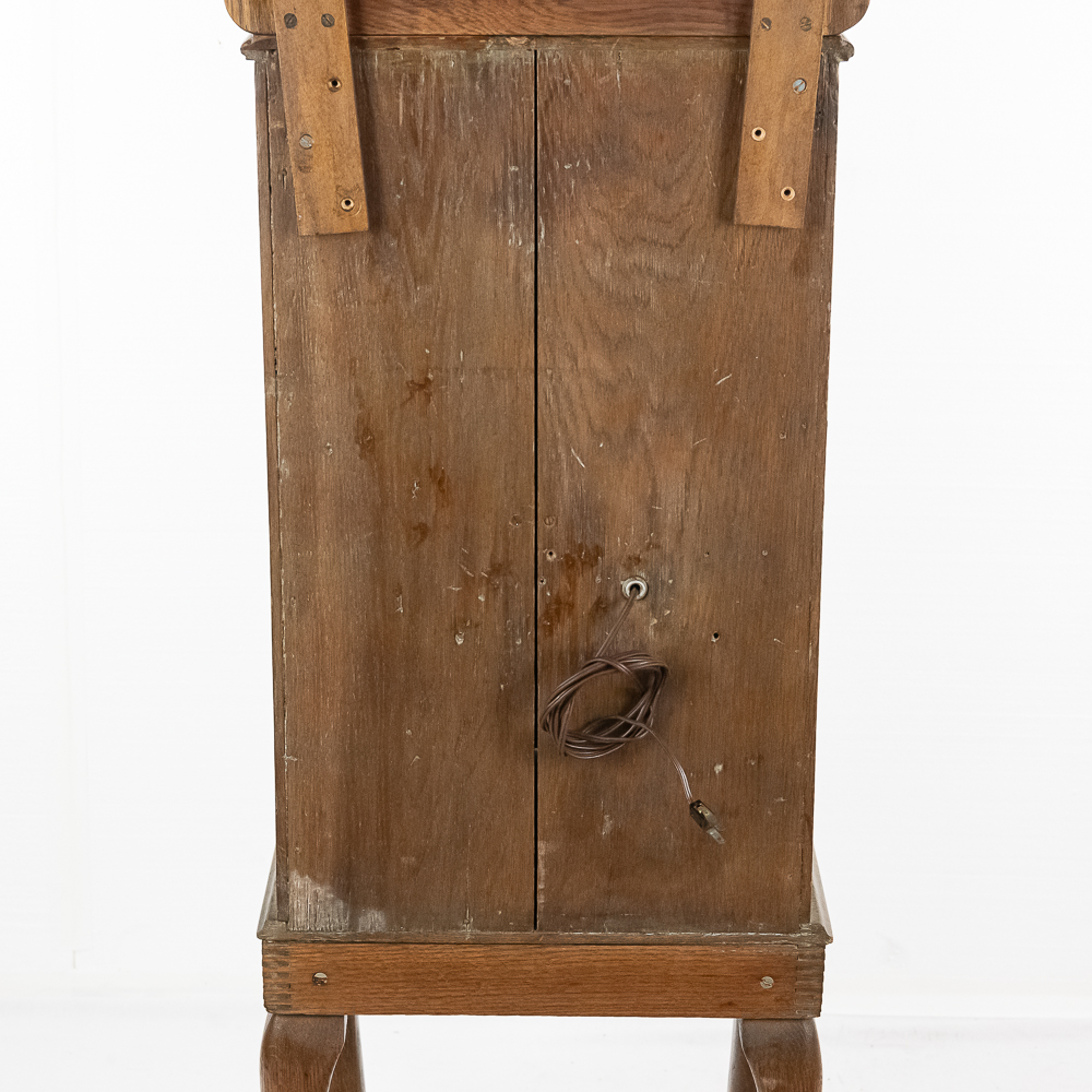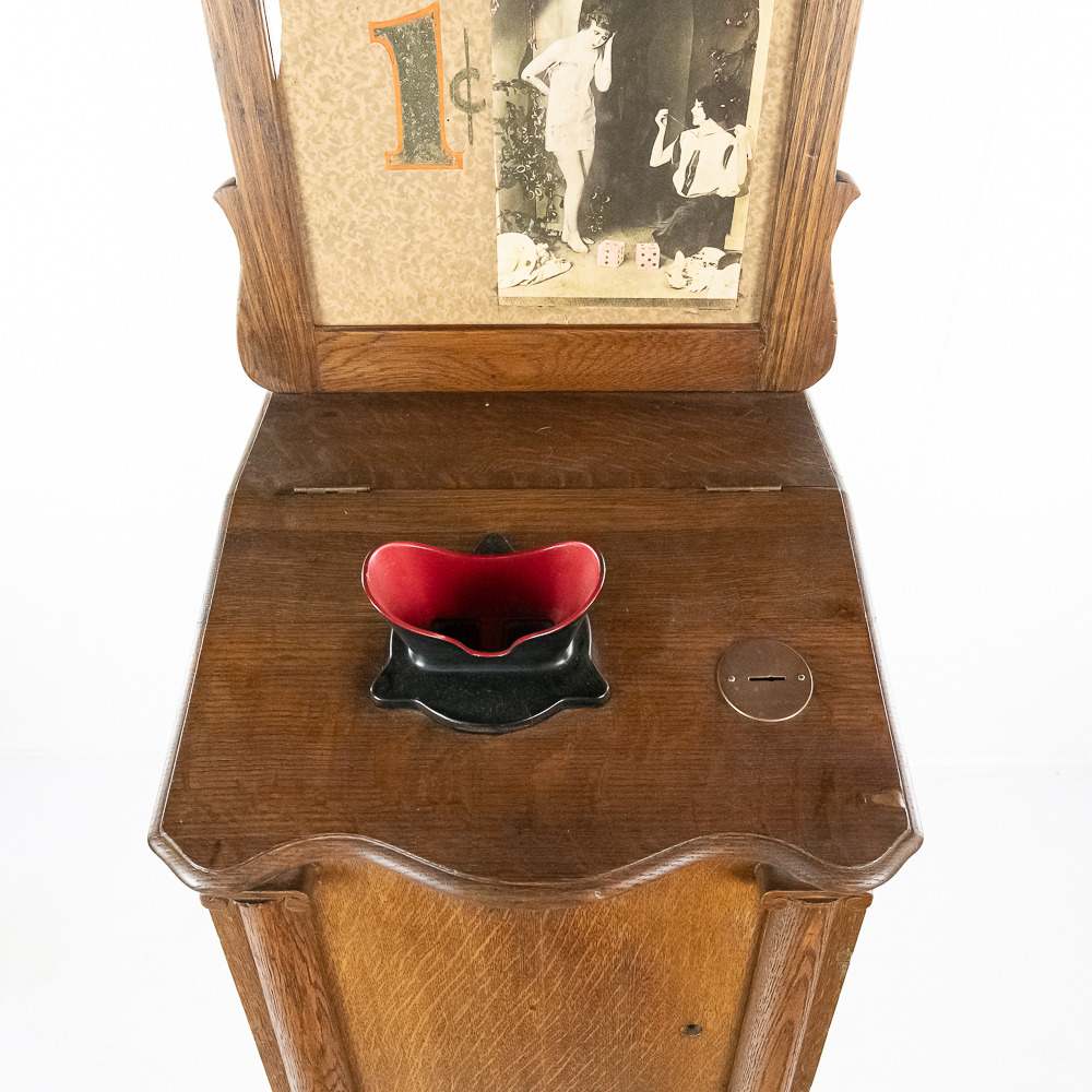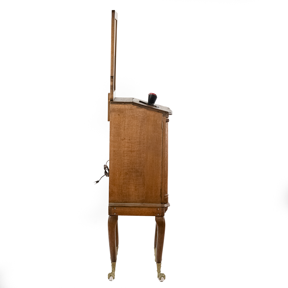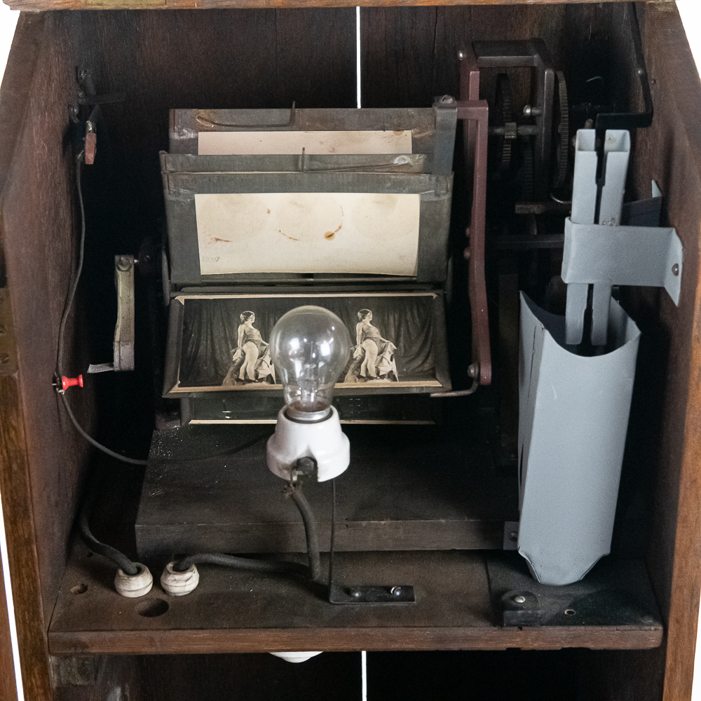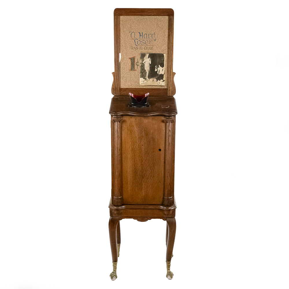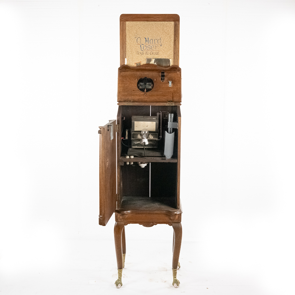 *NO SHIPPING – PICKUP OR THIRD PARTY TRANSPORT ONLY* Nice original oak case, floor model Rosenfeld stereo card viewer with oak frame marquee with movie advertising insert. Missing front panel door lock but looks to be complete with nice decorative front oak columns. Original spring wound motor intact and working but no winding crankis included. The motor was tested using a crank from another machine. The battery light has been replaced with a 110v lamp and plug. The plug needs replacing. Overall good condition. The mech cycles properly but the light bulb timing is off by one card and needs adjustment. (light bulb turns off 1 card too soon and then comes back on). Original risque girlie card set included. 72" high x 18" wide x 16" deep.
