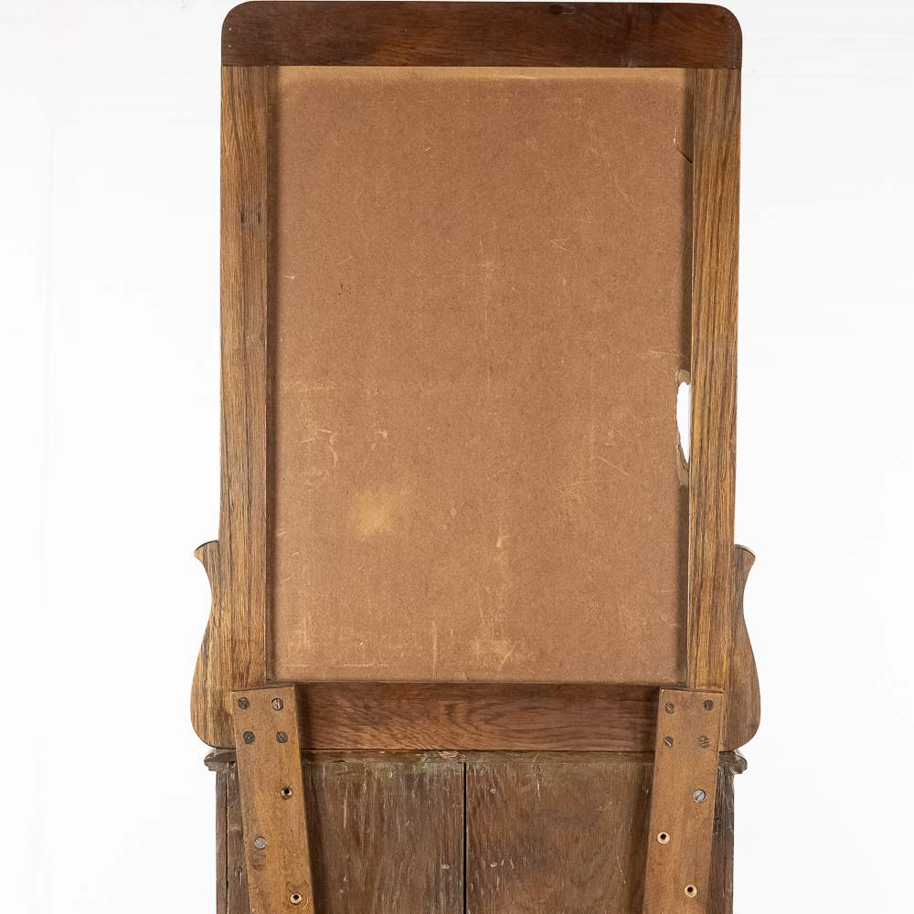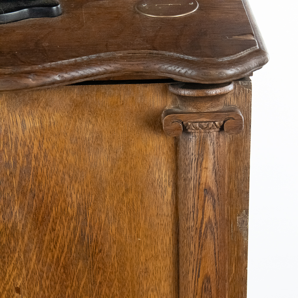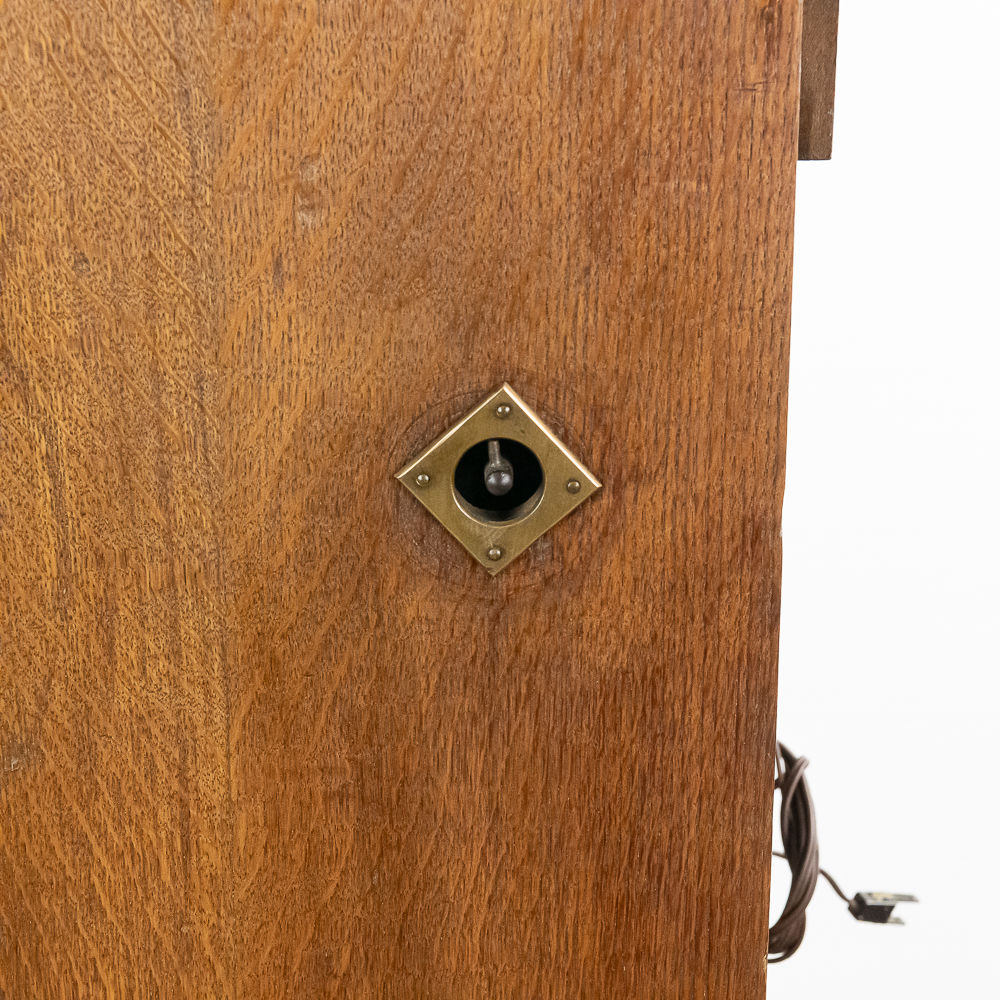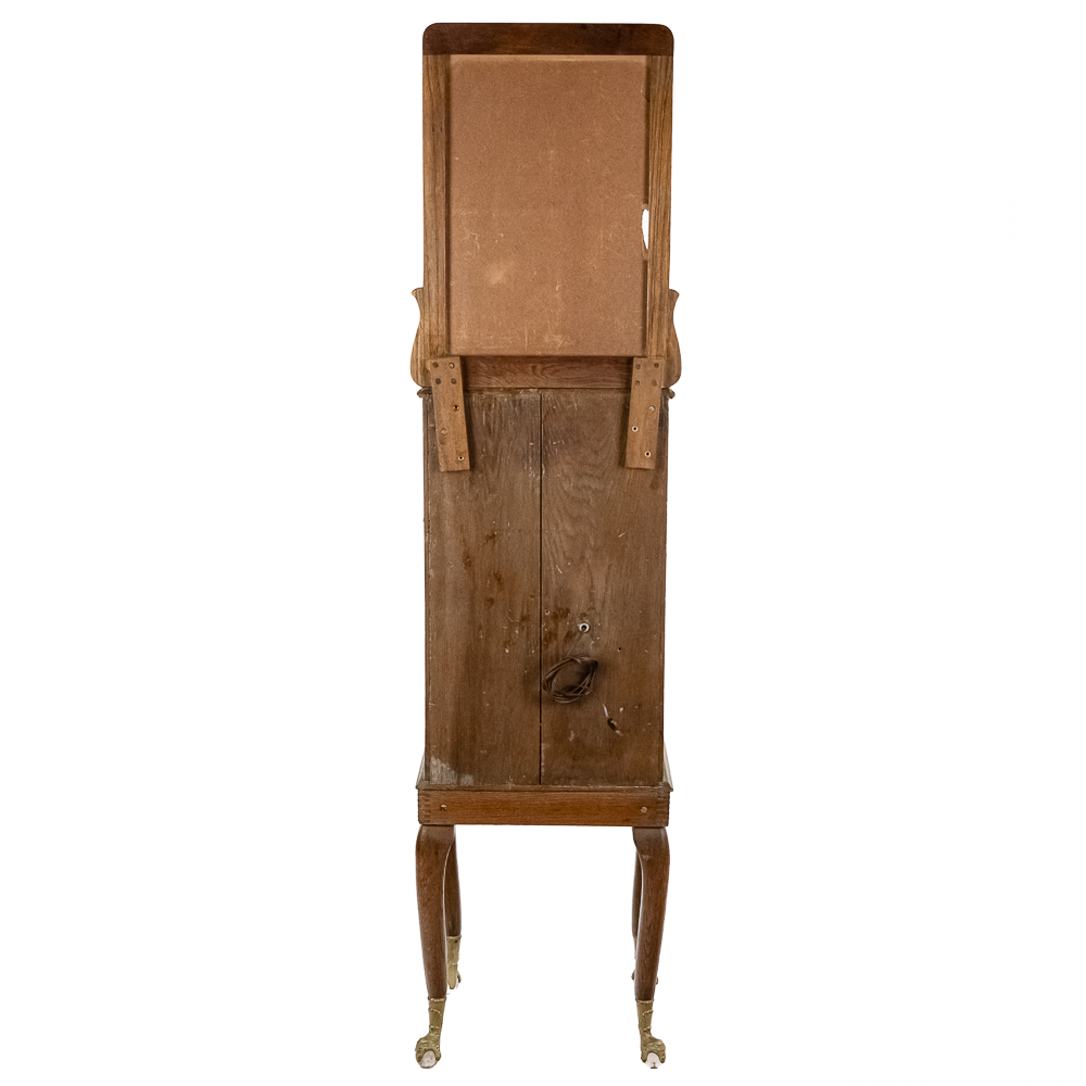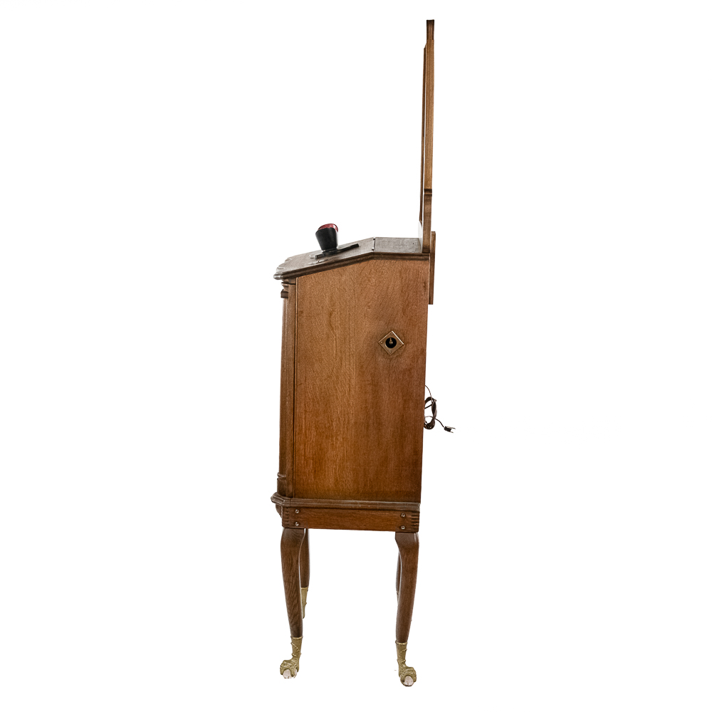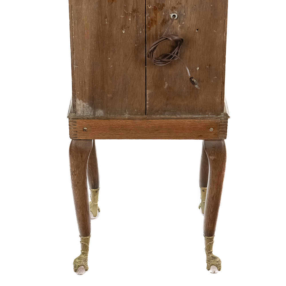 *NO SHIPPING – PICKUP OR THIRD PARTY TRANSPORT ONLY* Nice original oak case, floor model Rosenfeld stereo card viewer with oak frame marquee with movie advertising insert. Missing front panel door lock but looks to be complete with nice decorative front oak columns. Original spring wound motor intact and working but no winding crankis included. The motor was tested using a crank from another machine. The battery light has been replaced with a 110v lamp and plug. The plug needs replacing. Overall good condition. The mech cycles properly but the light bulb timing is off by one card and needs adjustment. (light bulb turns off 1 card too soon and then comes back on). Original risque girlie card set included. 72" high x 18" wide x 16" deep.