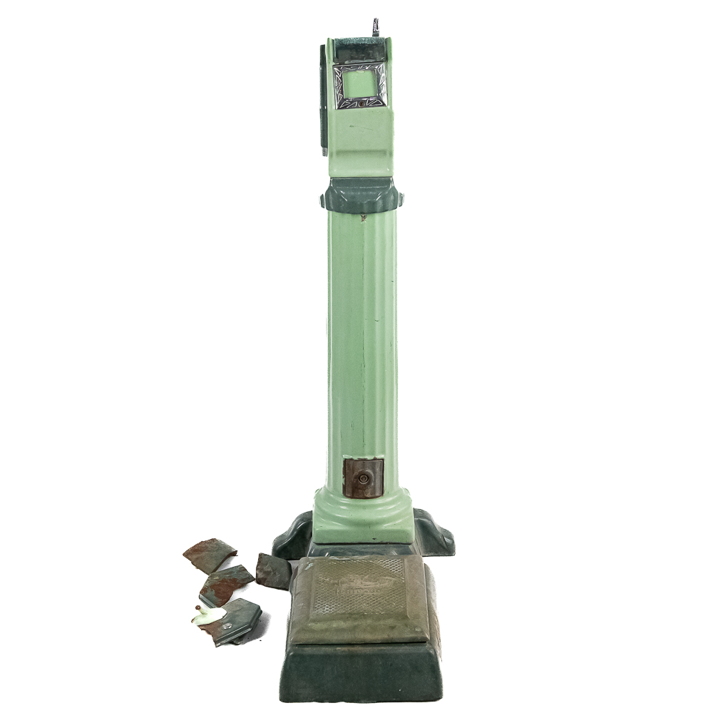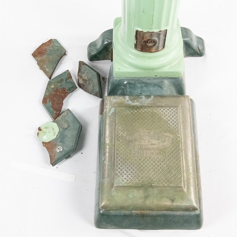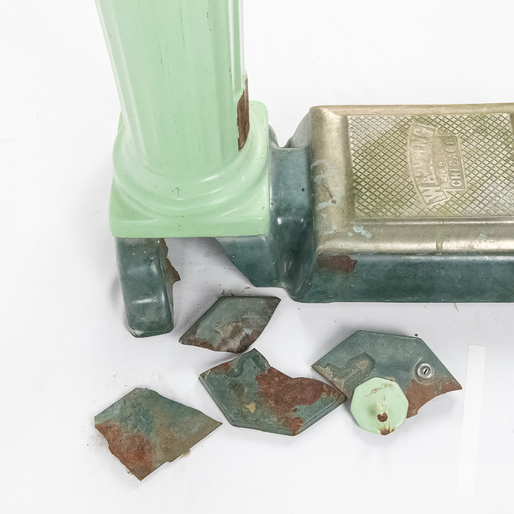 A very unusual, unique, porcelain stand-on scale. It has a fluted pedestal and a different style look. Looks to be complete on the inside mechanism. The cast iron base has been broken along with the side cover, but all the pieces seem to be in a box and can be welded. This is a great restoration project for the person that collects the rare and unusual. Over the many years we have never seen one like this. Please see photos.
