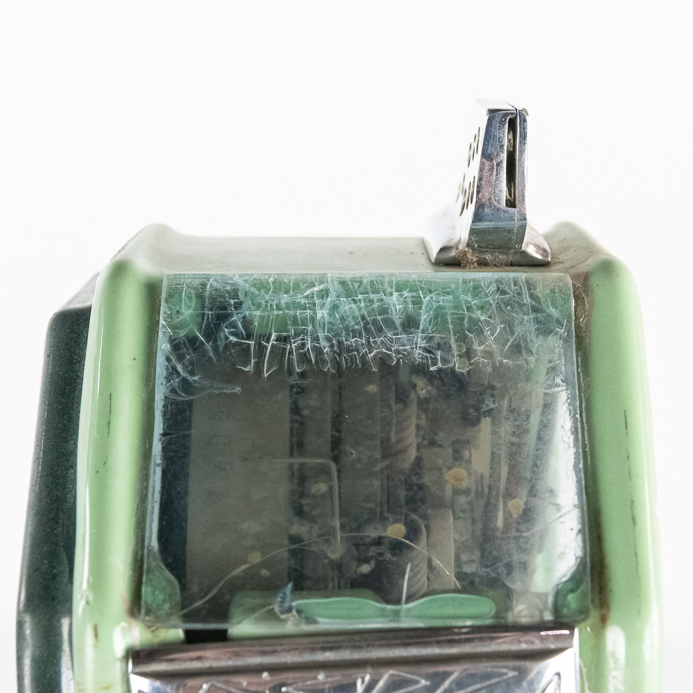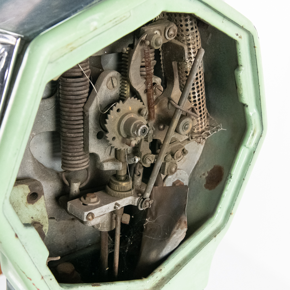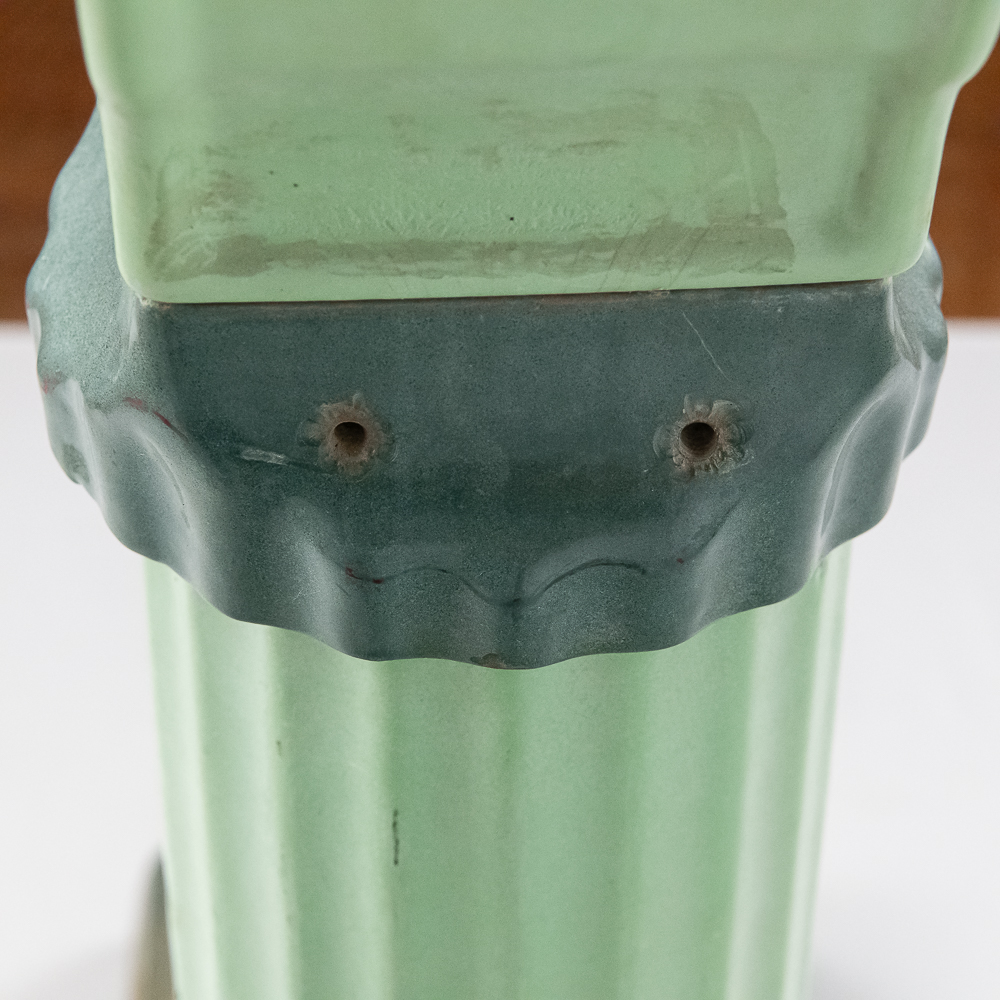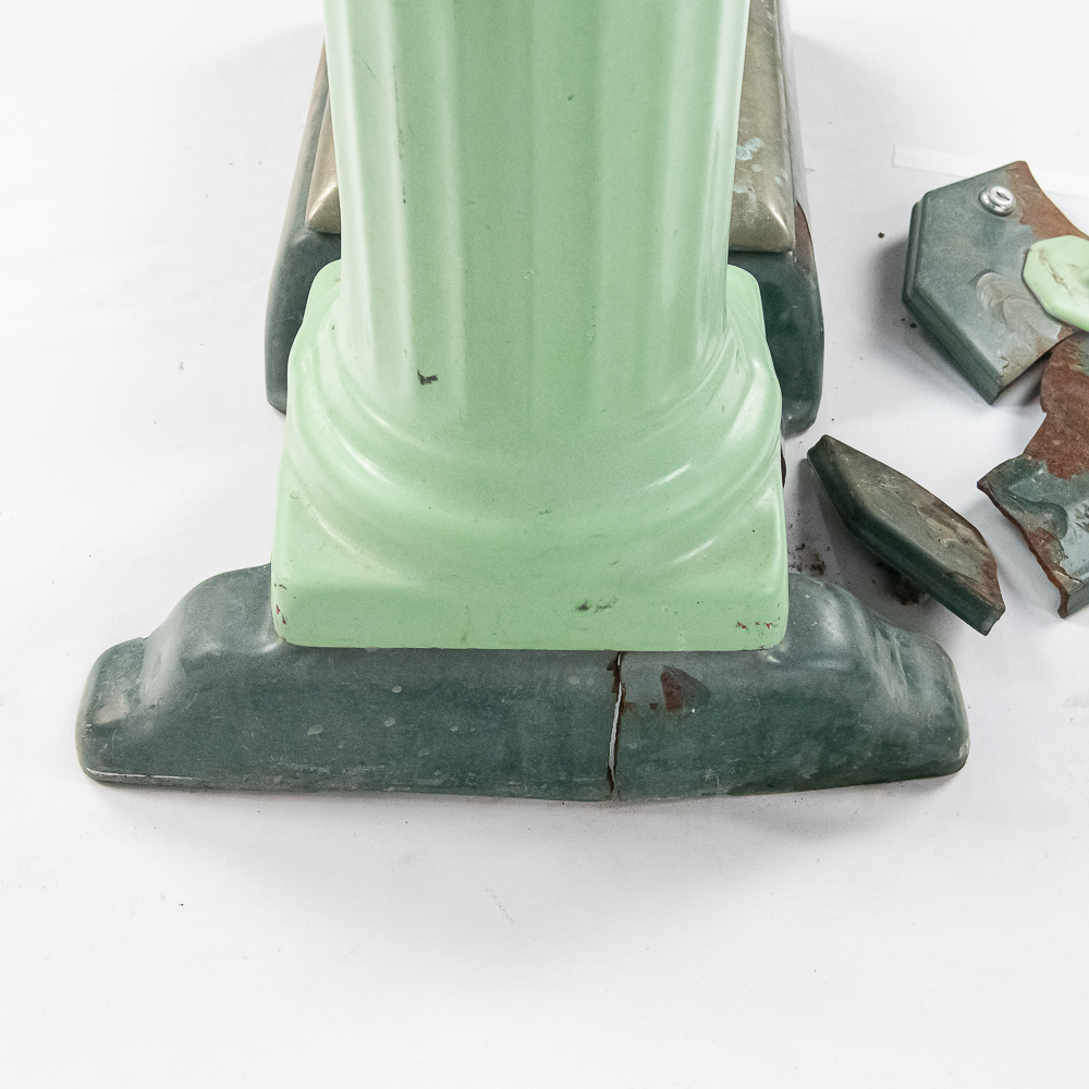 A very unusual, unique, porcelain stand-on scale. It has a fluted pedestal and a different style look. Looks to be complete on the inside mechanism. The cast iron base has been broken along with the side cover, but all the pieces seem to be in a box and can be welded. This is a great restoration project for the person that collects the rare and unusual. Over the many years we have never seen one like this. Please see photos.