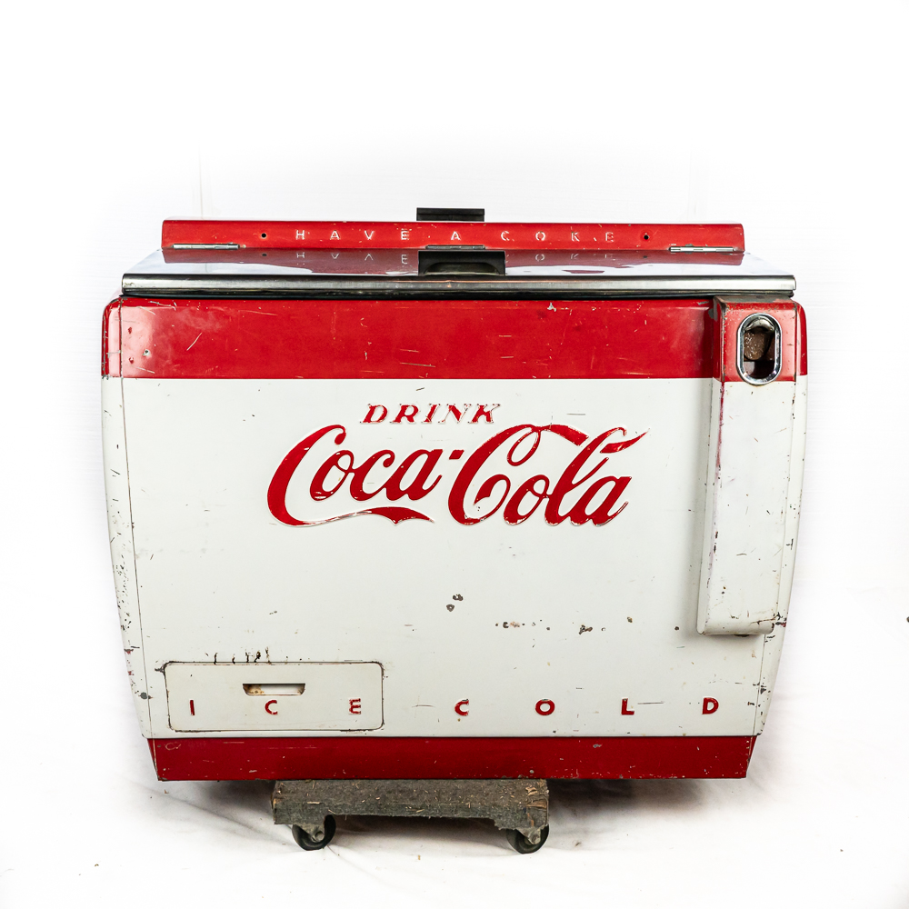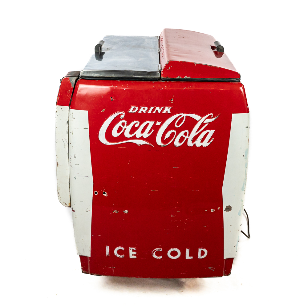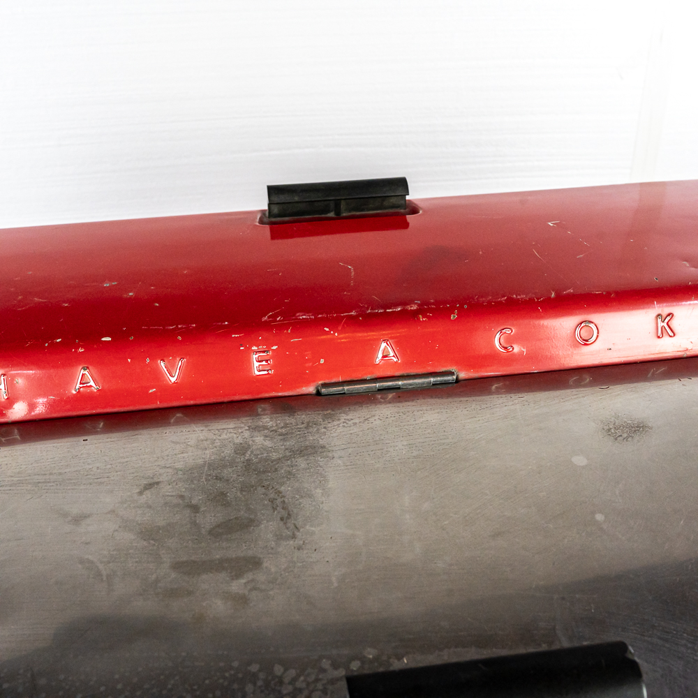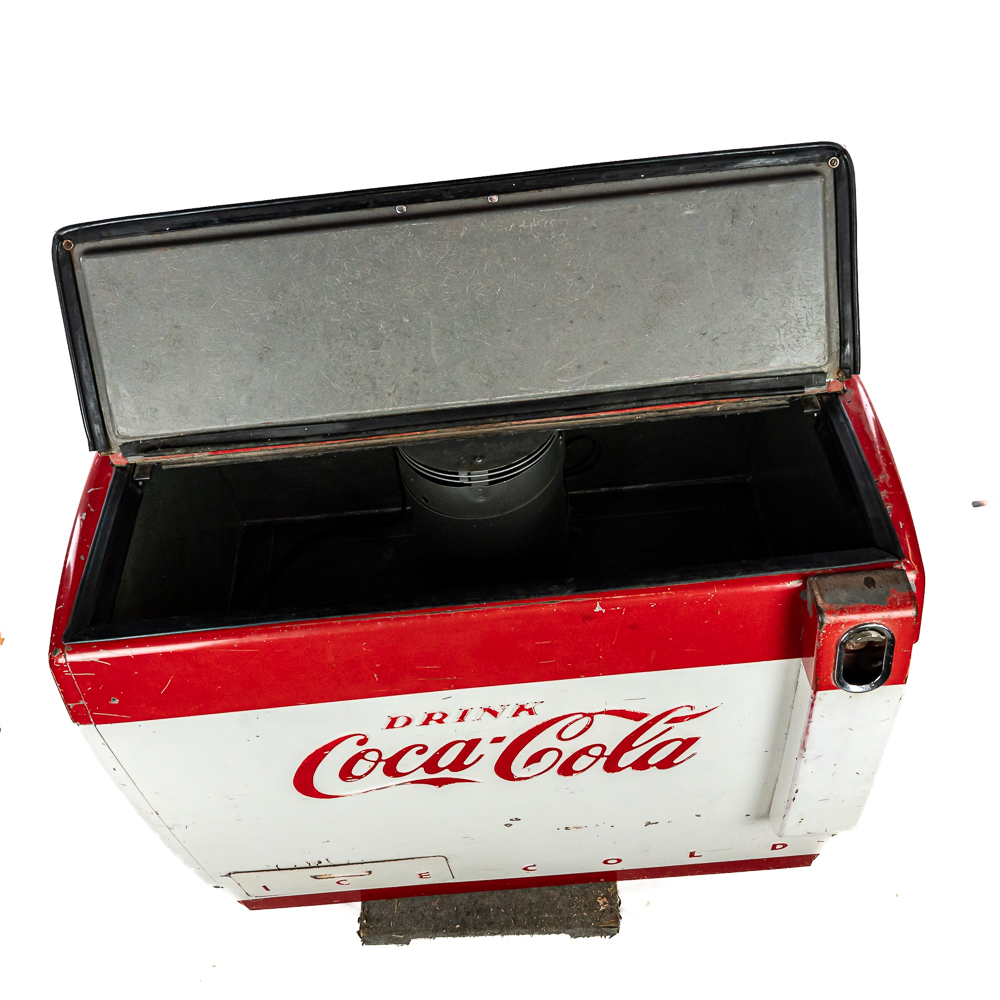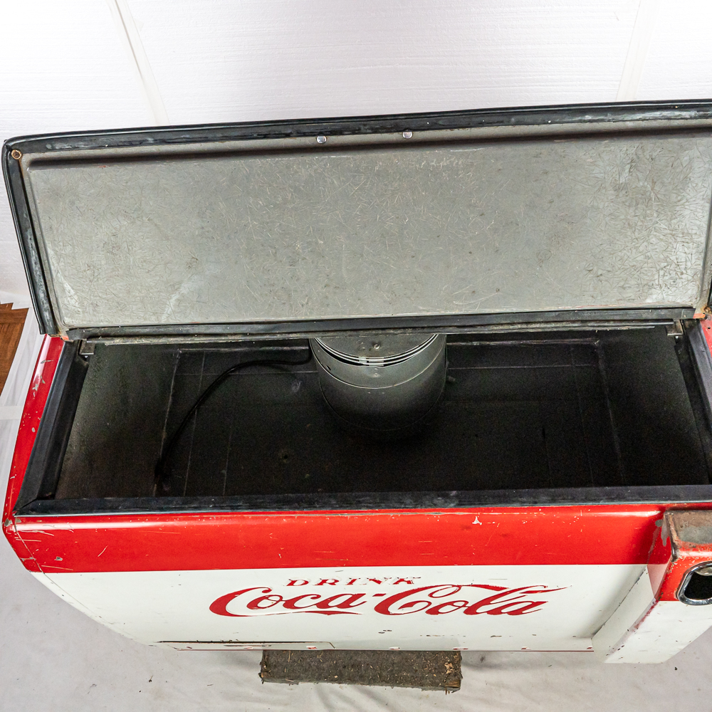 1960 Cavalier Coca-Cola Chest Model CMD-D cooler machine. Approximately 36″t x 28″w x 44″l and in good overall physical condition with some imperfections such as scratches, rub marks and discoloration / missing paint in some areas. A must have for any Coke a Cola enthusiast. Please use photos to judge condition and bid accordingly. The unit was plugged in and the fan and compressor runs and the chest cools.
