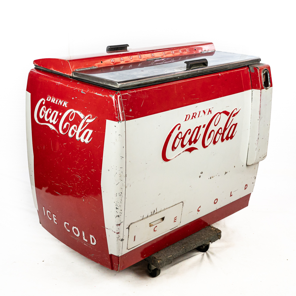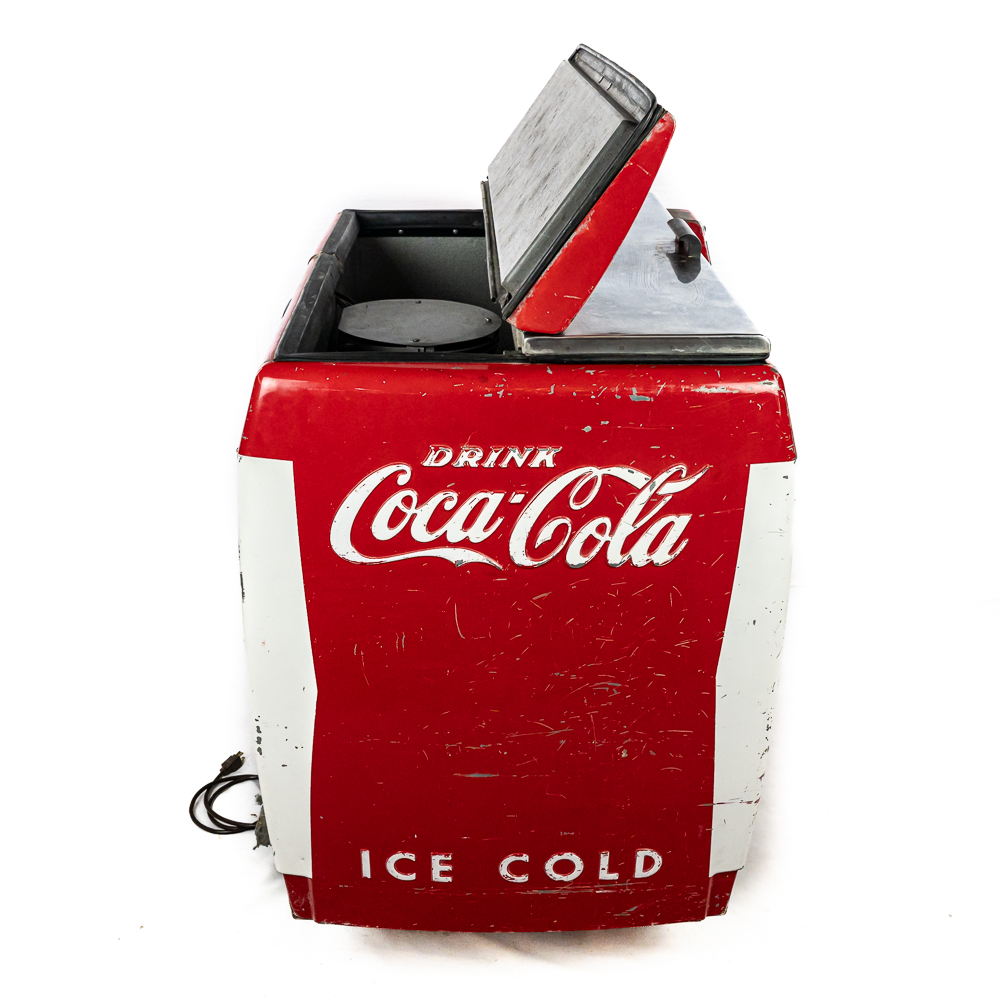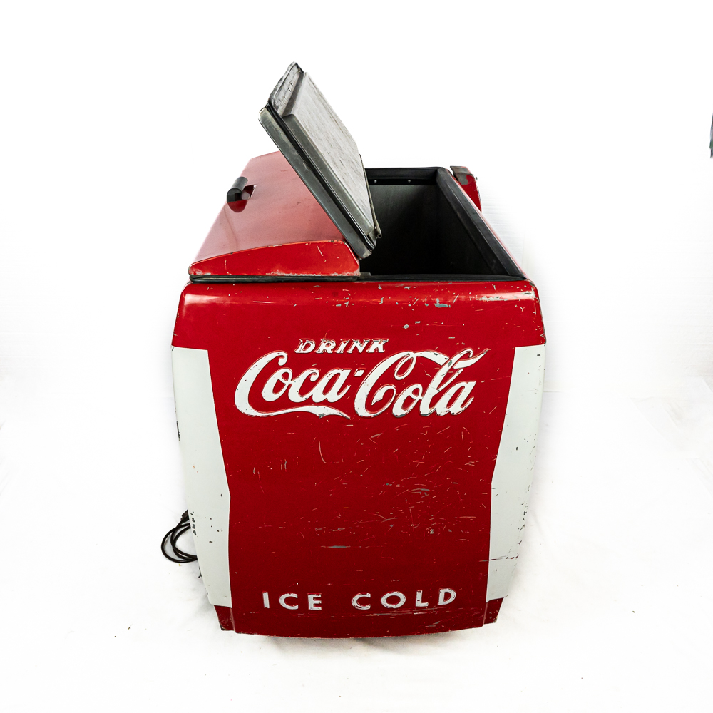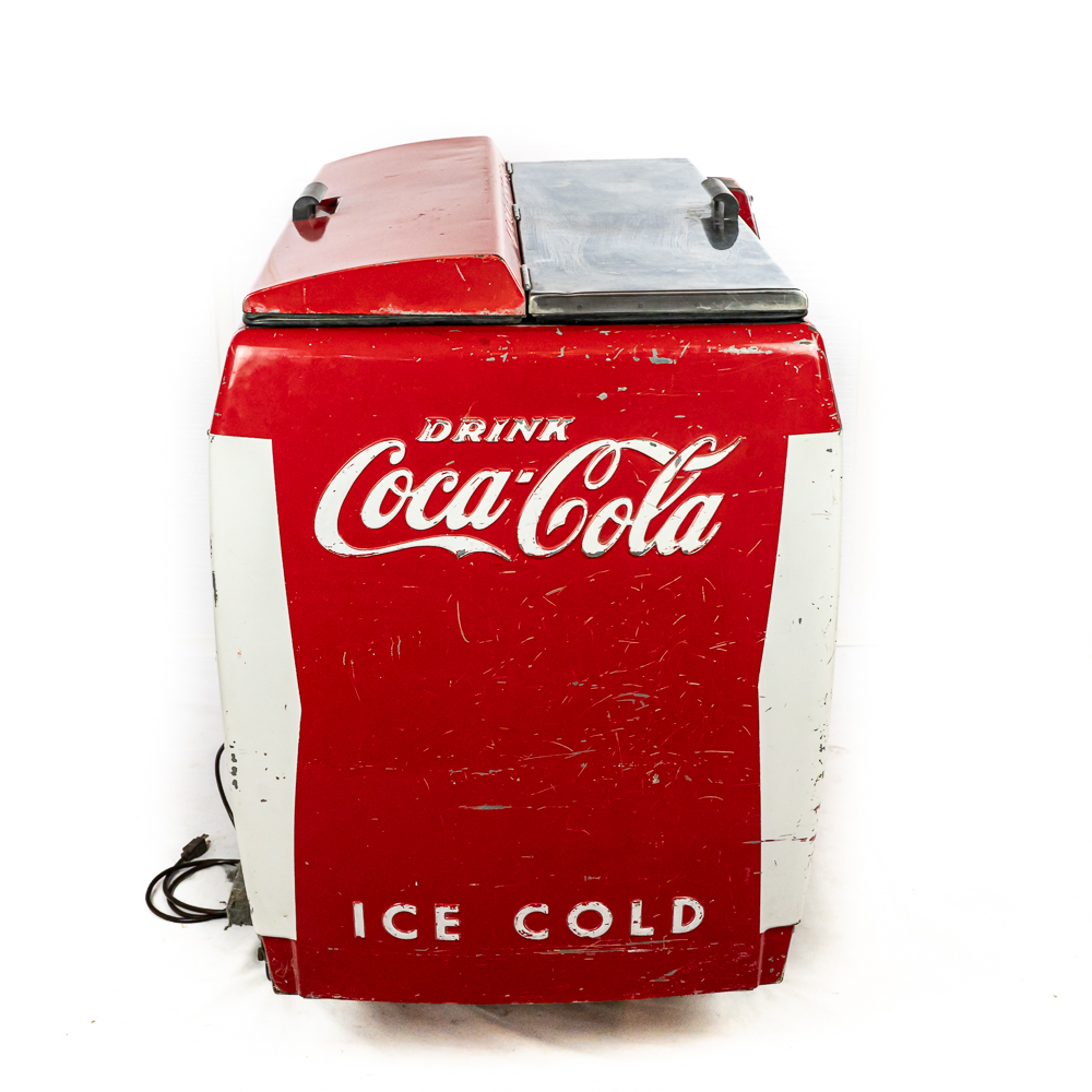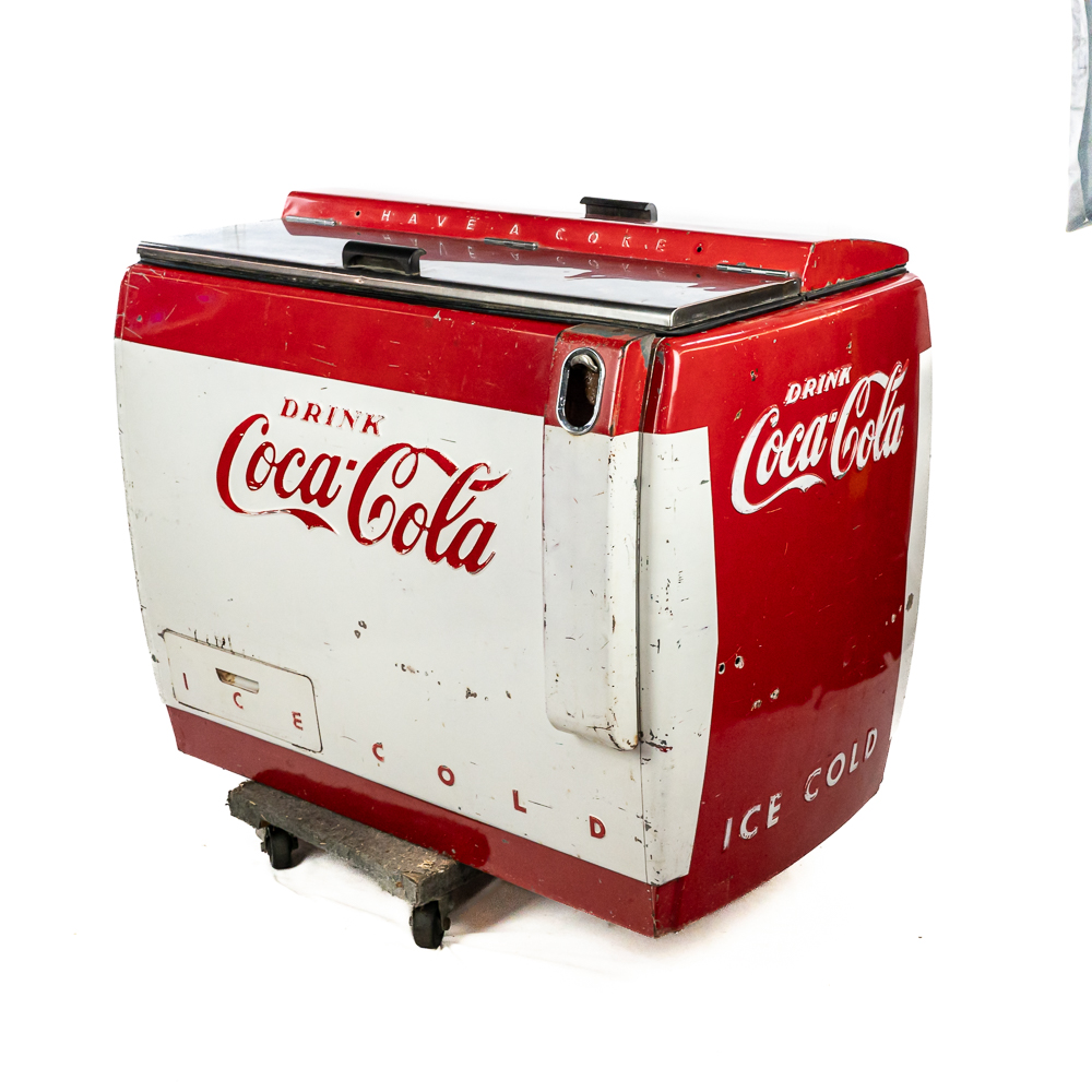 1960 Cavalier Coca-Cola Chest Model CMD-D cooler machine. Approximately 36″t x 28″w x 44″l and in good overall physical condition with some imperfections such as scratches, rub marks and discoloration / missing paint in some areas. A must have for any Coke a Cola enthusiast. Please use photos to judge condition and bid accordingly. The unit was plugged in and the fan and compressor runs and the chest cools.