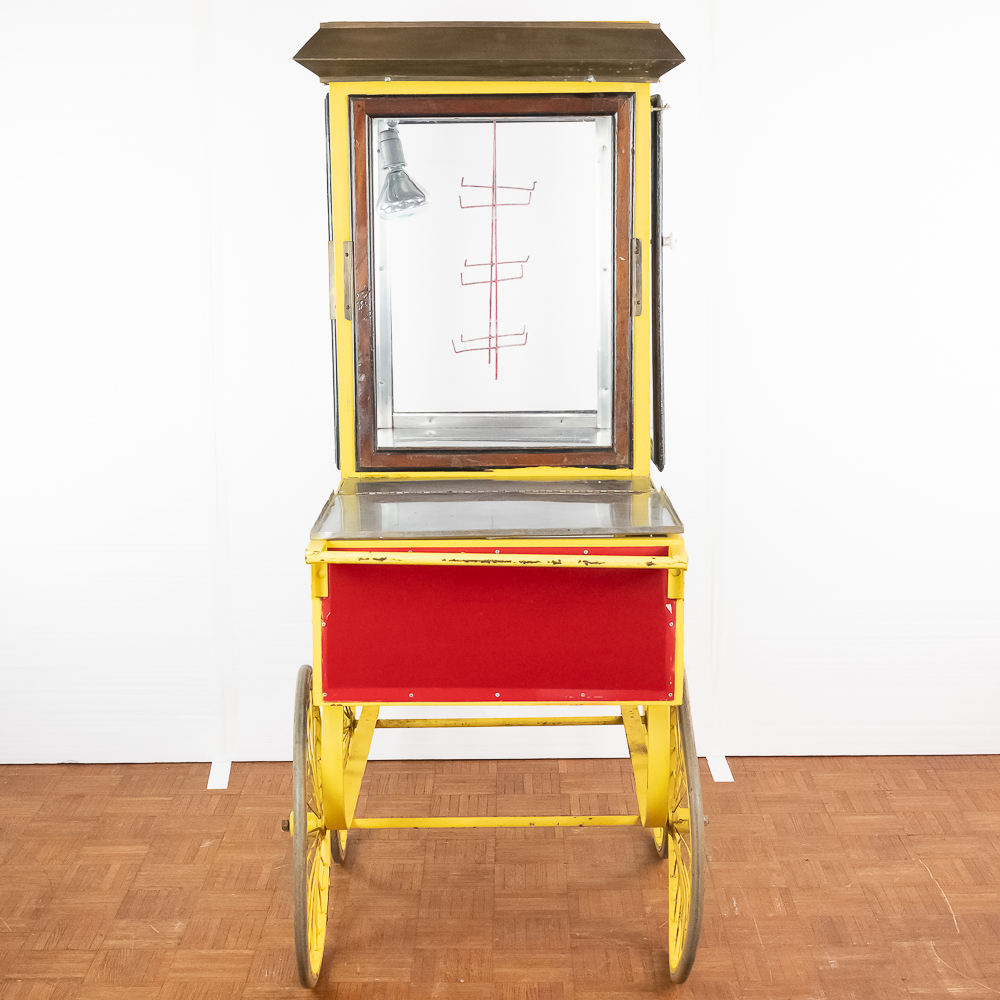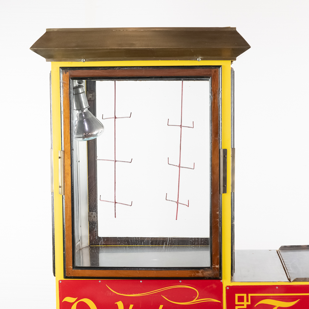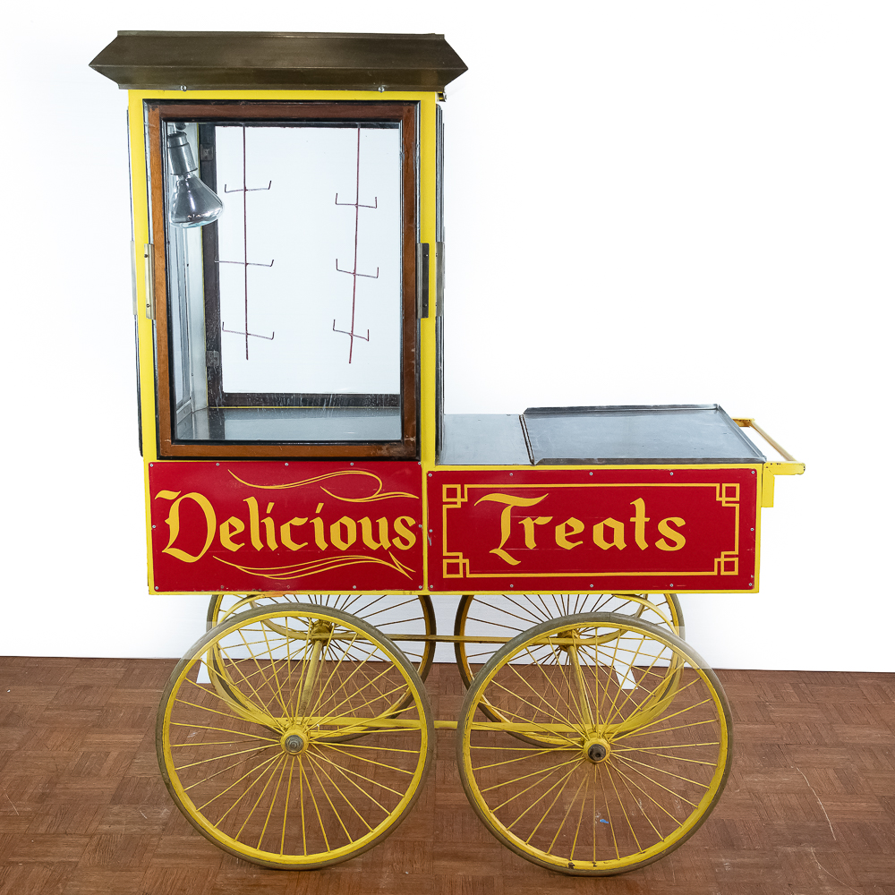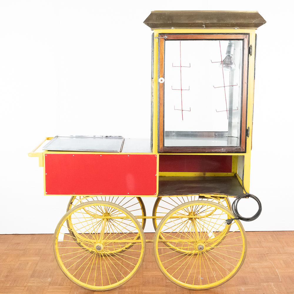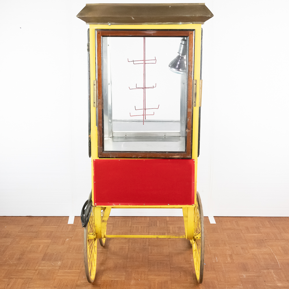 Old time looking push cart made of steel body with a wood and glass product display cabinet. Has buggy style spoked wheels with rubber tires. Display cabinet has a heat lamp and 2 rotating wire hanging racks for pretzels. Back side has covered storage with a stainless steel work space. In overall fair to good usable condition. Measures wide, 69″ tall, 55″ long, 32″