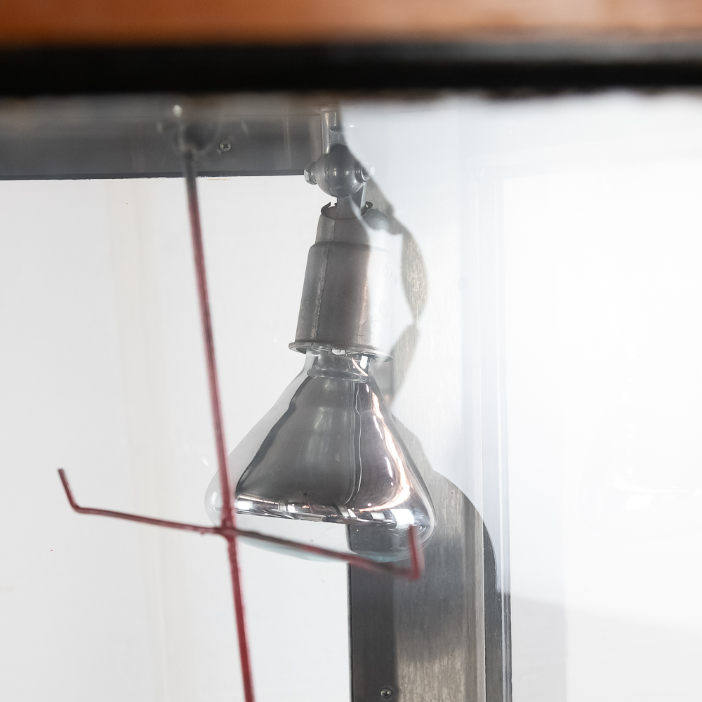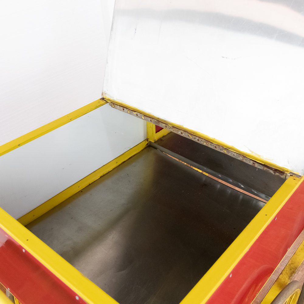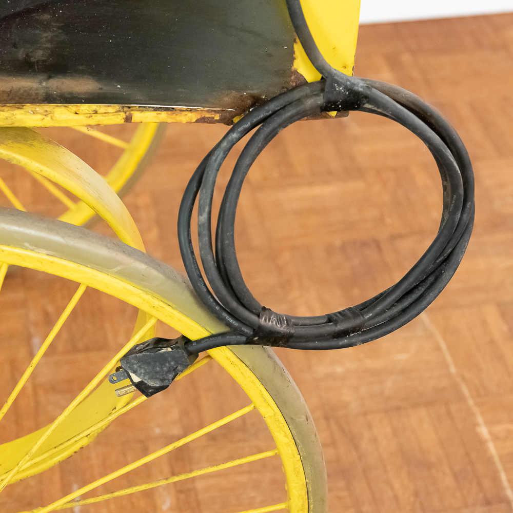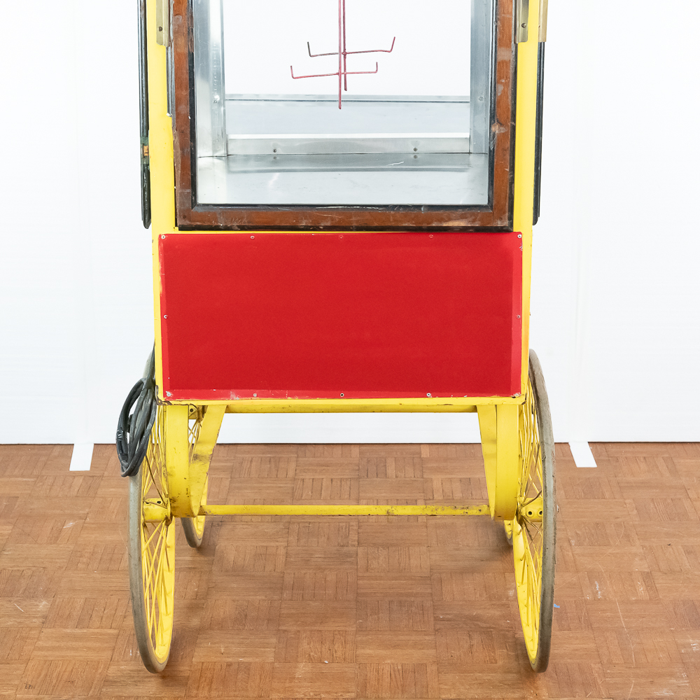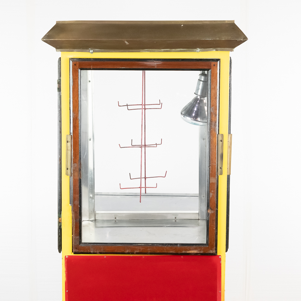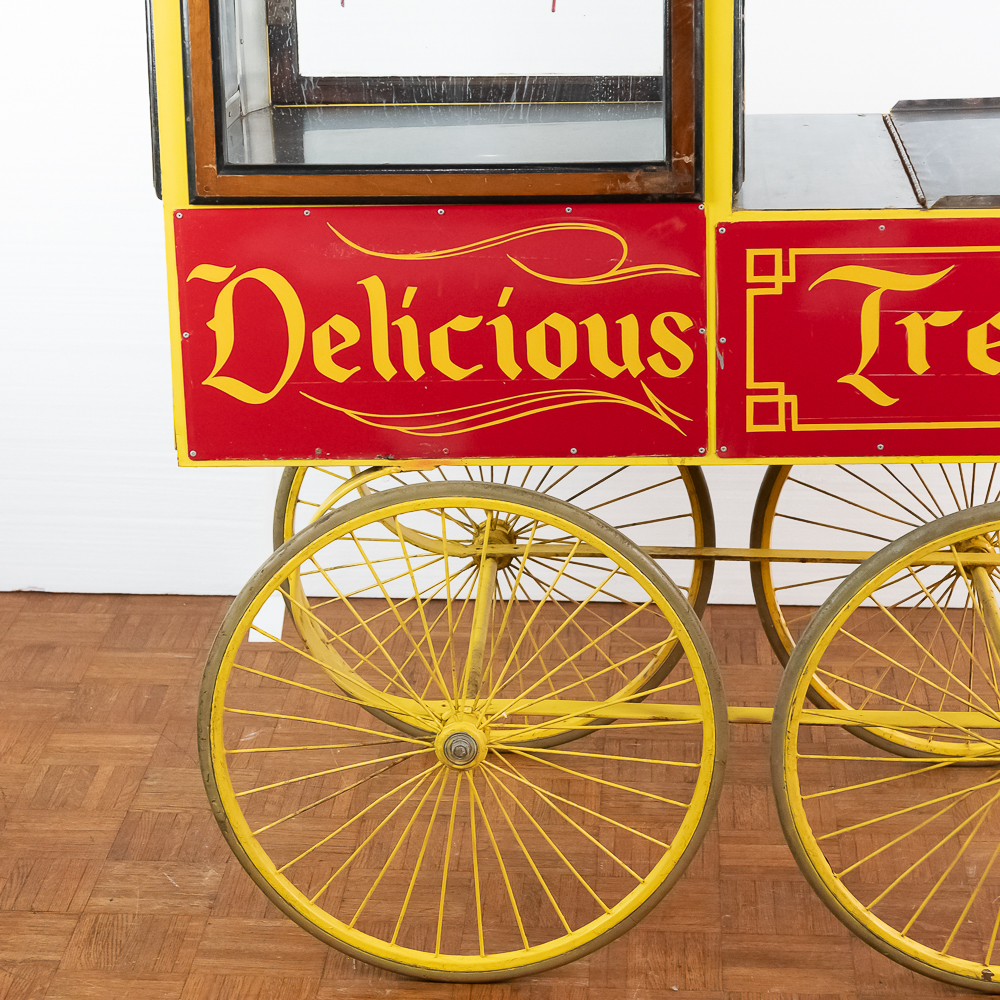 Old time looking push cart made of steel body with a wood and glass product display cabinet. Has buggy style spoked wheels with rubber tires. Display cabinet has a heat lamp and 2 rotating wire hanging racks for pretzels. Back side has covered storage with a stainless steel work space. In overall fair to good usable condition. Measures wide, 69″ tall, 55″ long, 32″