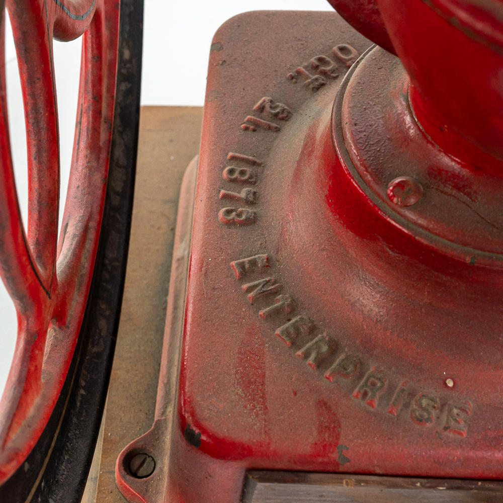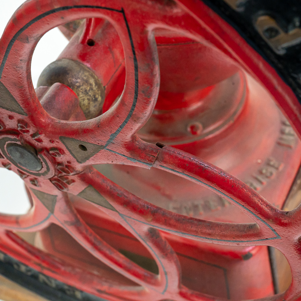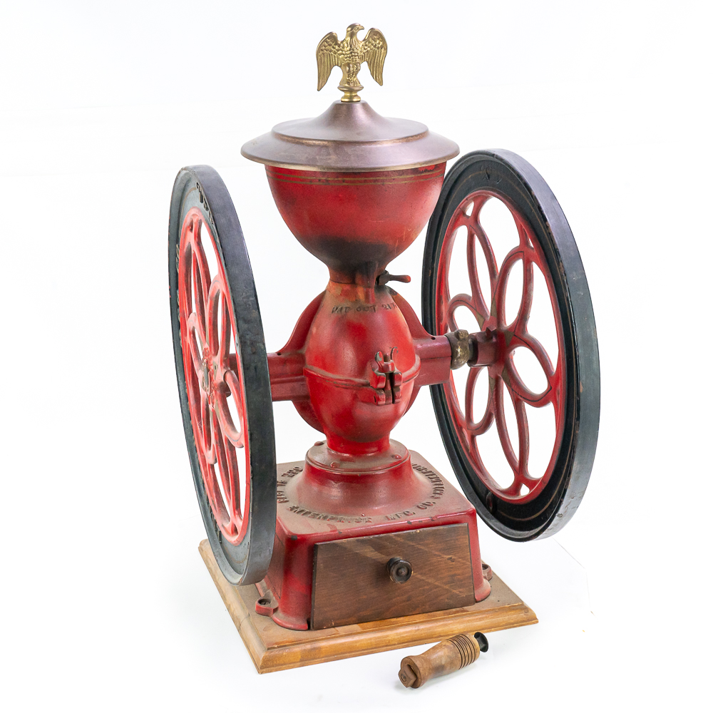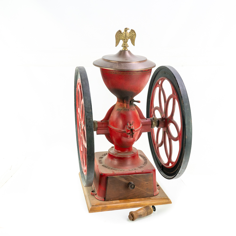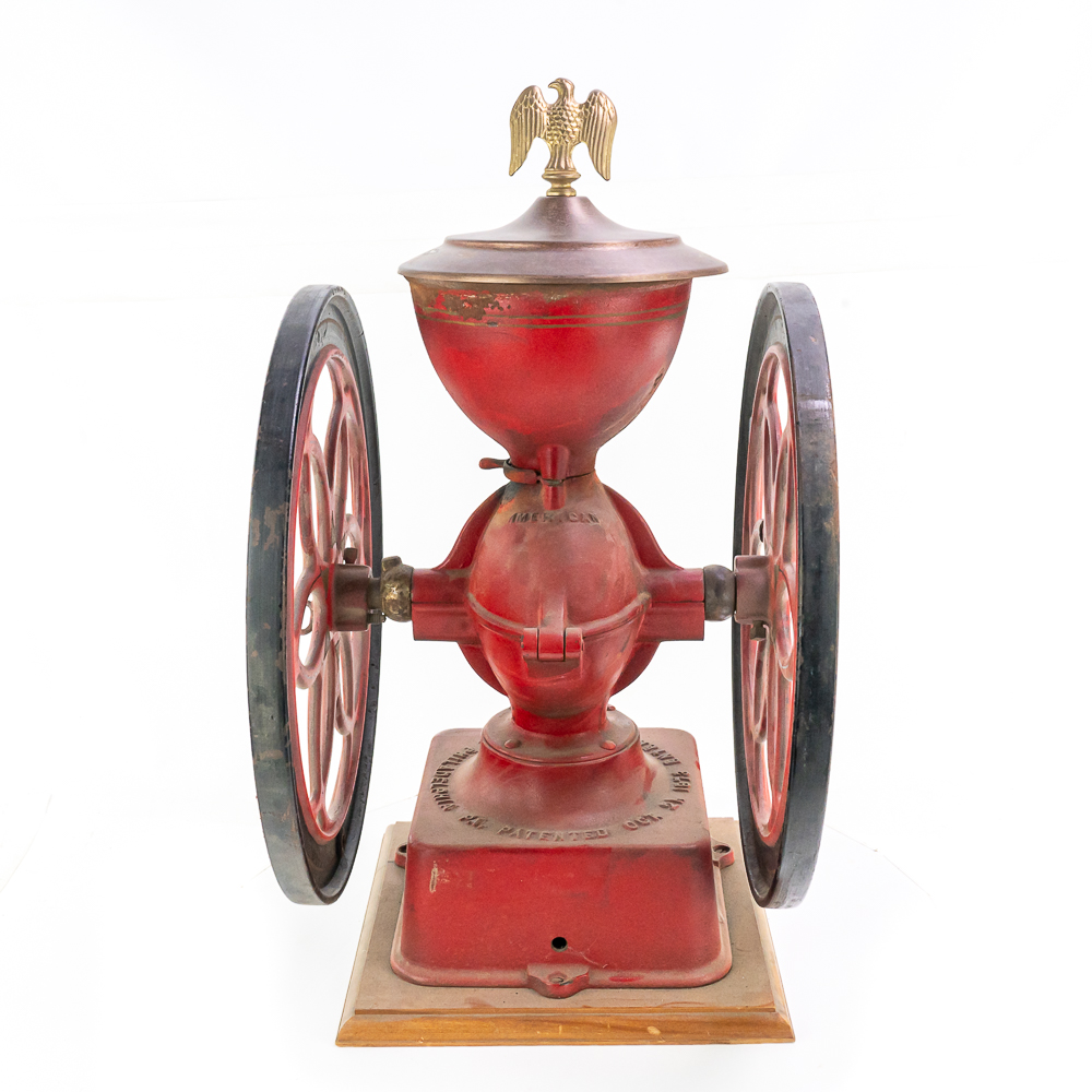 Antique American Philadelphia cast iron double wheeled coffee mill still showcased in original red paint. Approximately 24″t x 13.5″d x 17″l and in good overall condition with some age and wear marks noted including scuffs and discoloration in areas. Perfect addition to your home, please use photos to judge condition and bid accordingly.