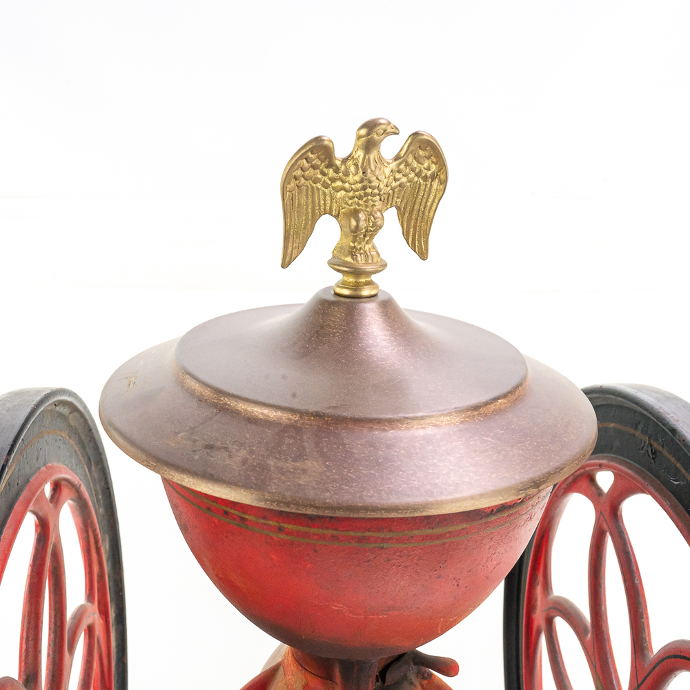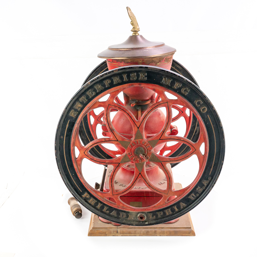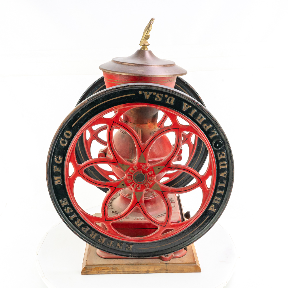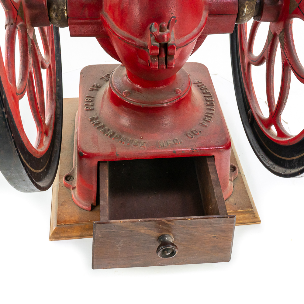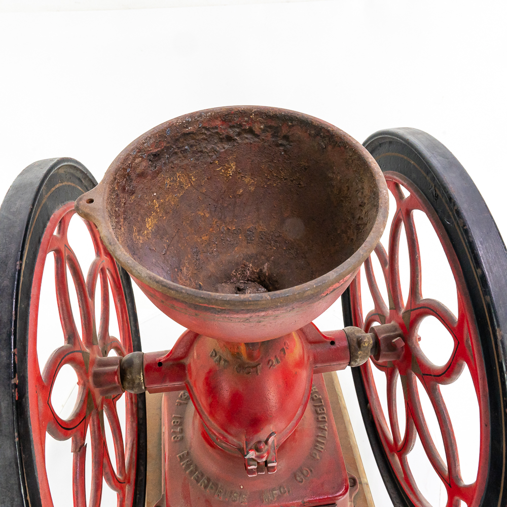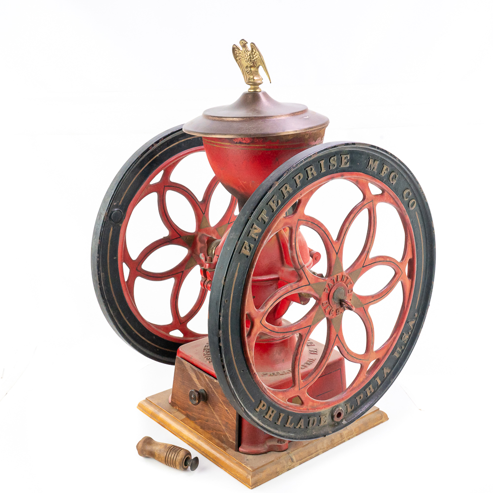 Antique American Philadelphia cast iron double wheeled coffee mill still showcased in original red paint. Approximately 24″t x 13.5″d x 17″l and in good overall condition with some age and wear marks noted including scuffs and discoloration in areas. Perfect addition to your home, please use photos to judge condition and bid accordingly.