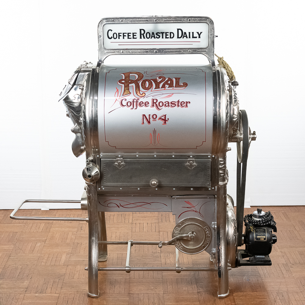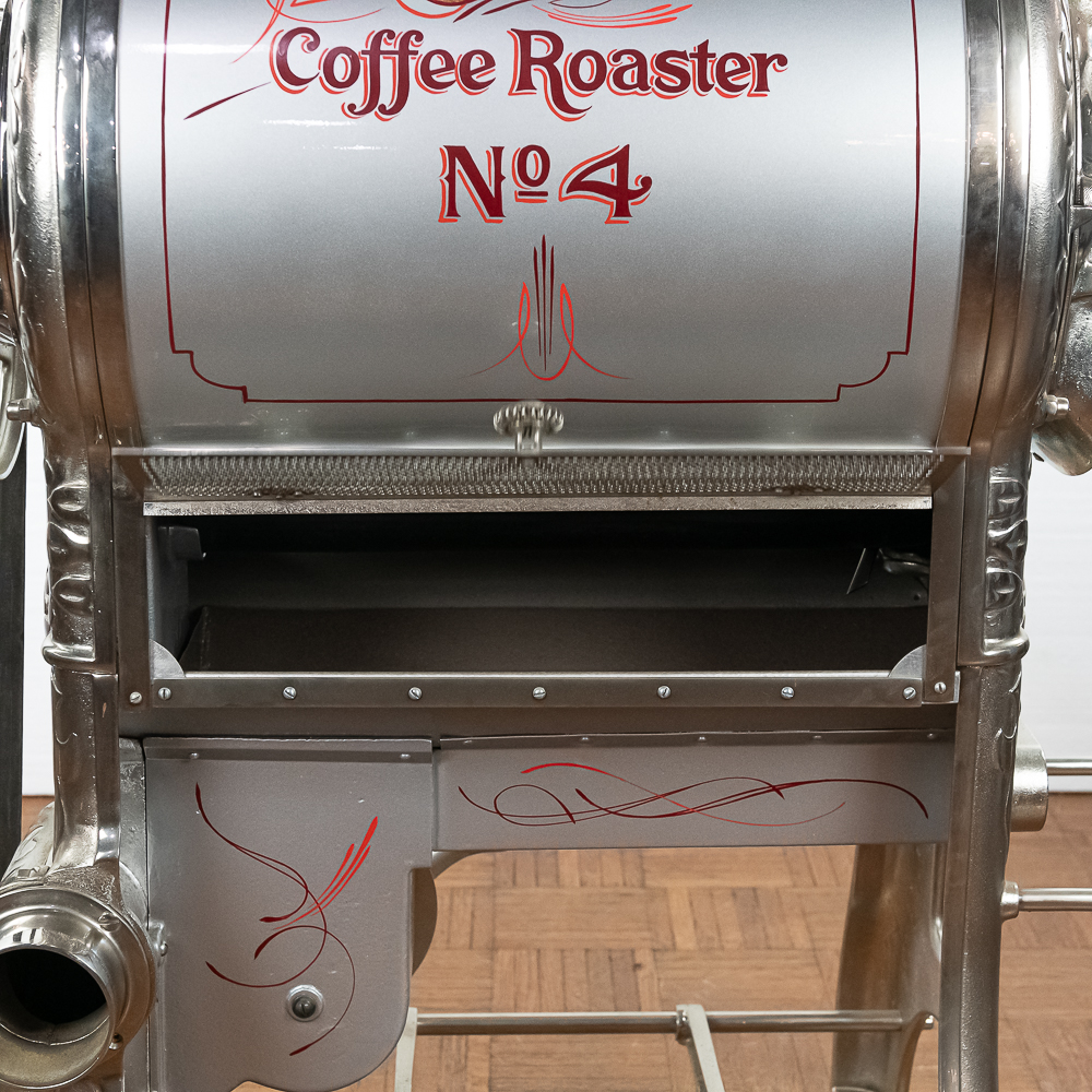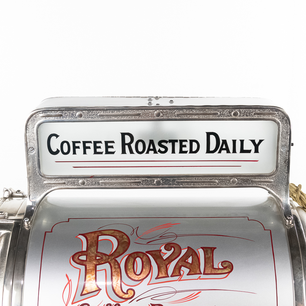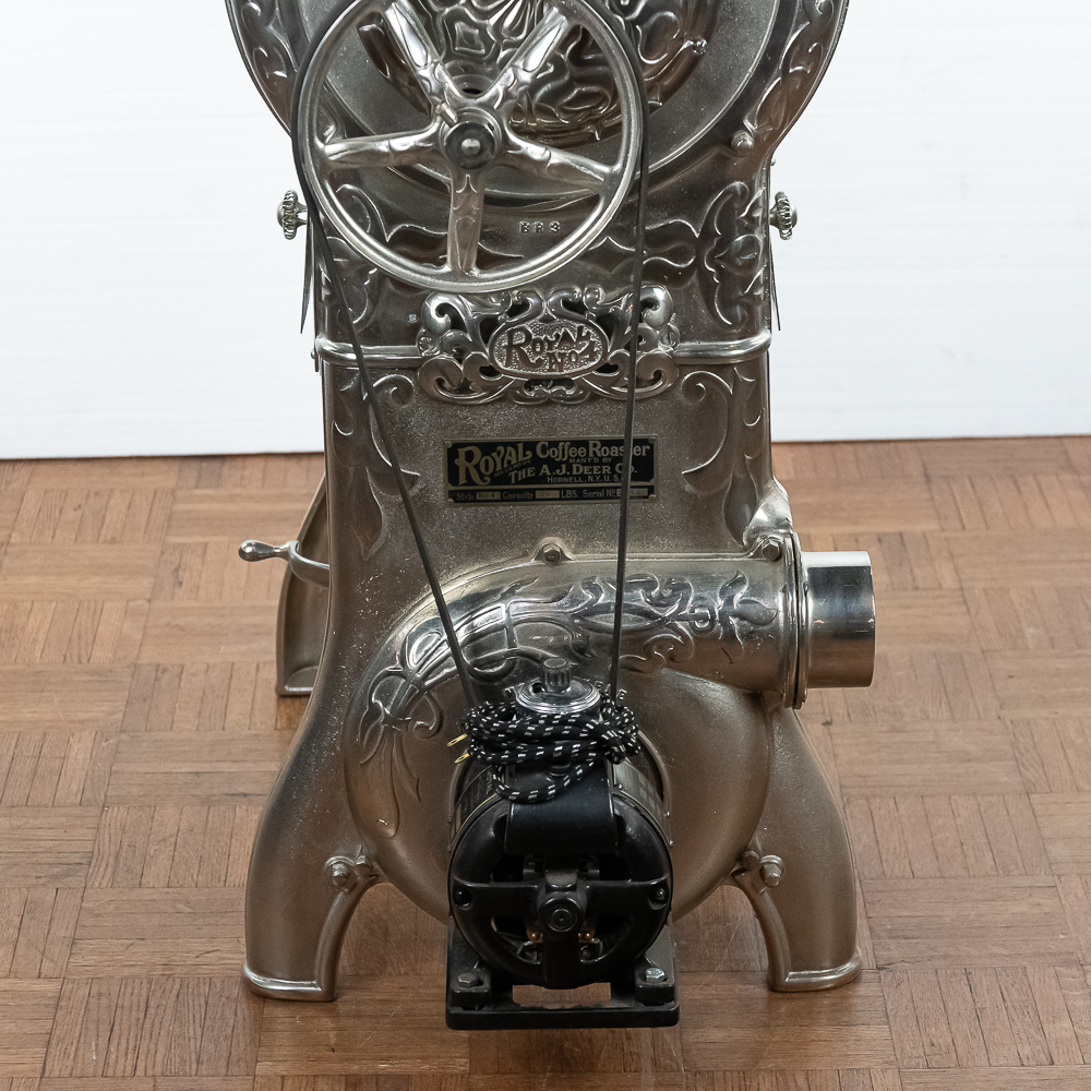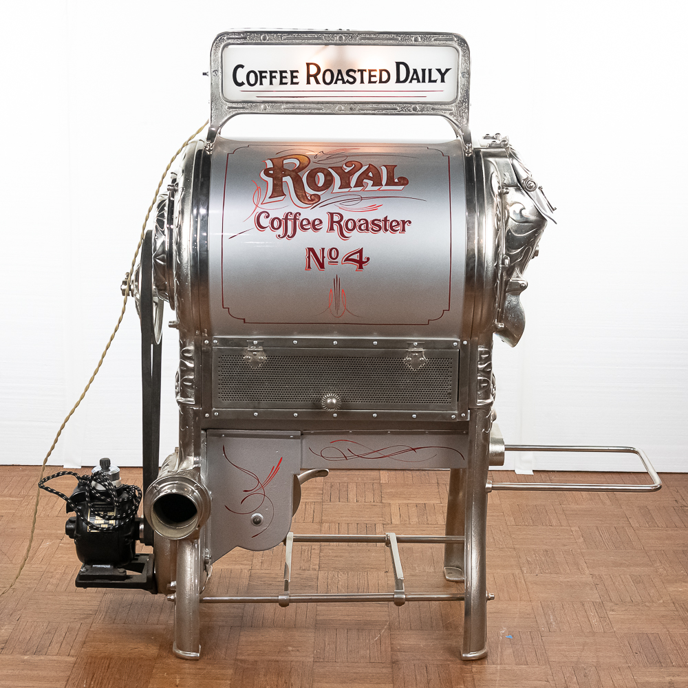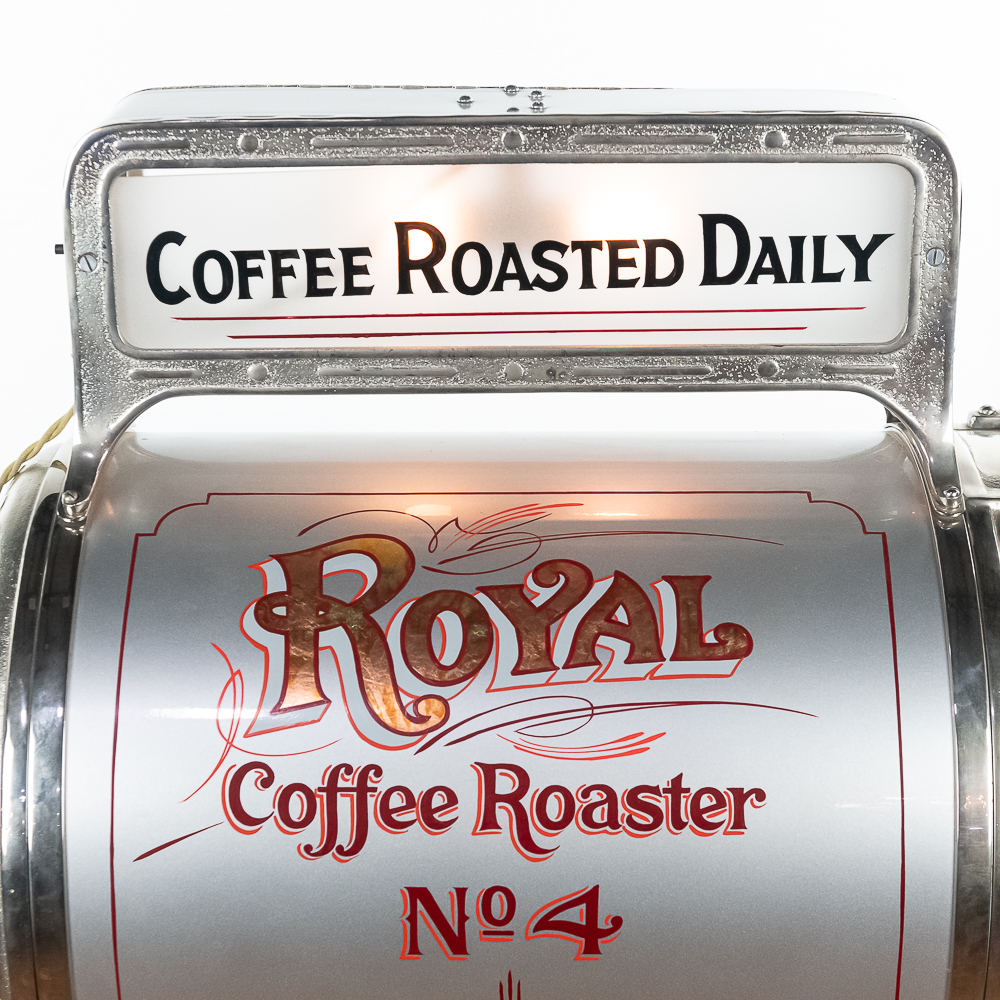 Manufactured by the A.J. Deer Co. of Hornell, New York this Royal No. 4 Coffee Roaster has undergone meticulous restoration with great attention to detail. All decorative cast iron parts have been re nickeled, the cast iron frame and sheet metal have been repainted and professionally pinstriped and lettered. It has the rare double sided lighted top sign that reads, “Coffee Roasted Daily”. Correct Royal 110 volt motor with correct power cord. The gas burners for roasting are intact and ready to use. This roaster is truly a show piece for your collection or as a focal point in your coffee shop. Measures 47″ tall, 36″ long, 18″ wide.