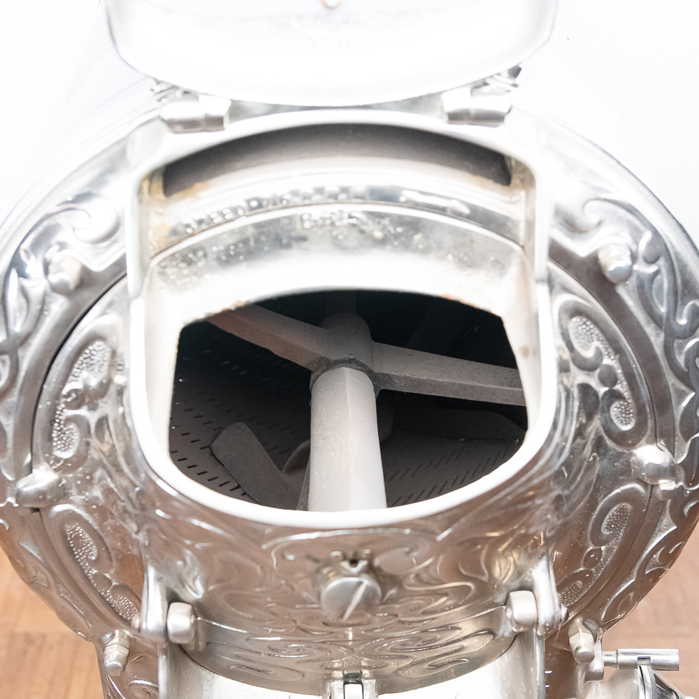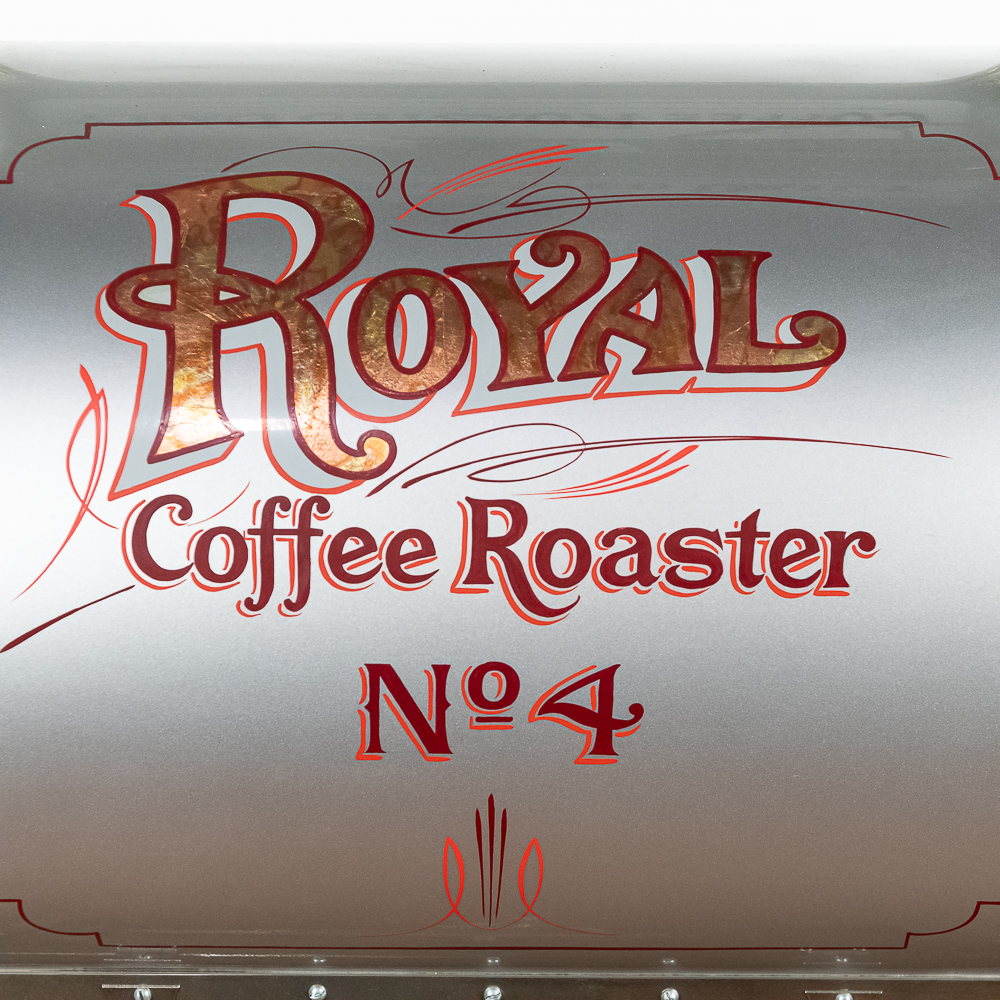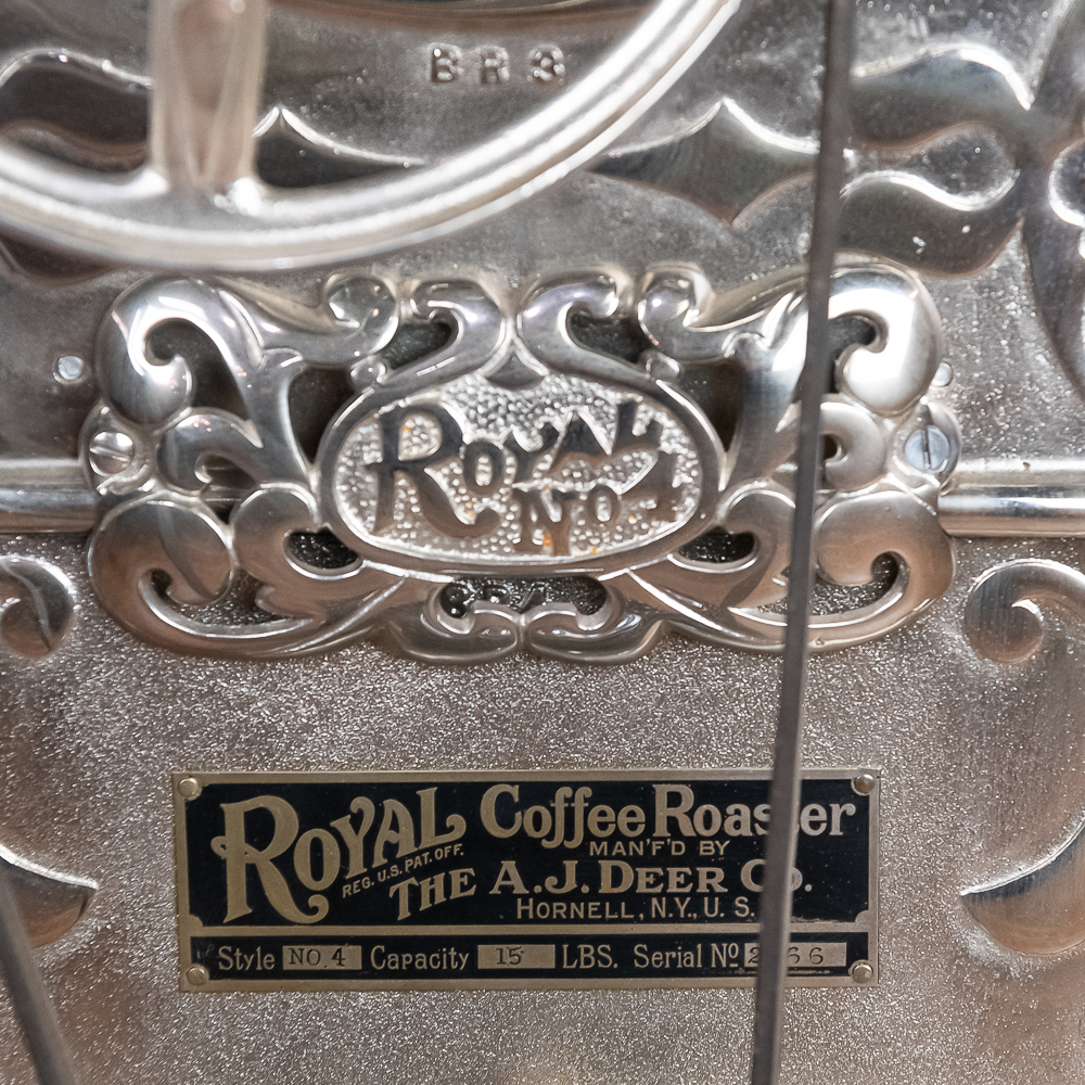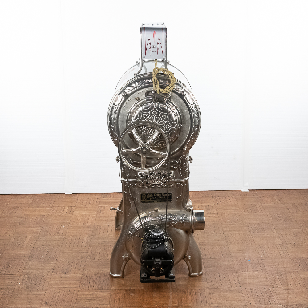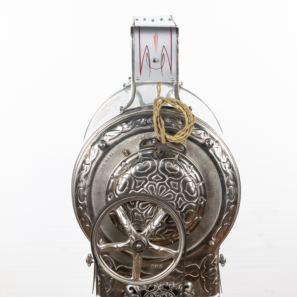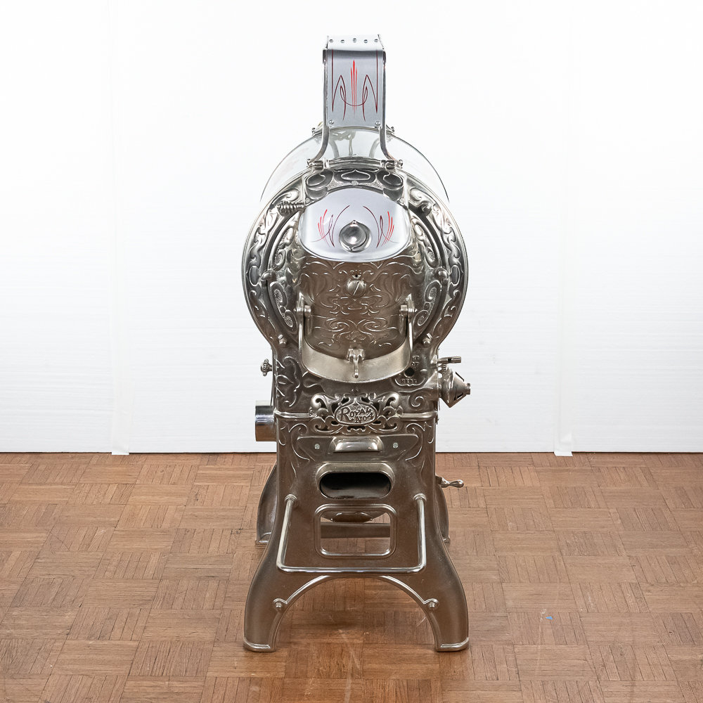 Manufactured by the A.J. Deer Co. of Hornell, New York this Royal No. 4 Coffee Roaster has undergone meticulous restoration with great attention to detail. All decorative cast iron parts have been re nickeled, the cast iron frame and sheet metal have been repainted and professionally pinstriped and lettered. It has the rare double sided lighted top sign that reads, “Coffee Roasted Daily”. Correct Royal 110 volt motor with correct power cord. The gas burners for roasting are intact and ready to use. This roaster is truly a show piece for your collection or as a focal point in your coffee shop. Measures 47″ tall, 36″ long, 18″ wide.