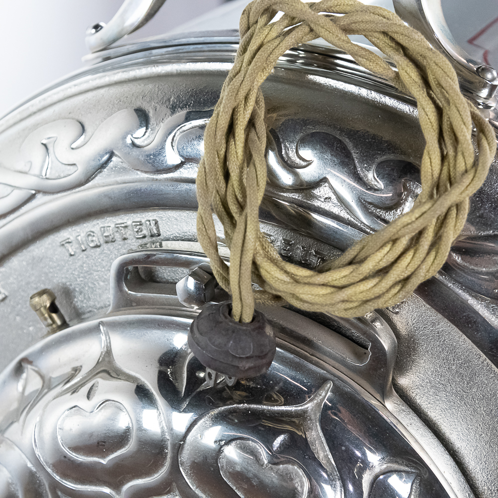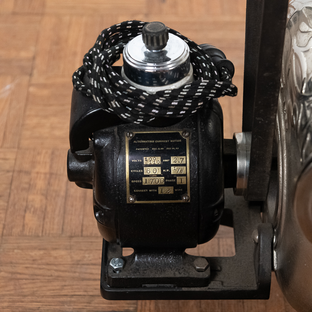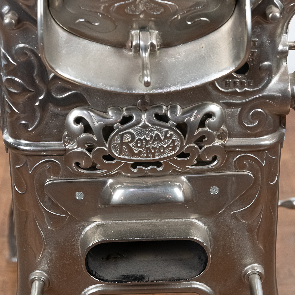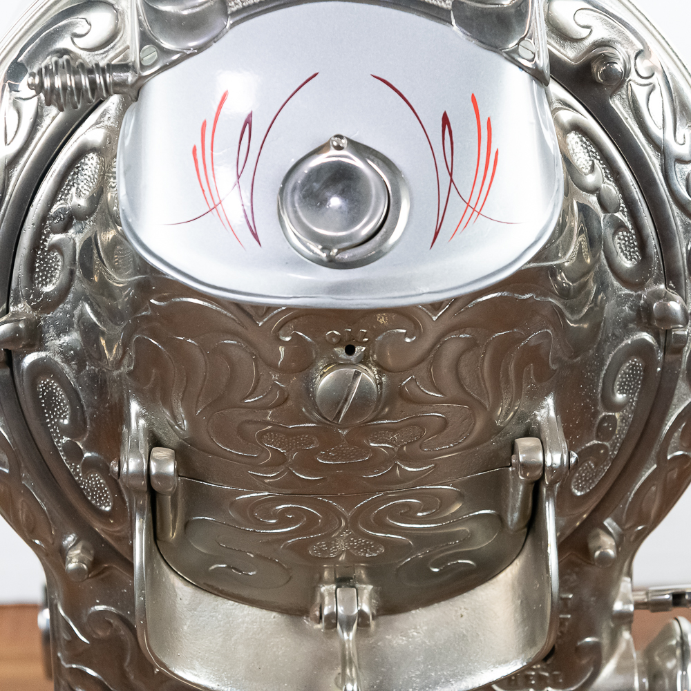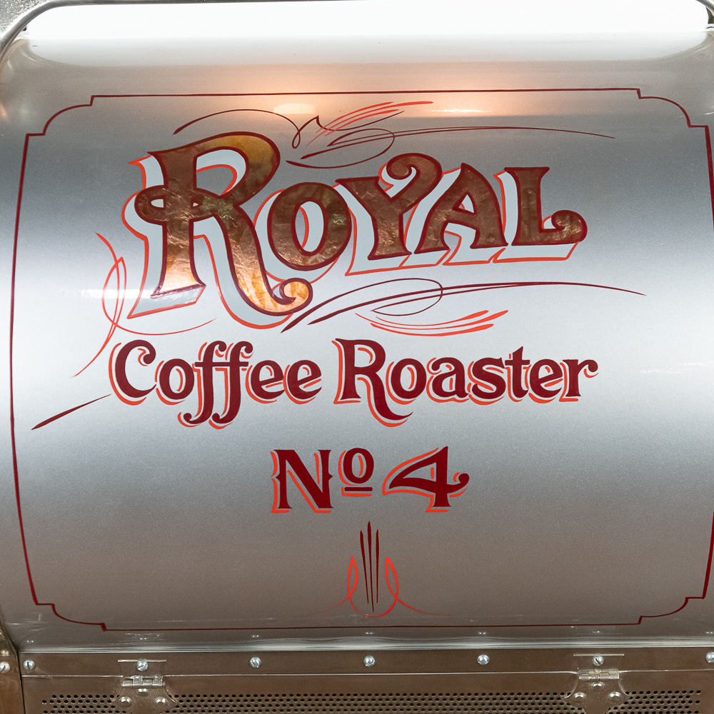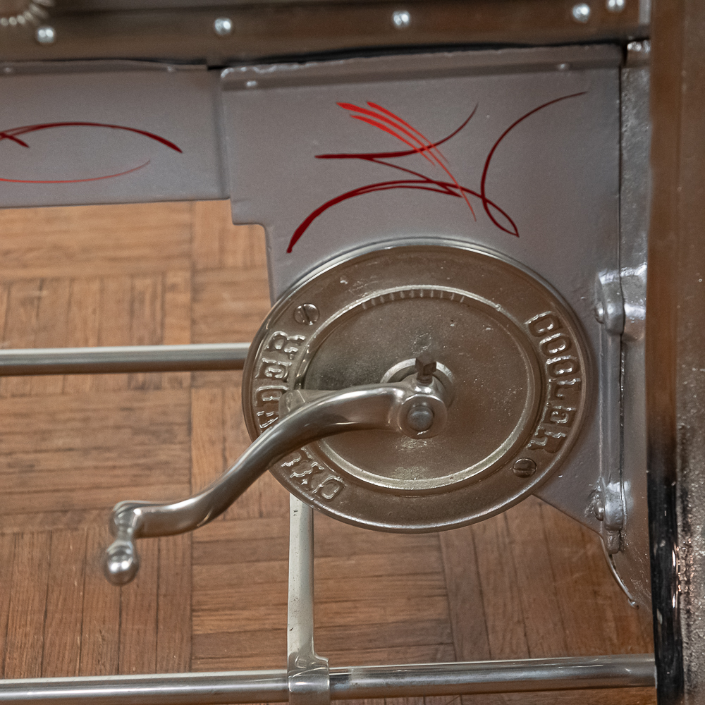 Manufactured by the A.J. Deer Co. of Hornell, New York this Royal No. 4 Coffee Roaster has undergone meticulous restoration with great attention to detail. All decorative cast iron parts have been re nickeled, the cast iron frame and sheet metal have been repainted and professionally pinstriped and lettered. It has the rare double sided lighted top sign that reads, “Coffee Roasted Daily”. Correct Royal 110 volt motor with correct power cord. The gas burners for roasting are intact and ready to use. This roaster is truly a show piece for your collection or as a focal point in your coffee shop. Measures 47″ tall, 36″ long, 18″ wide.