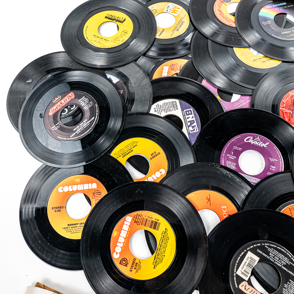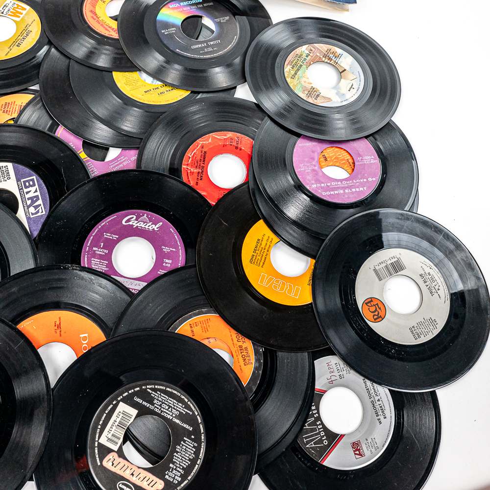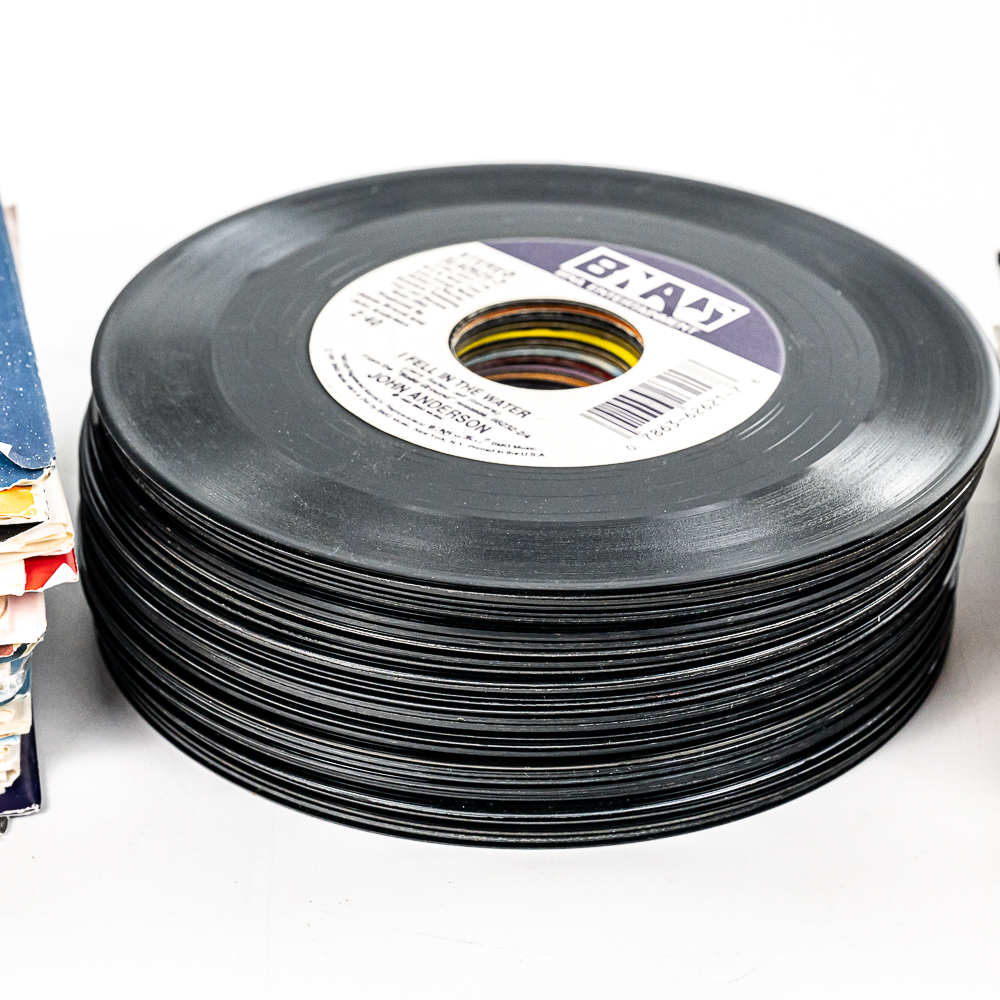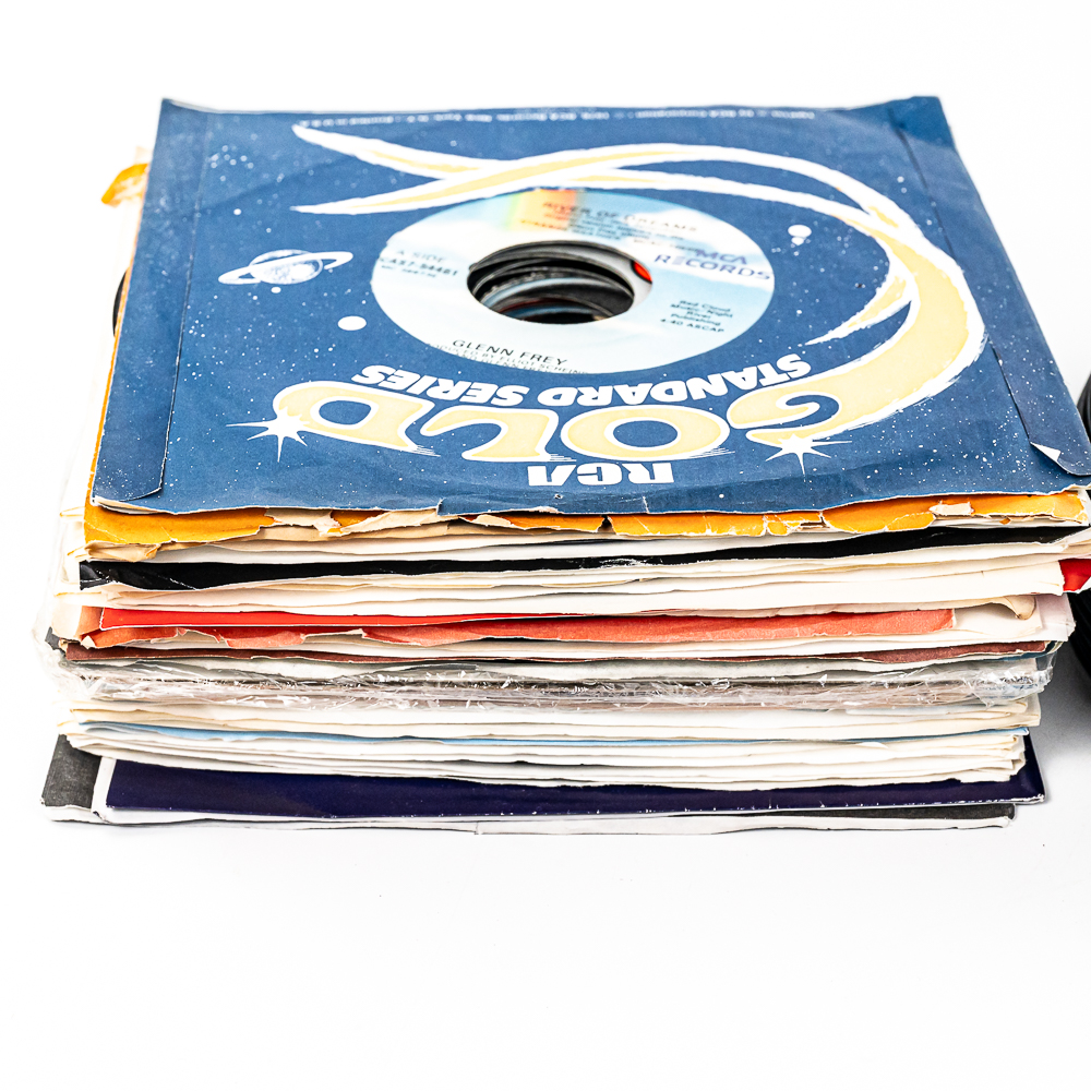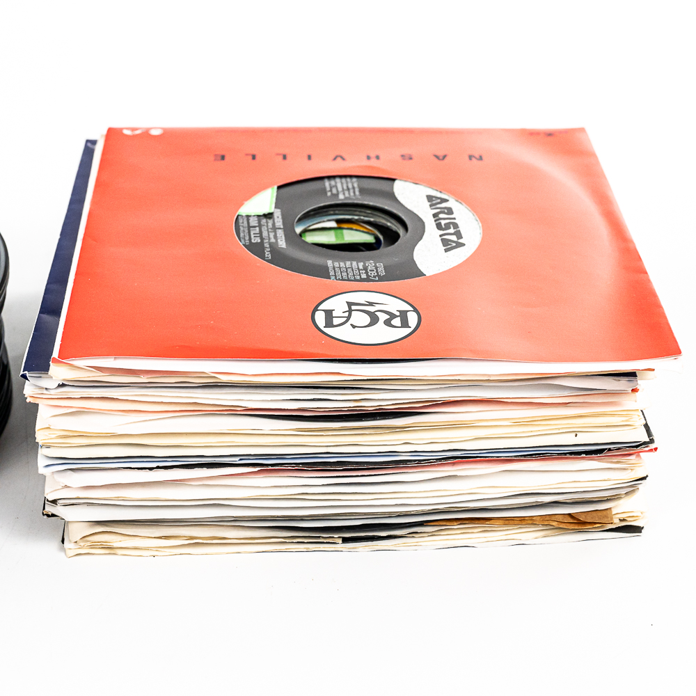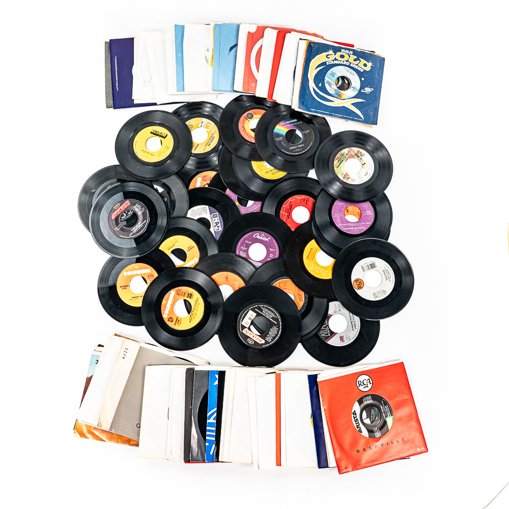 Collection of (100) assorted unpicked vintage 45 RPM records with titles such as Keep The Faith Bon Jovi, My Father’s House Kenny Loggins, Just Take My Heart Mr Big, Thorn in my Side The Black Crows, Cheap Whisky Martina McBride, and many others. Some possibly picked from a jukebox. Perfect addition to your collection, please use photos to judge condition and bid accordingly.