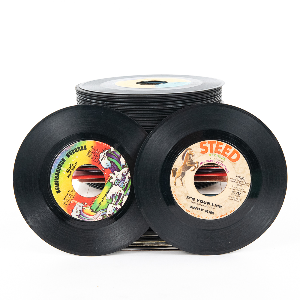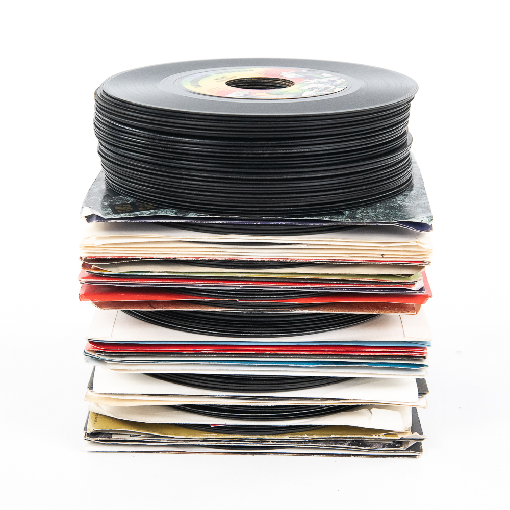 Collection of (100) assorted vintage 45 RPM records with titles such as She Talks to Angels The Black Crows, Better Days Bruce Springsteen, Do It To Me Lionel Richie, Money & Fame The Scorpions and many others. Some possibly picked from a jukebox. Perfect addition to your collection, please use photos to judge condition and bid accordingly.