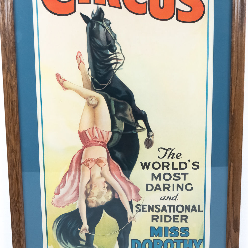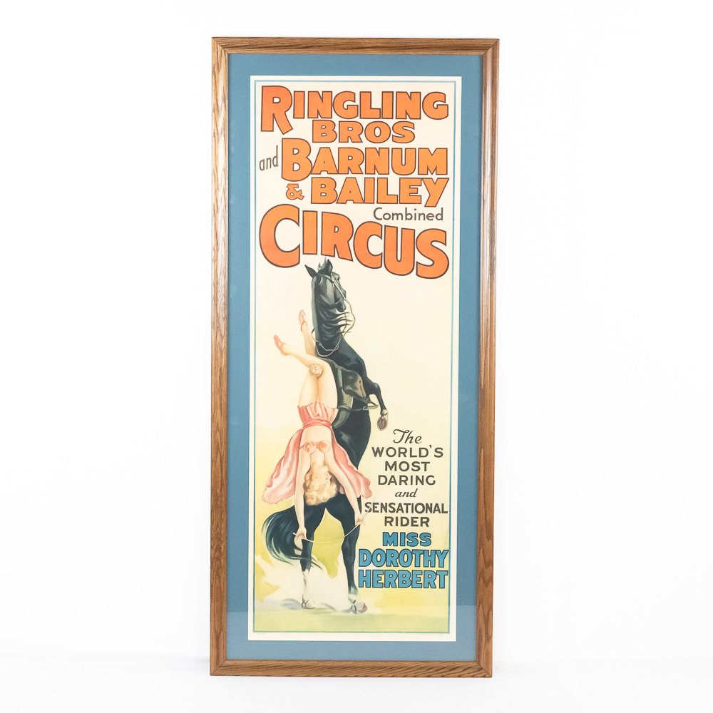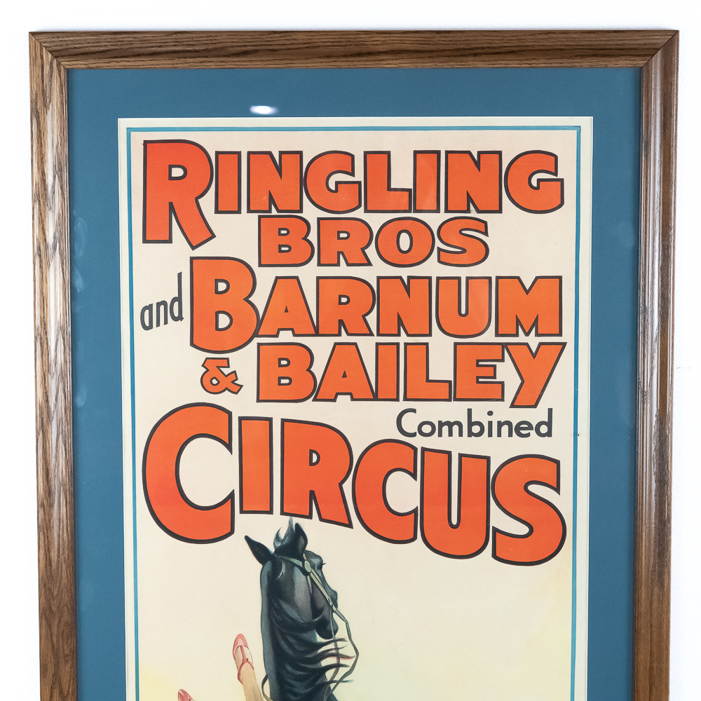 Vintage Ringling Brothers and Barnum & Bailey combined Circus framed circus poster. Very good overall condition; professionally framed and matted approximately 60″t x 27″l. “LITHO in USA” “ERIE LITHO & PTG ERIE PA 41-432-5” along bottom edge. Bright vivid color; presents extremely well. Perfect addition to your home or office, please use photos to judge condition and bid accordingly.