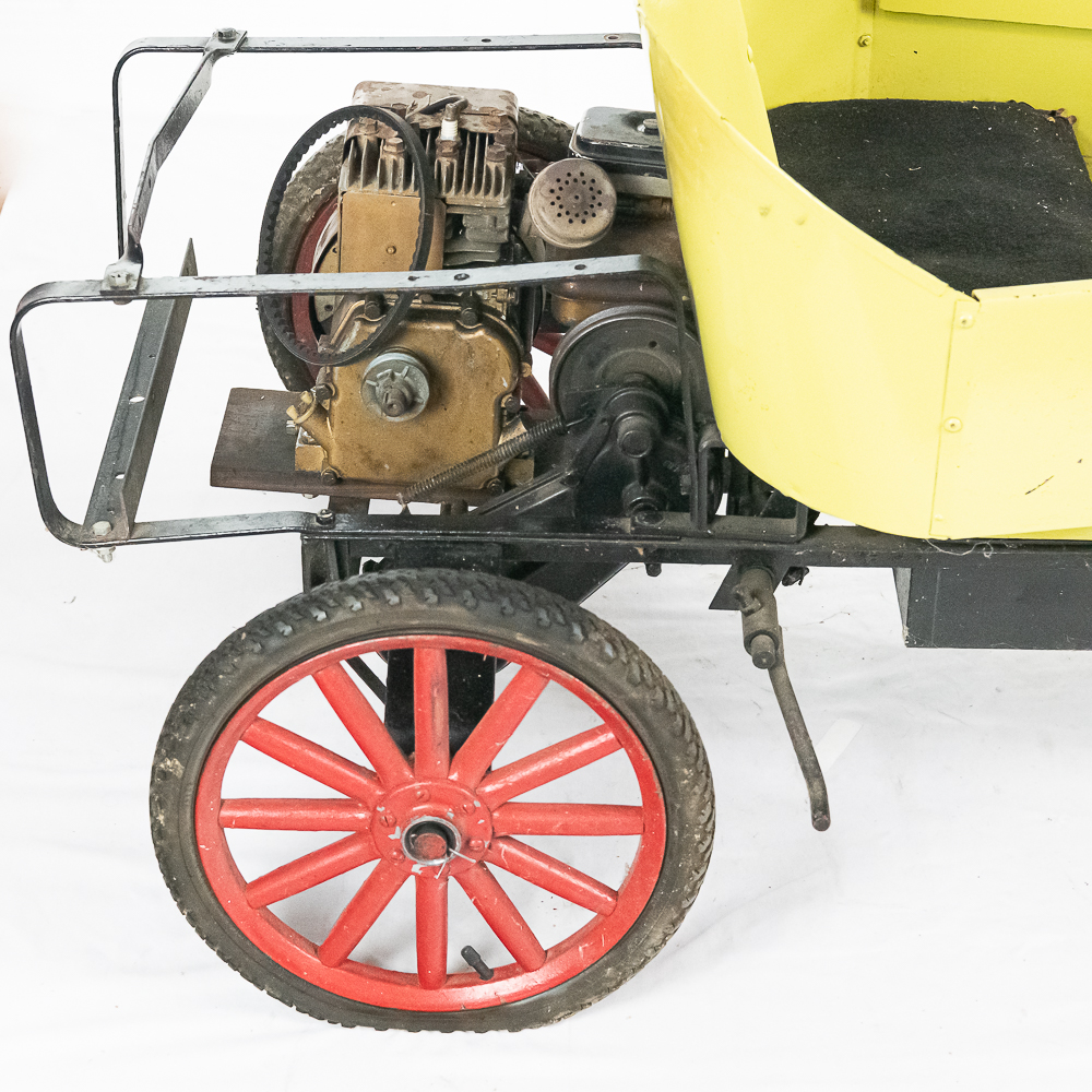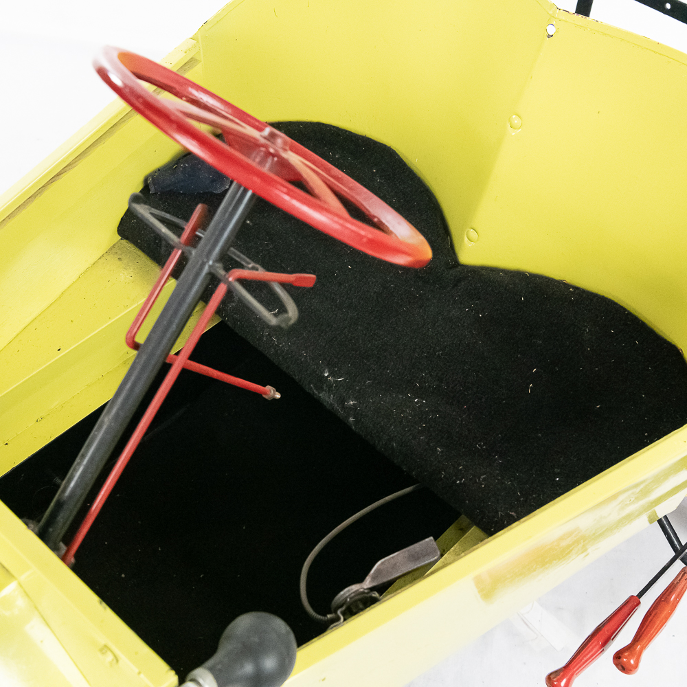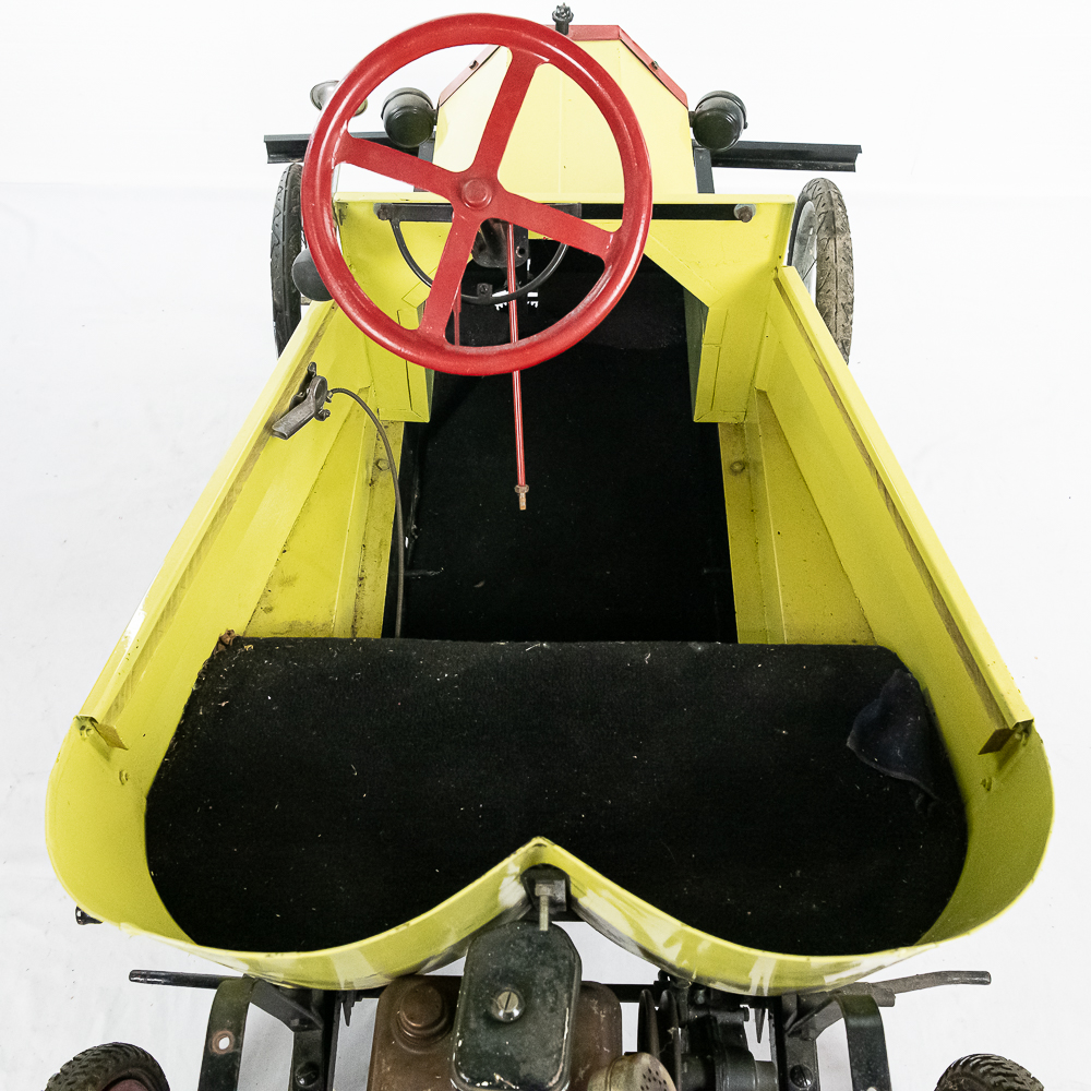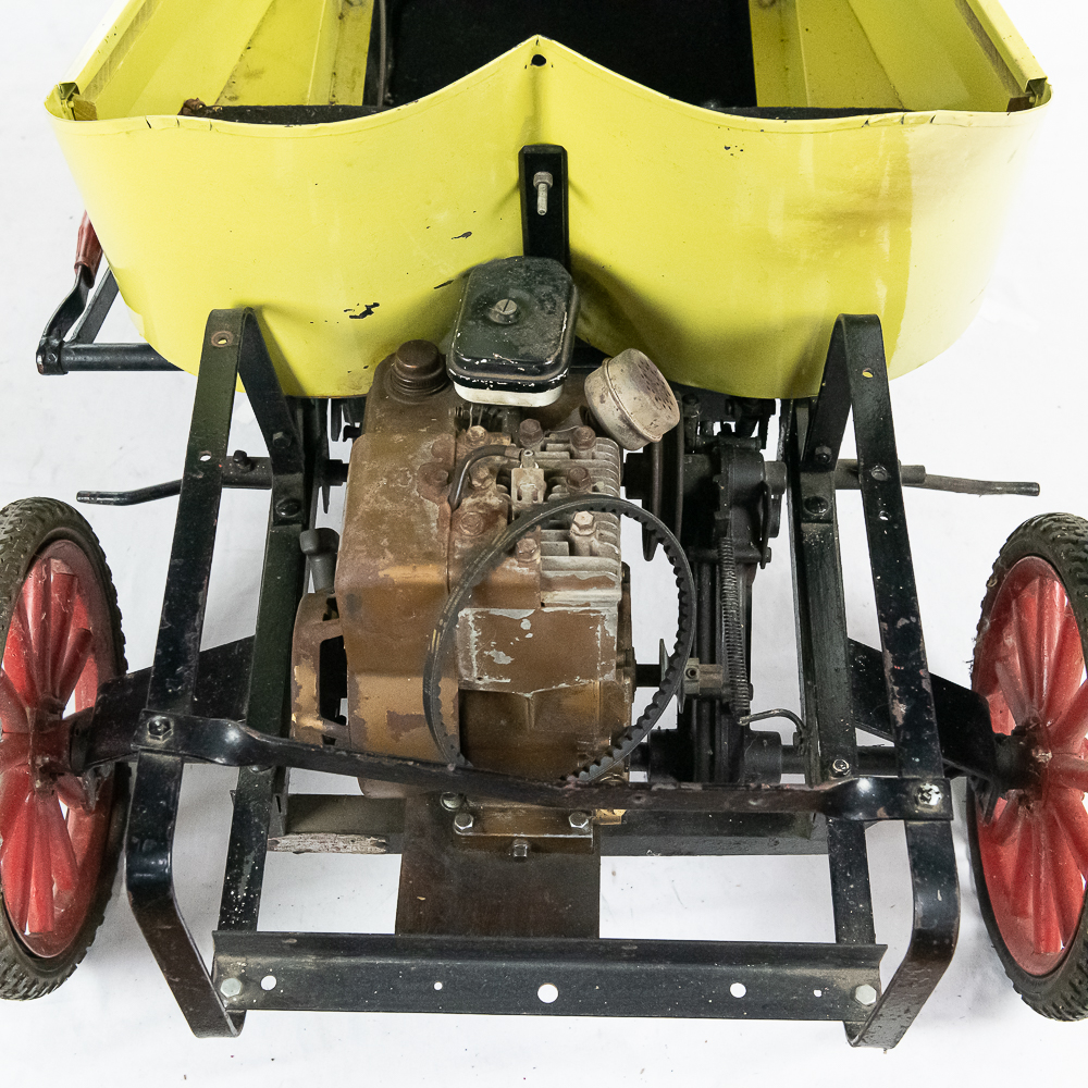 Kid size go kart mfg’d by McDonough Power Equipment in Georgia circa 1962. Serial number is 9,490. These were made to look like a Model T roadster. All steel frame and body with direct steering powered by a 2 HP Briggs & Stratton gas engine. The engine is pull start and turns over easily but has not been started. It rides on 14″ bicycle balloon tires. The engine speed is controlled by a lever / cable mounted on the drivers side as well as a motor engage lever and a friction brake lever also on the drivers side. In overall VG condition with no rust and good paint. Seats 2 children. Measures 72″ long, 36″ wide, 36″ tall to the top of the steering wheel.