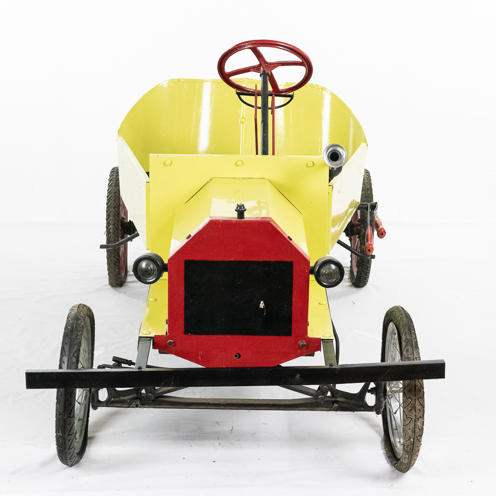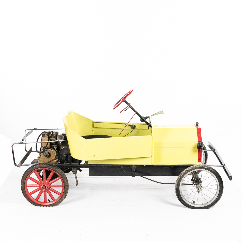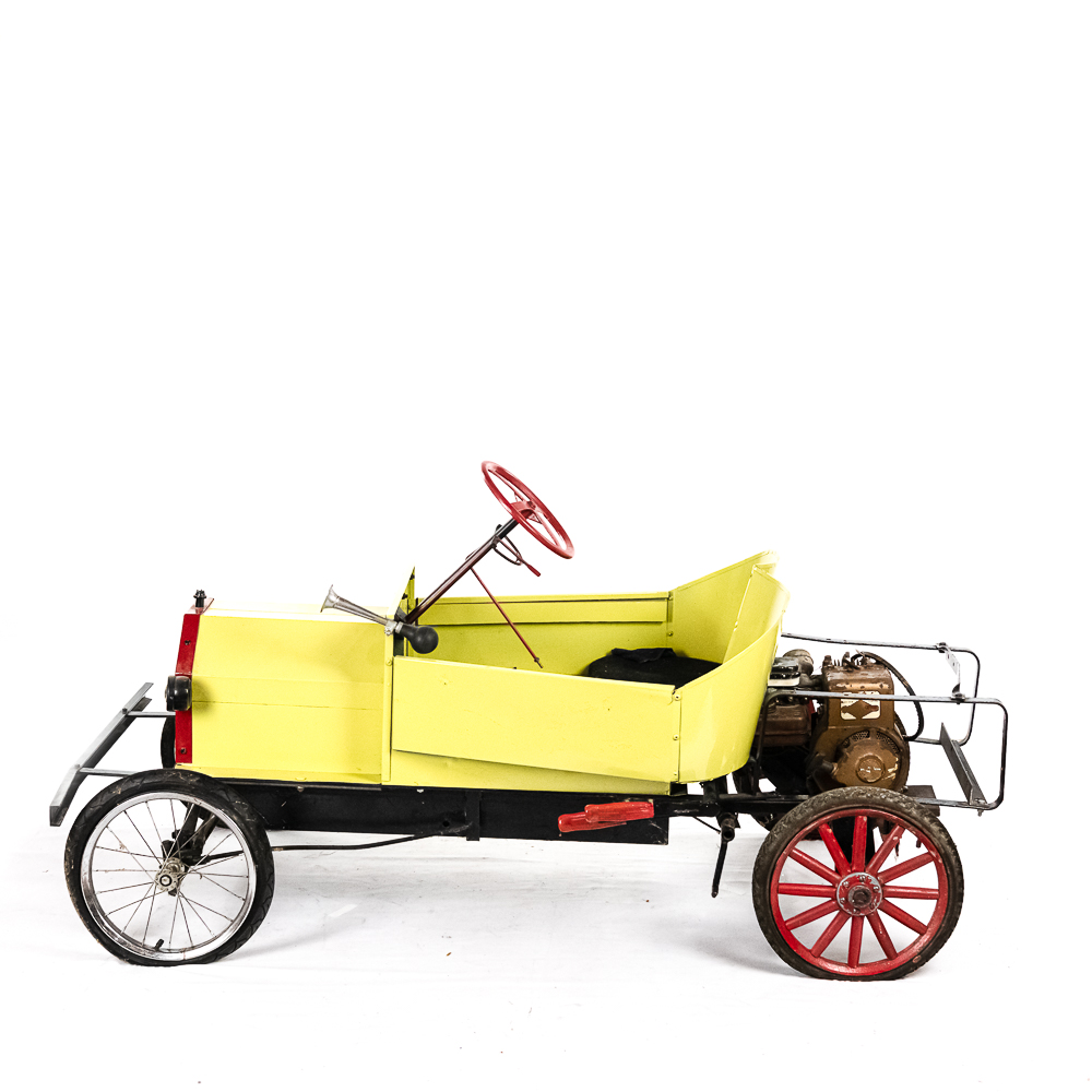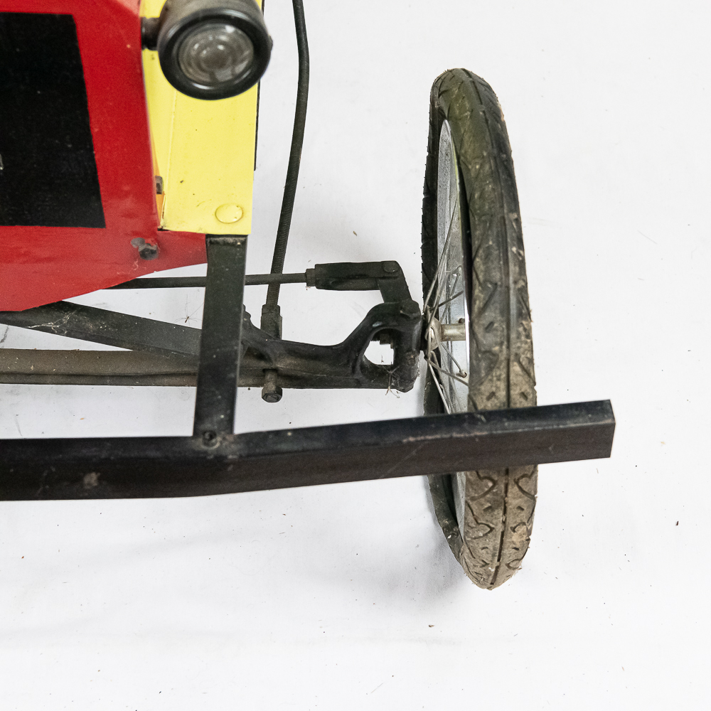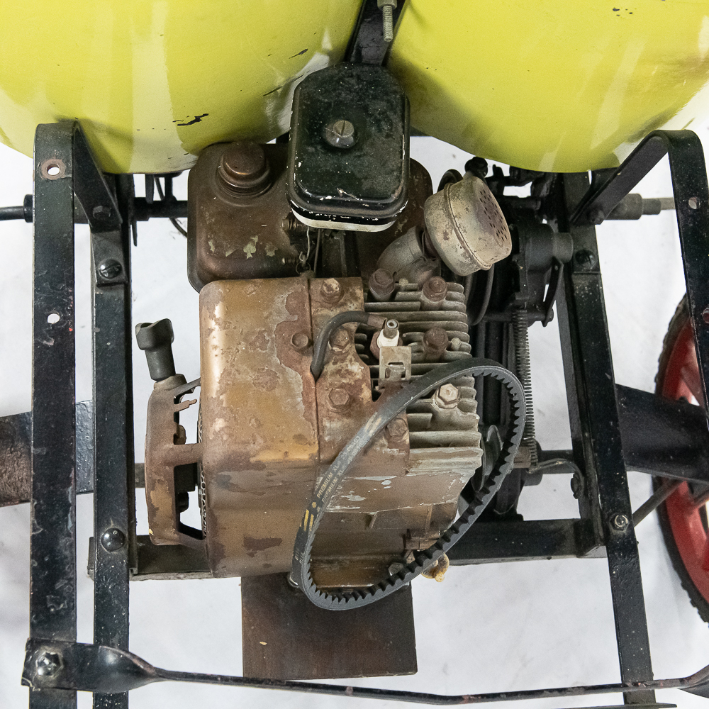 Kid size go kart mfg’d by McDonough Power Equipment in Georgia circa 1962. Serial number is 9,490. These were made to look like a Model T roadster. All steel frame and body with direct steering powered by a 2 HP Briggs & Stratton gas engine. The engine is pull start and turns over easily but has not been started. It rides on 14″ bicycle balloon tires. The engine speed is controlled by a lever / cable mounted on the drivers side as well as a motor engage lever and a friction brake lever also on the drivers side. In overall VG condition with no rust and good paint. Seats 2 children. Measures 72″ long, 36″ wide, 36″ tall to the top of the steering wheel.